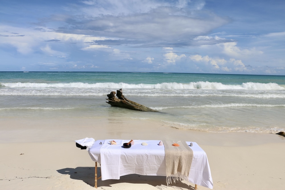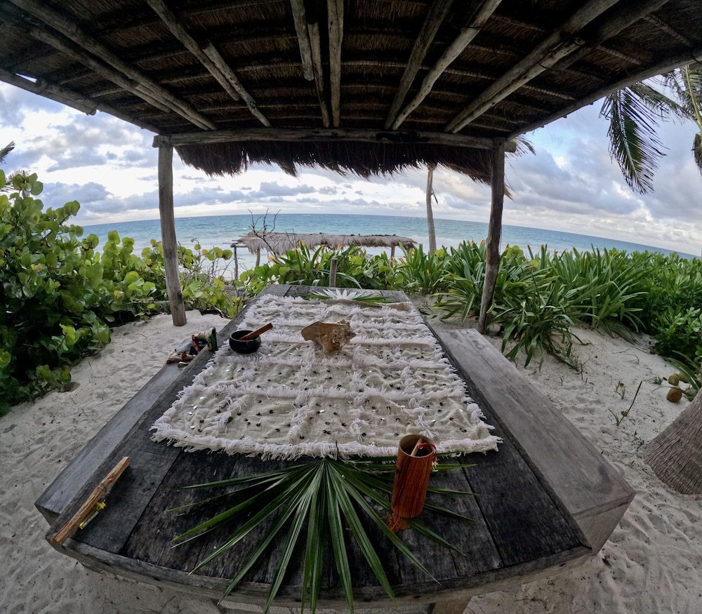 The place is magical. It is located in the raw un-touched part of Tulum. INSIDE the Sian Kaan natural reserve. Small restaurant with a bar and a beautiful beach with sun-beds.