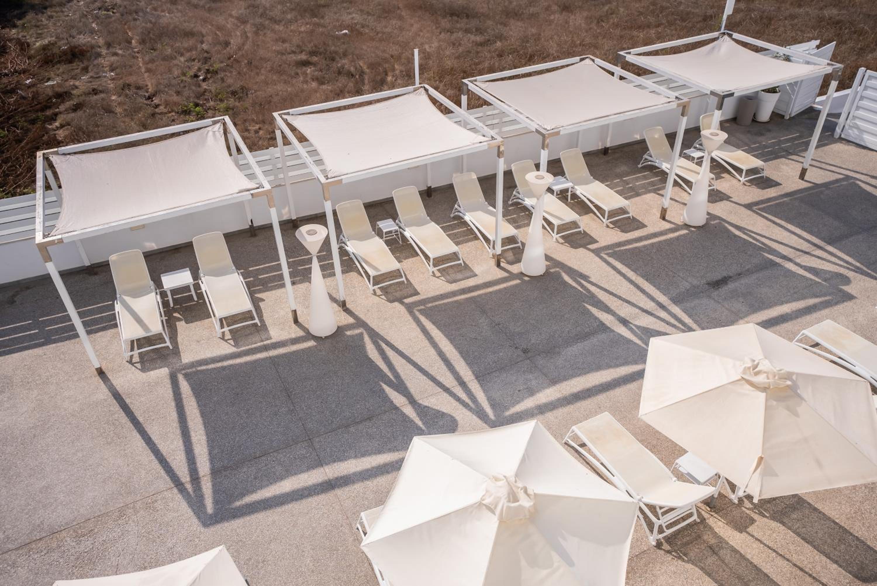 Unwind in Style: Liquid Hotel Apartments offers a free-form pool, sun terrace, and poolside snack bar for the ultimate relaxation experience. The apartments, adorned in chic white, orange, and light blue tones, boast balconies with scenic views.