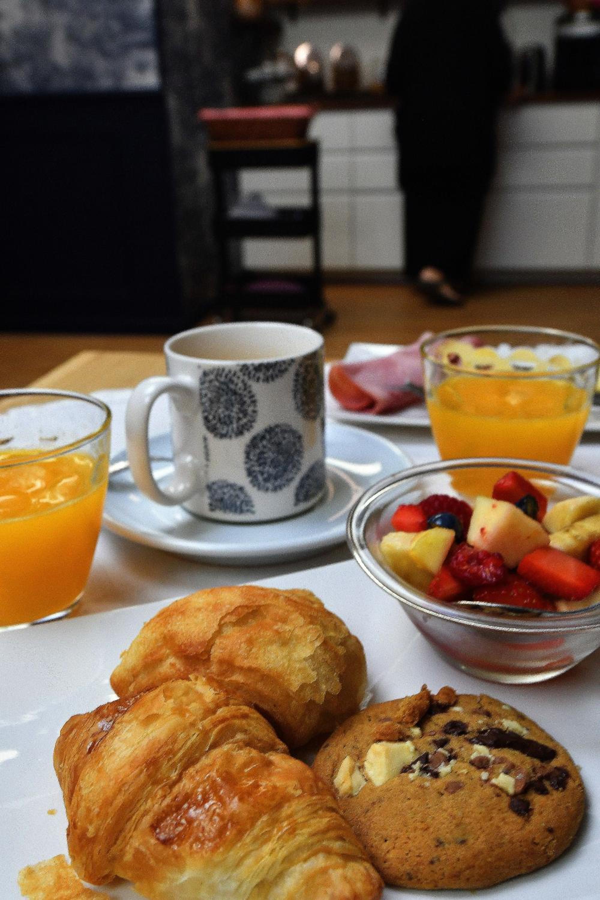 Fruits, crêpes, différentes boissons, Nocciolata, miel, confiture, charcuterie, équivalents de croissants - pains suisses, pains aux raisins, pain de types différents...