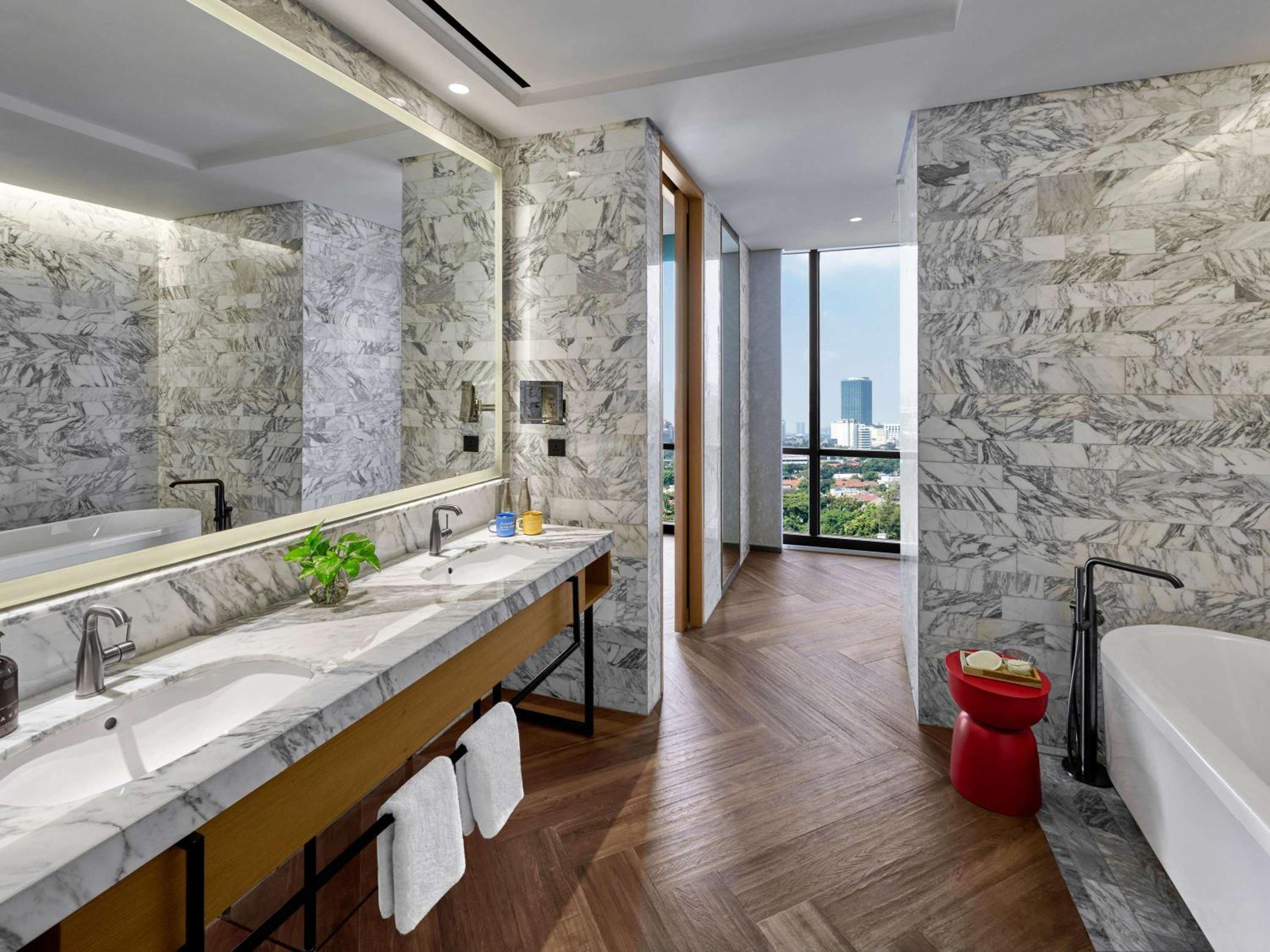 Ashta Residence in Jakarta offers 5-star accommodations with top-notch amenities including allergy-free rooms, a fitness centre, and an outdoor pool. Each air-conditioned room is equipped with modern conveniences like a coffee machine, fridge, and flat-screen TV.