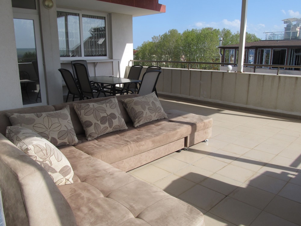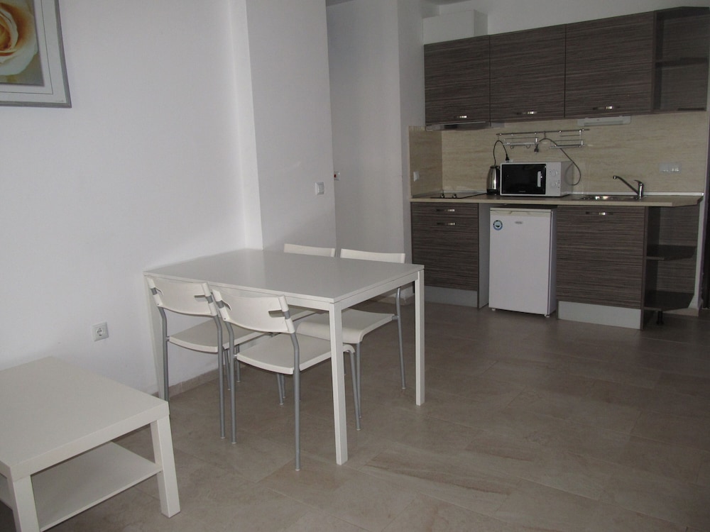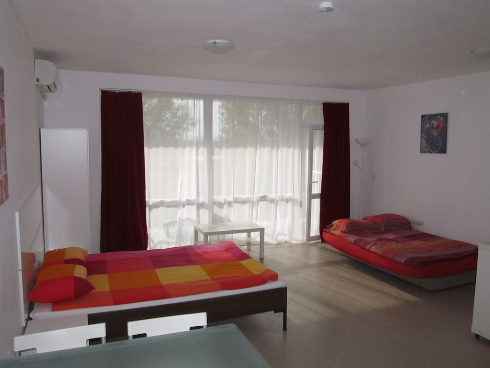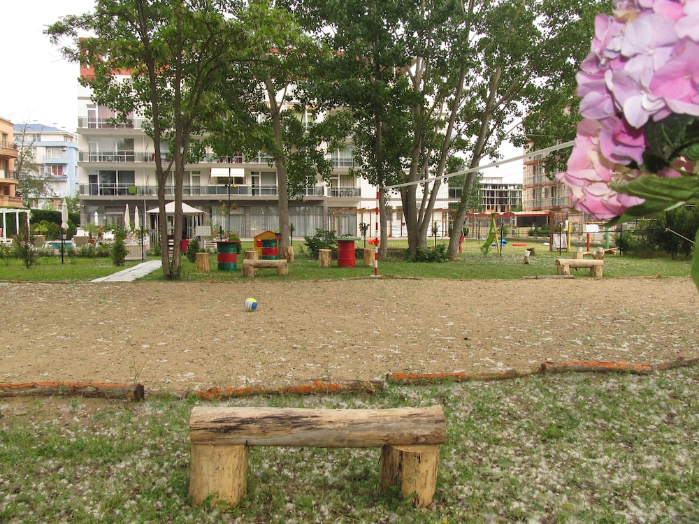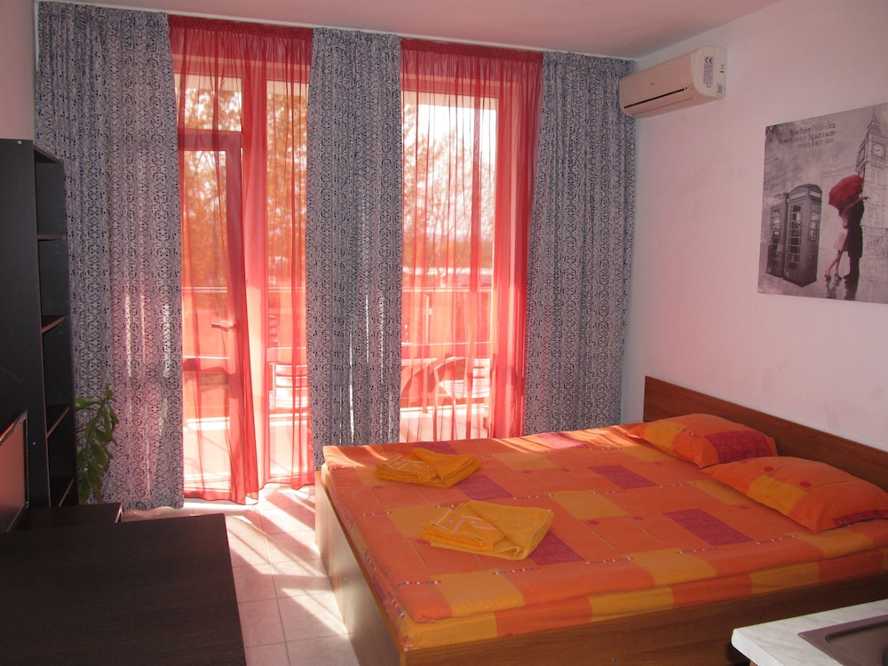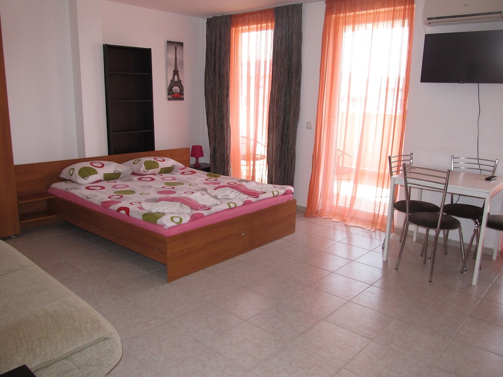 Great hotel with a nice pool, 15-20 minute walk from the beach. Peaceful and quiet, away from the noise of Flower Street and parties but only 20 minute walk from there. We had a delux studio which was spacious, had a balcony and a kitchenette. Marieta and her husband are lovely, very welcoming and friendly. Transfer from Burgas Airport is available at extra charge. Highly recommend!!