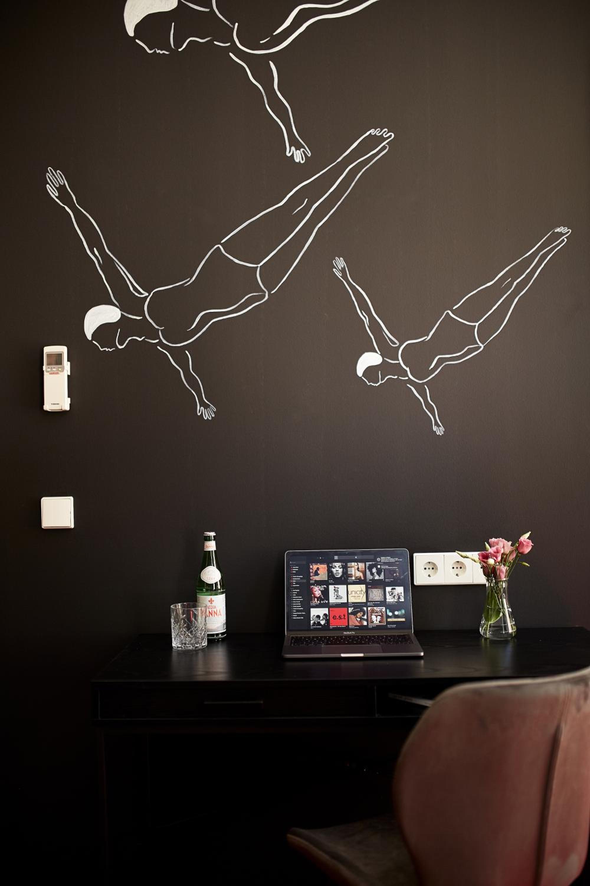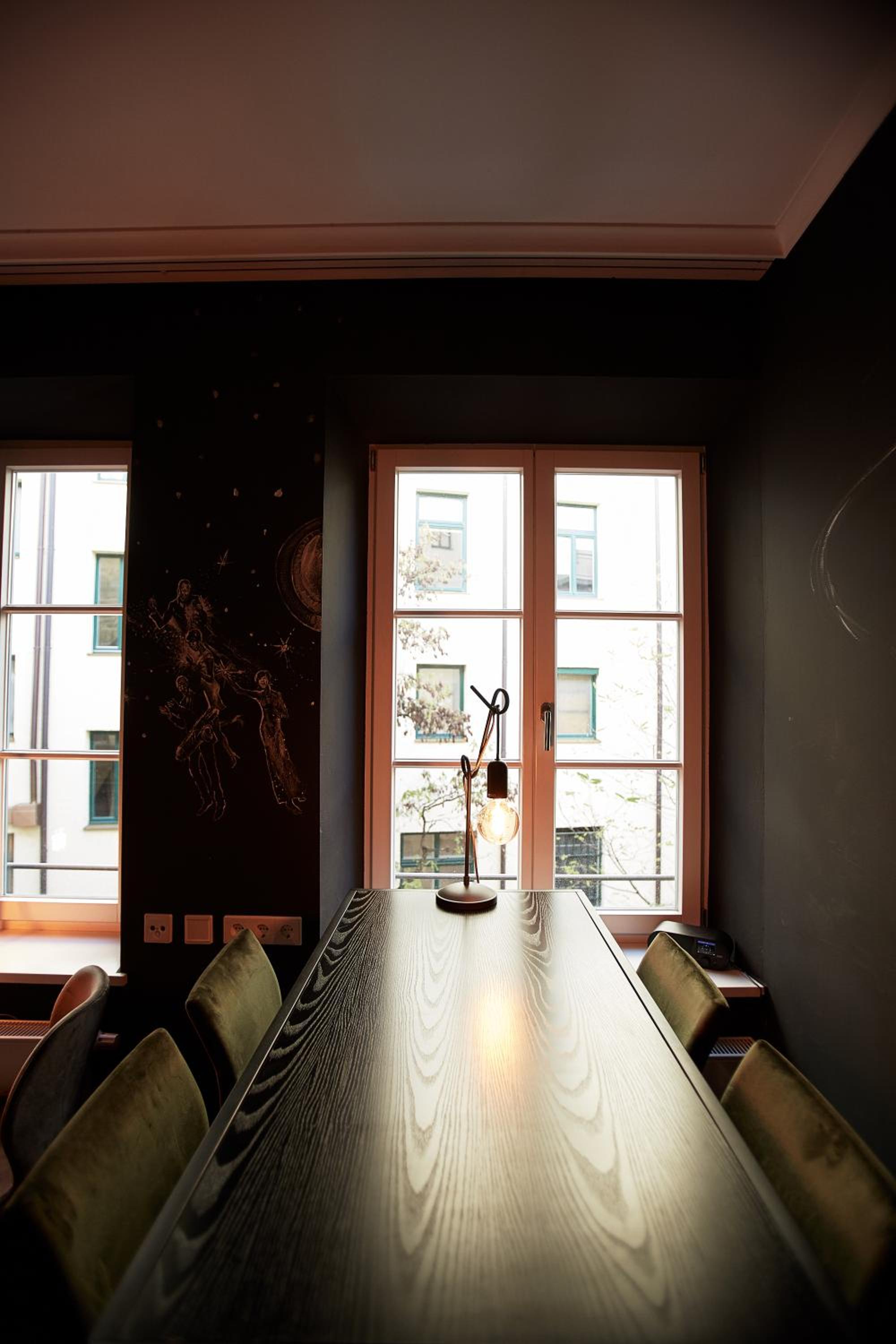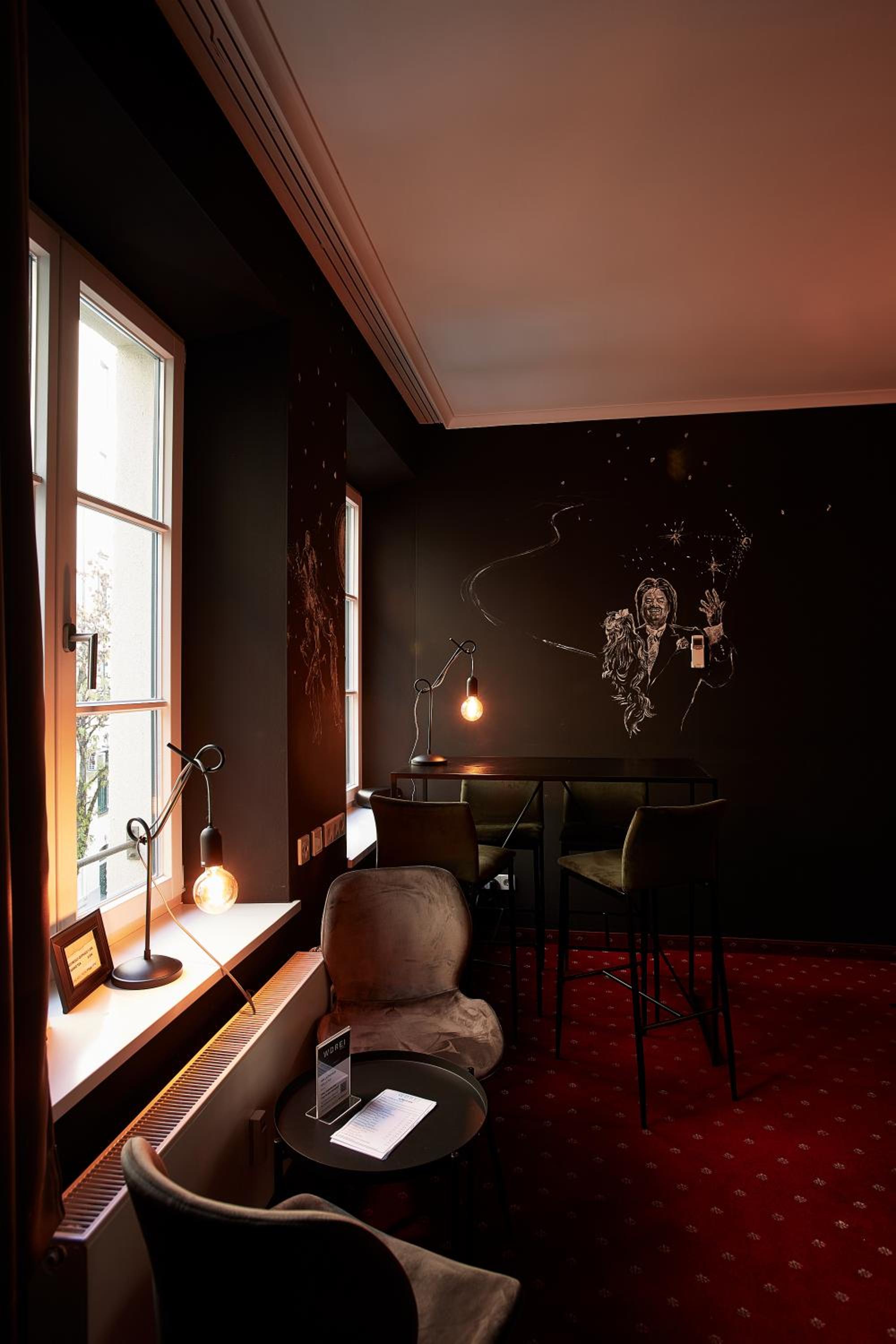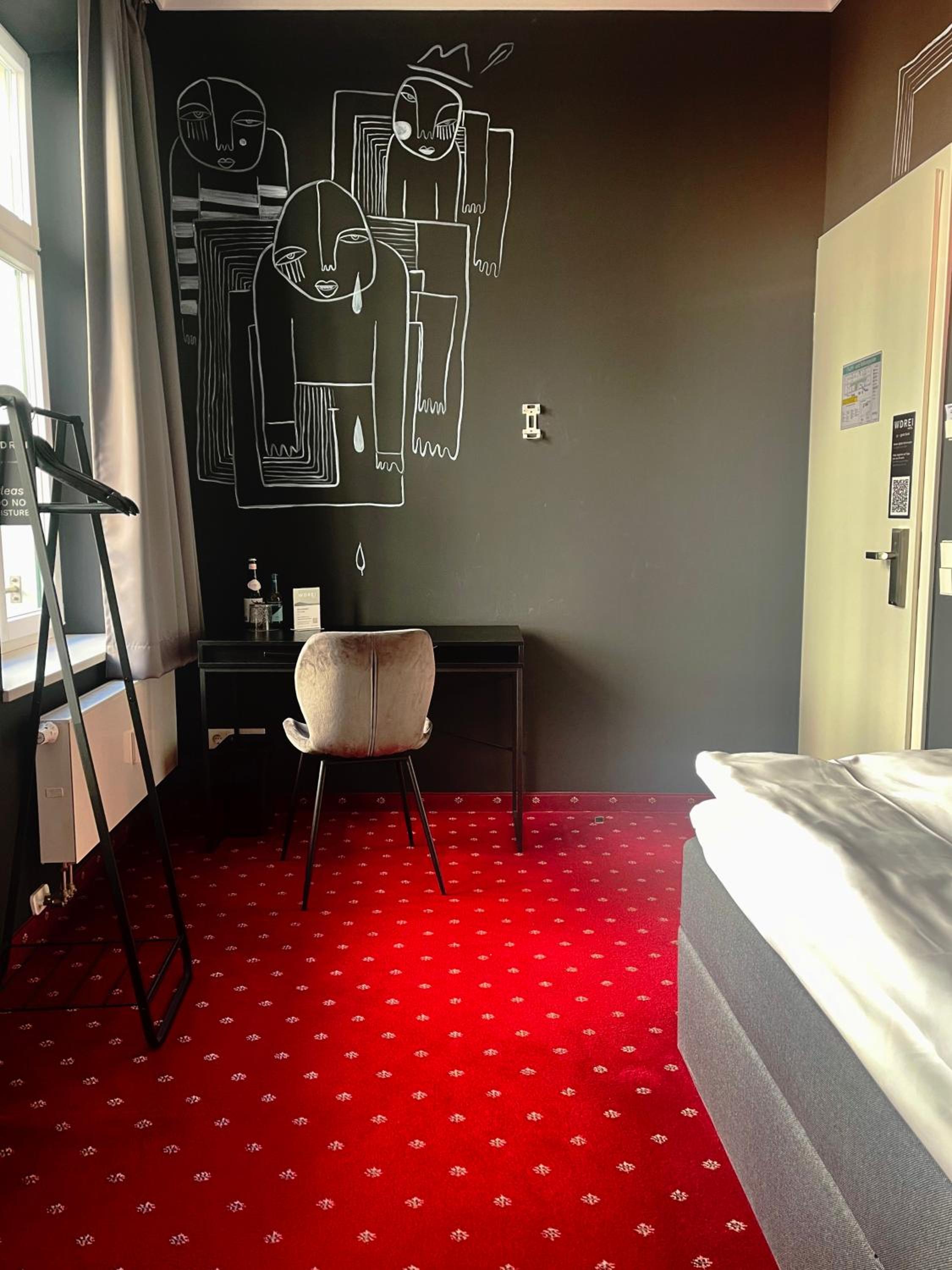 I loved my room. It was beautifully appointed with stunning drawings on the walls and very cozy furniture. The front staff was extremely helpful and warm. Great location near Marienplatz, too. I also love the concept of keeping it simple yet very beautiful. No TV. A great “Honesty Bar” with sodas etc. and hot water, etc. FIVE stars, for sure.