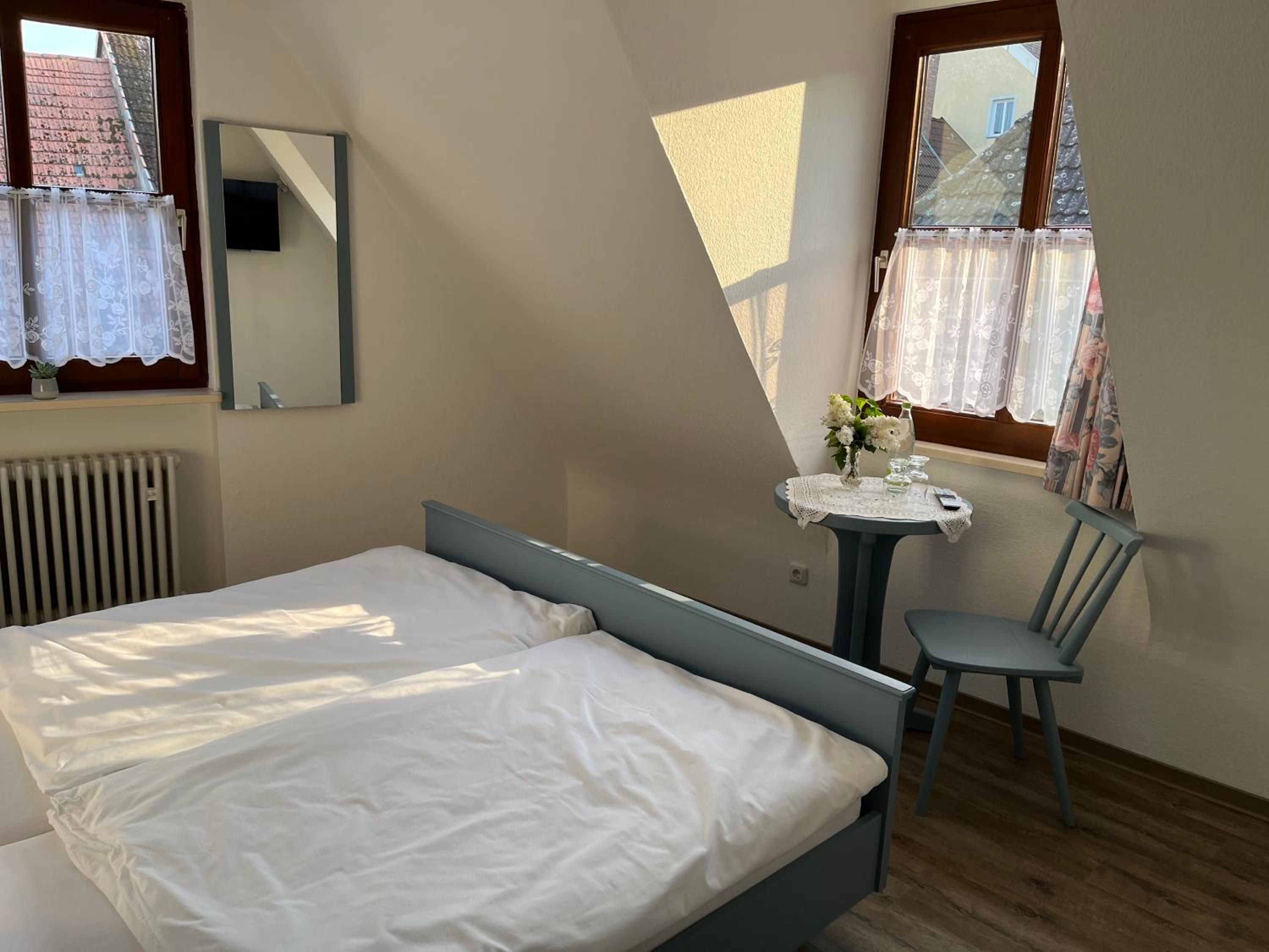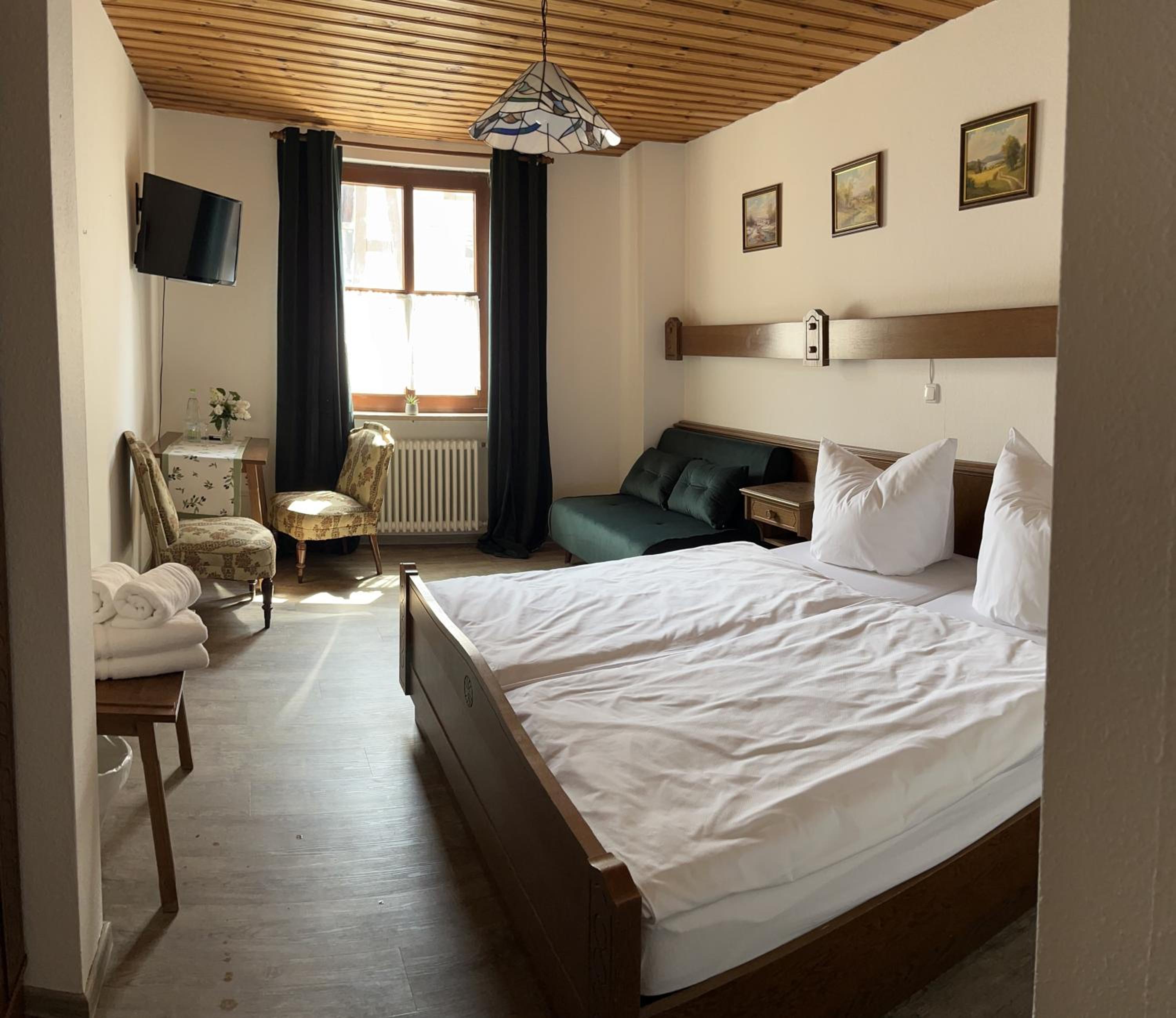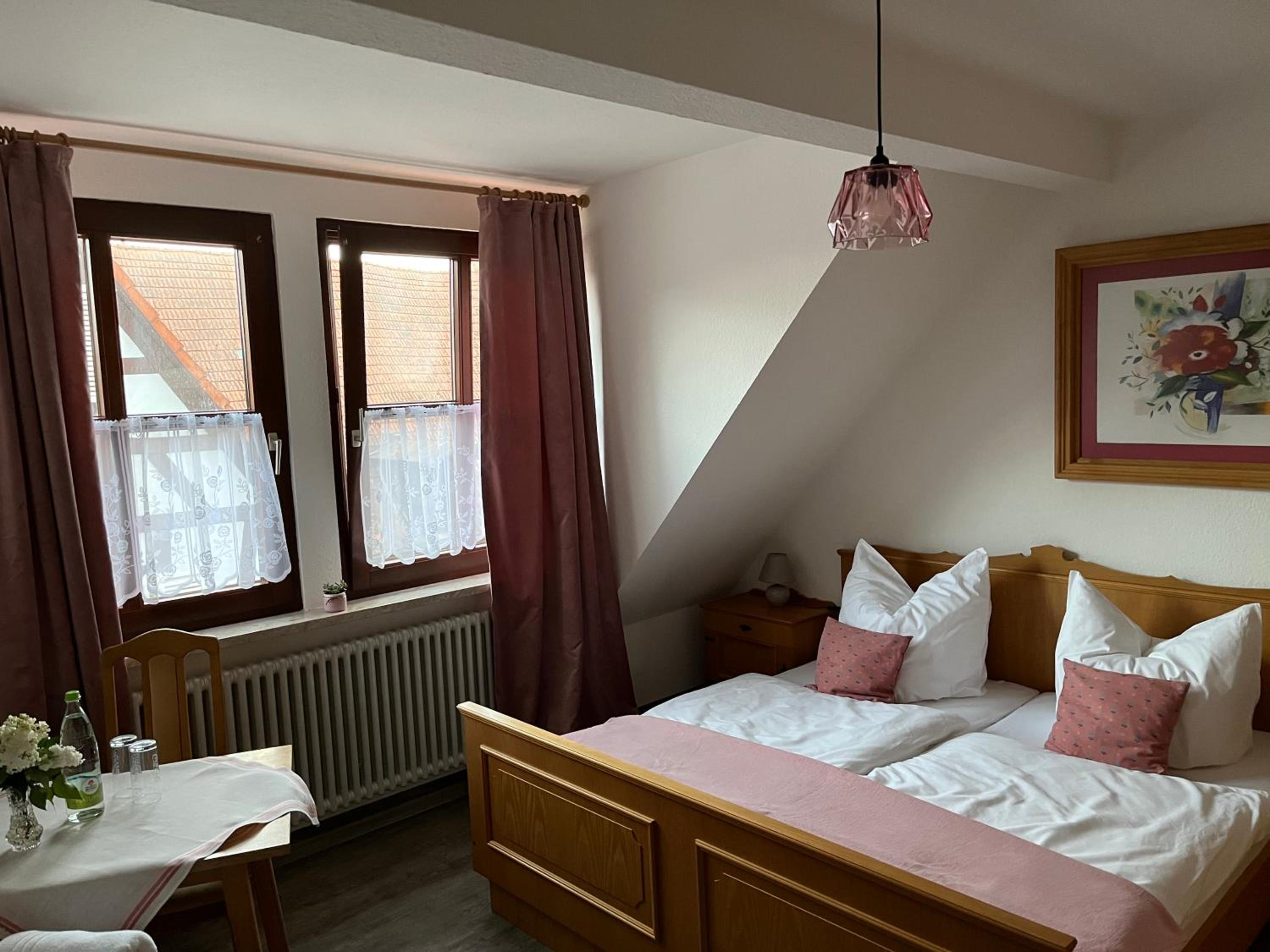 das Zimmer war gerade ausreichend groß. Die Pension liegt in einem alten Gasthof, dessen Charme erhalten geblieben ist. Der Frühstücksraum ist die alte Gaststube und stellt ein Stück Geschichte dar. Das Buffett war gut. Tee und Kaffee wurden serviert.