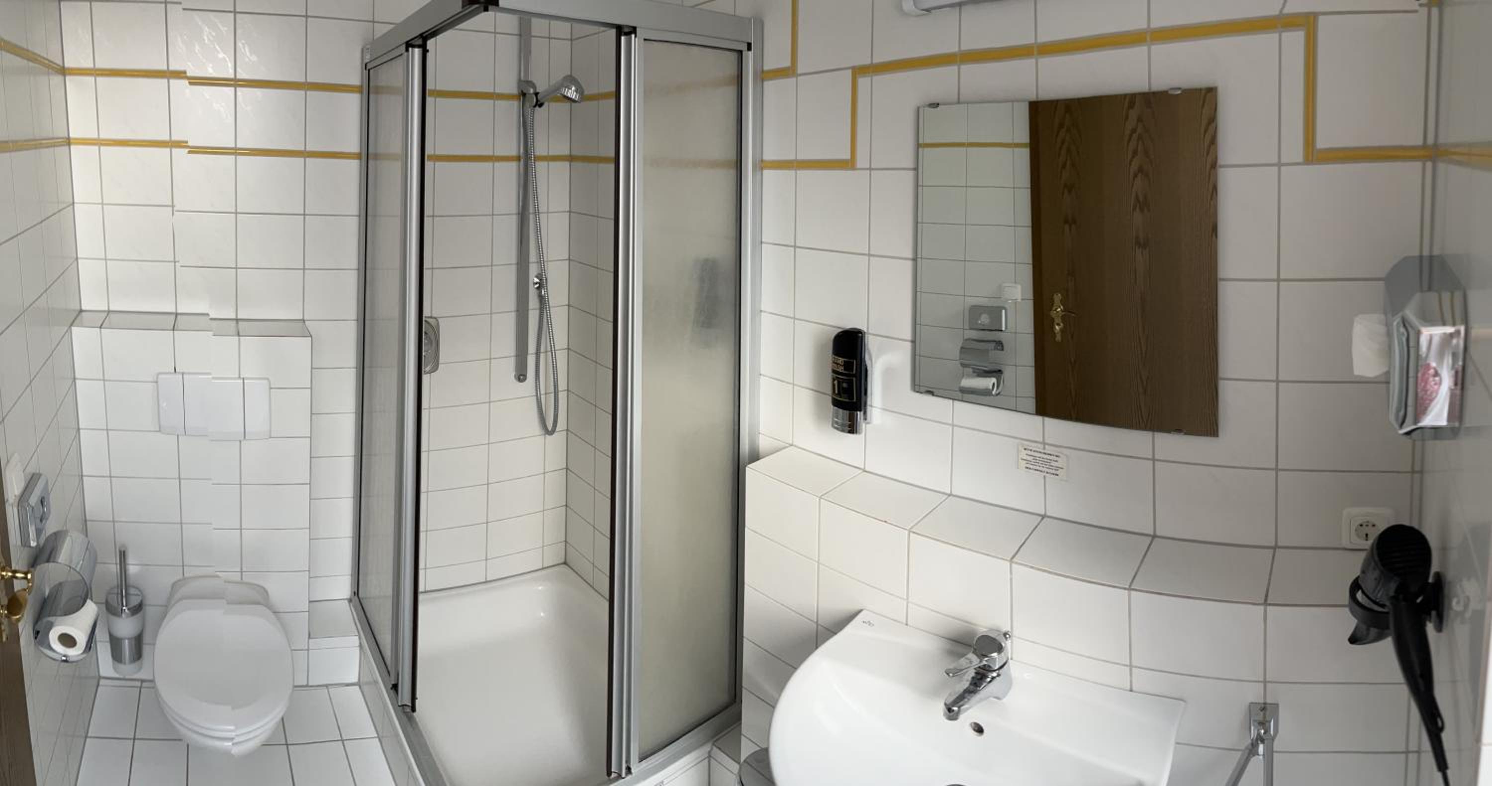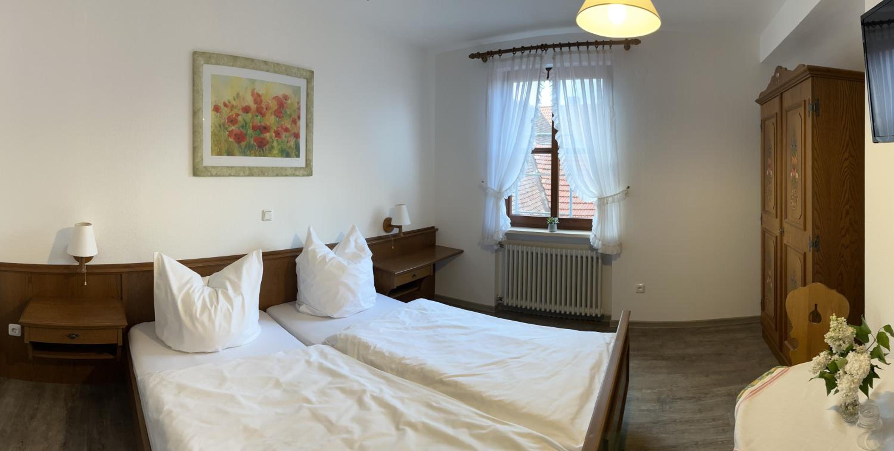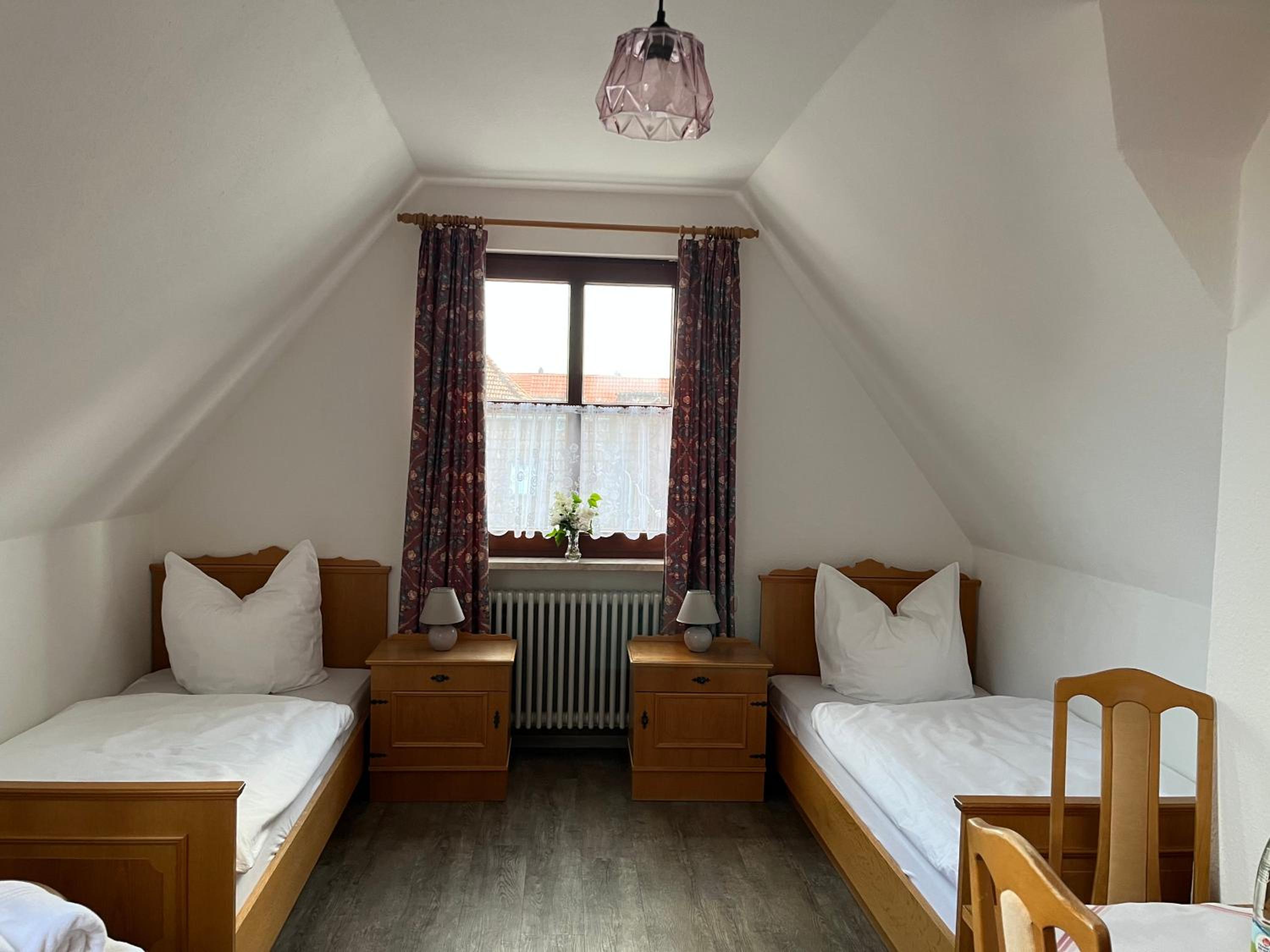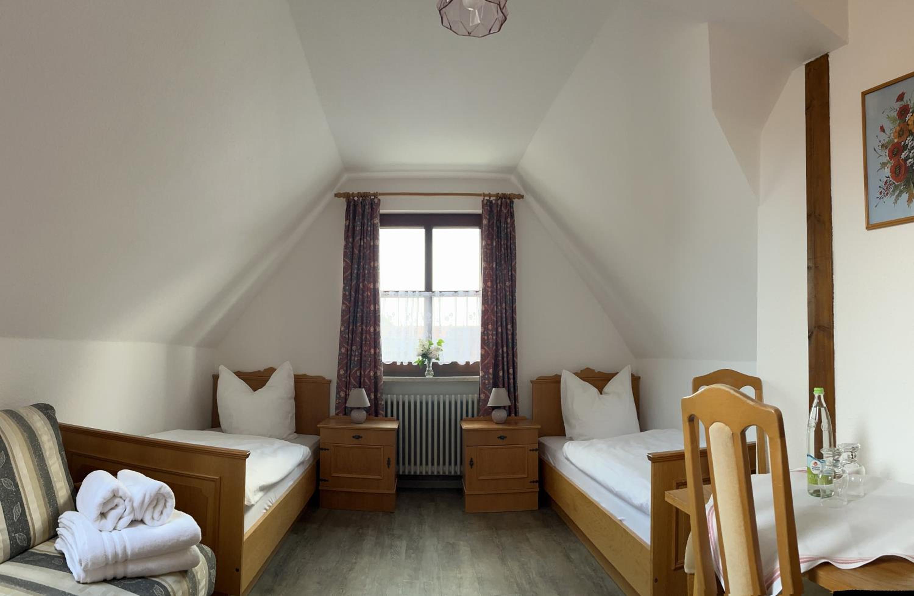 das Zimmer war gerade ausreichend groß. Die Pension liegt in einem alten Gasthof, dessen Charme erhalten geblieben ist. Der Frühstücksraum ist die alte Gaststube und stellt ein Stück Geschichte dar. Das Buffett war gut. Tee und Kaffee wurden serviert.