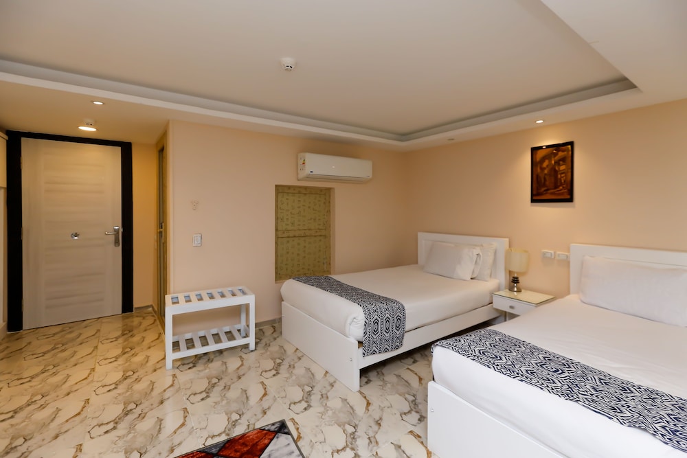 Inside there were 4 beds and the room was a good size. Should you wish to use the bathroom, there is a step which is approx 6-8 inches deep. To go out of the main room door, theres another step. There's a step into the bathroom about 2 inches deep. The marbled floors have various chips in them throughout, which can cut knees, feet and hands if your mobility allows you to crawl or bottom shuffle. If you cannot walk and/or climb a steep step, you would not be able to access the bathroom at all . The edge of the step is raw, no rolled top or smooth join. Where the step is, theres also no lighting, so once the main lights are off, its very dangerous. We ended up shuffling slowly so we felt when we had reached the edge.