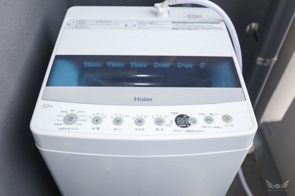 房間大, 廁所大, 有洗衣設施但不能乾衣, 離車站稍遠