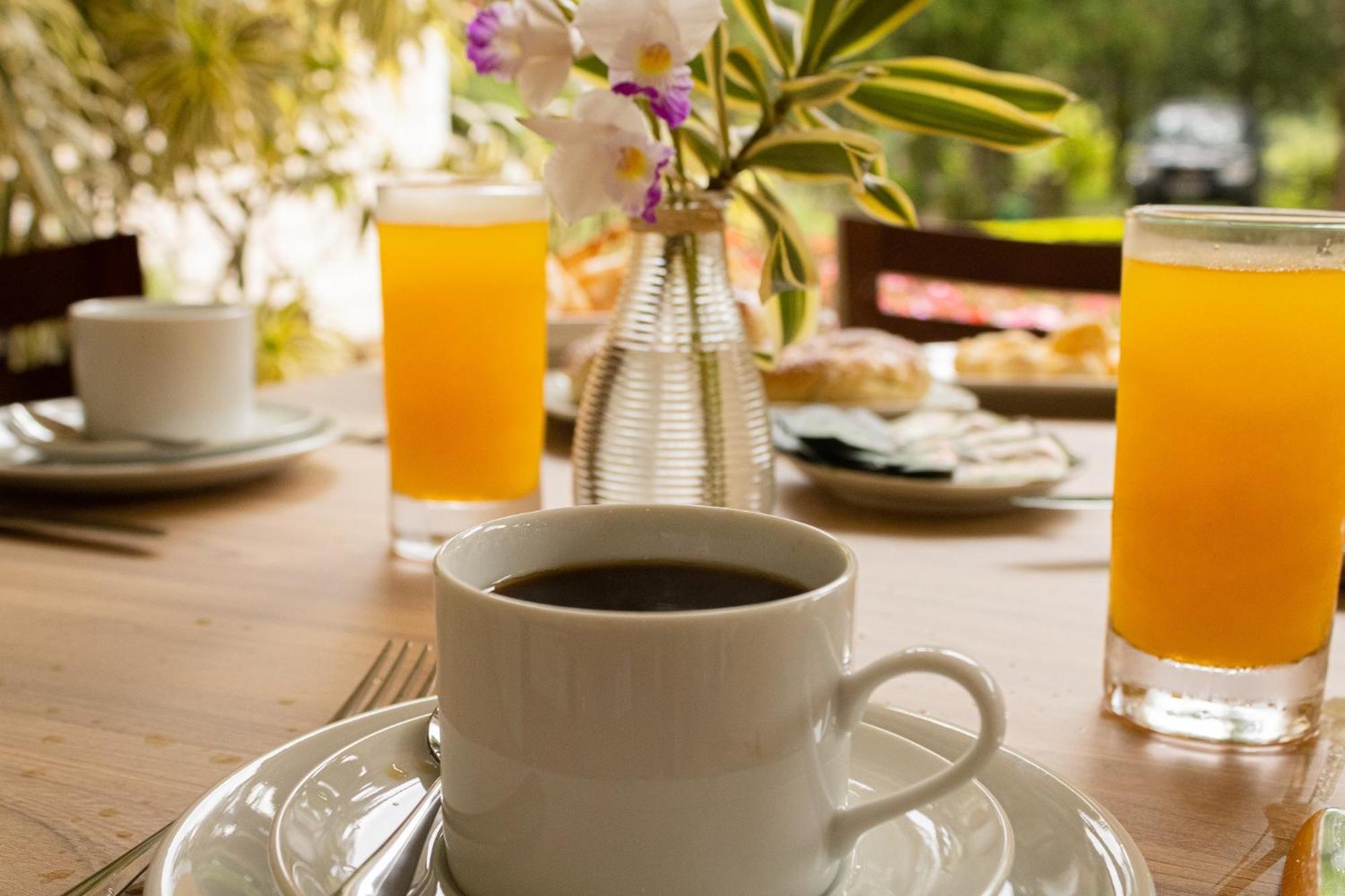 O café da manhã é delicioso e o lanche da tarde igualmente saboroso.