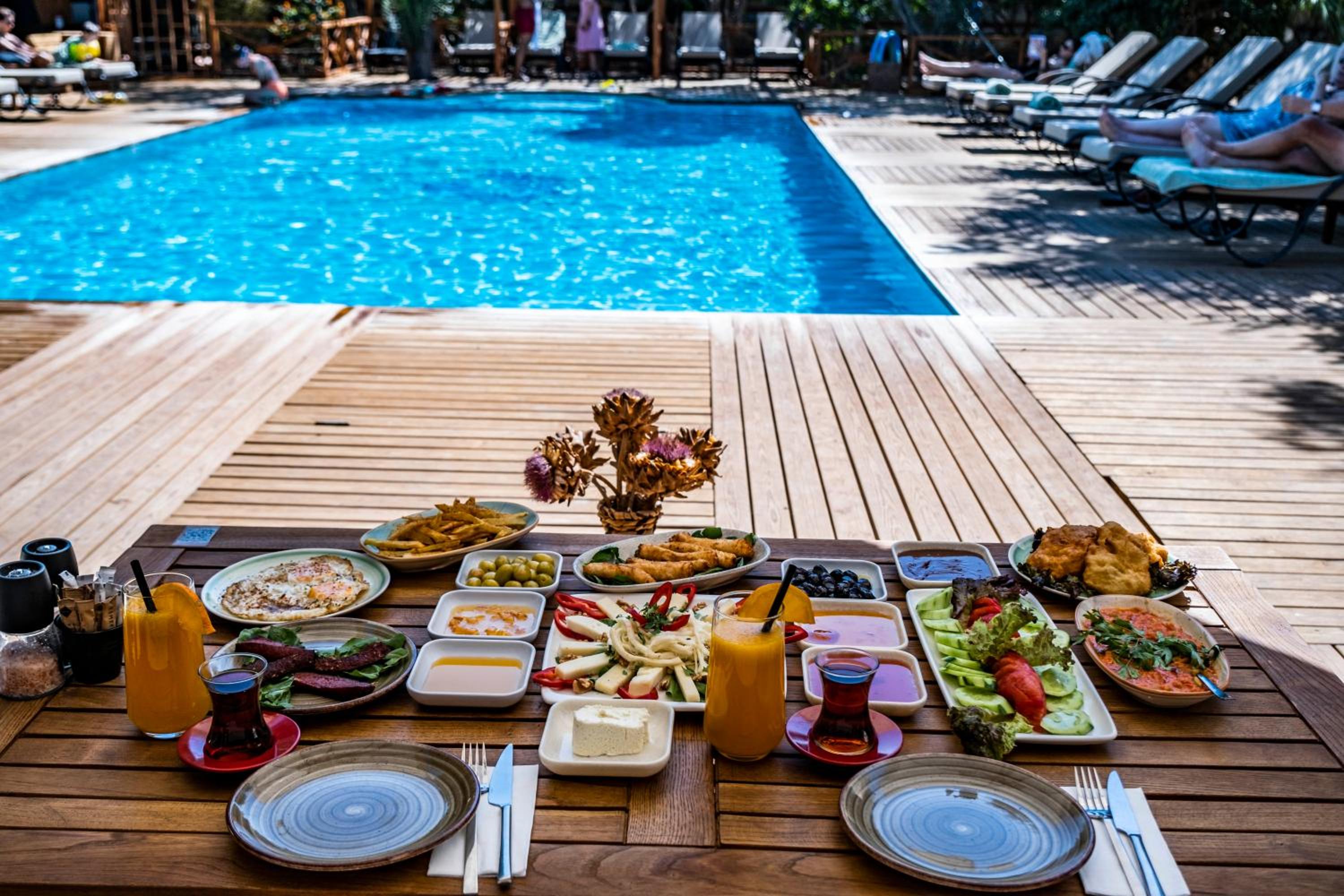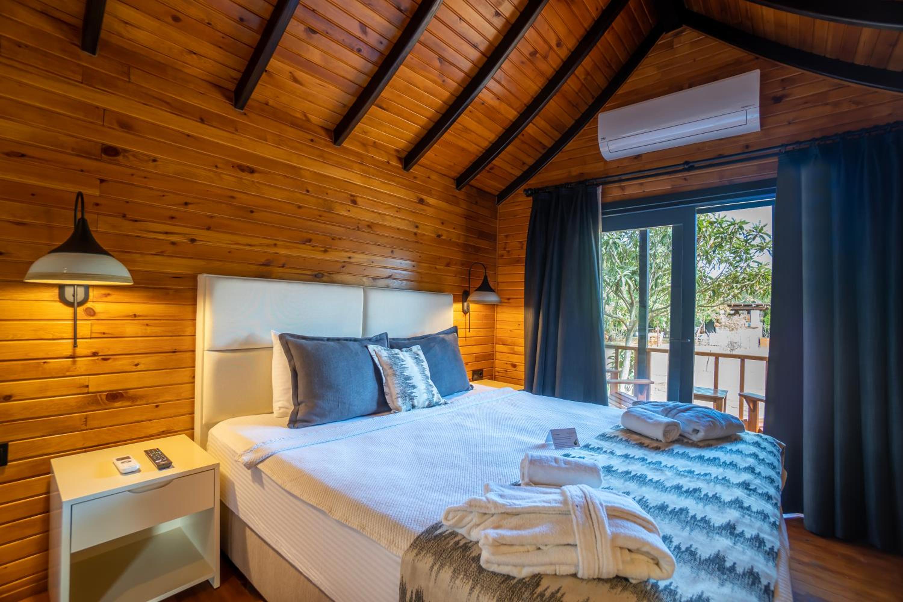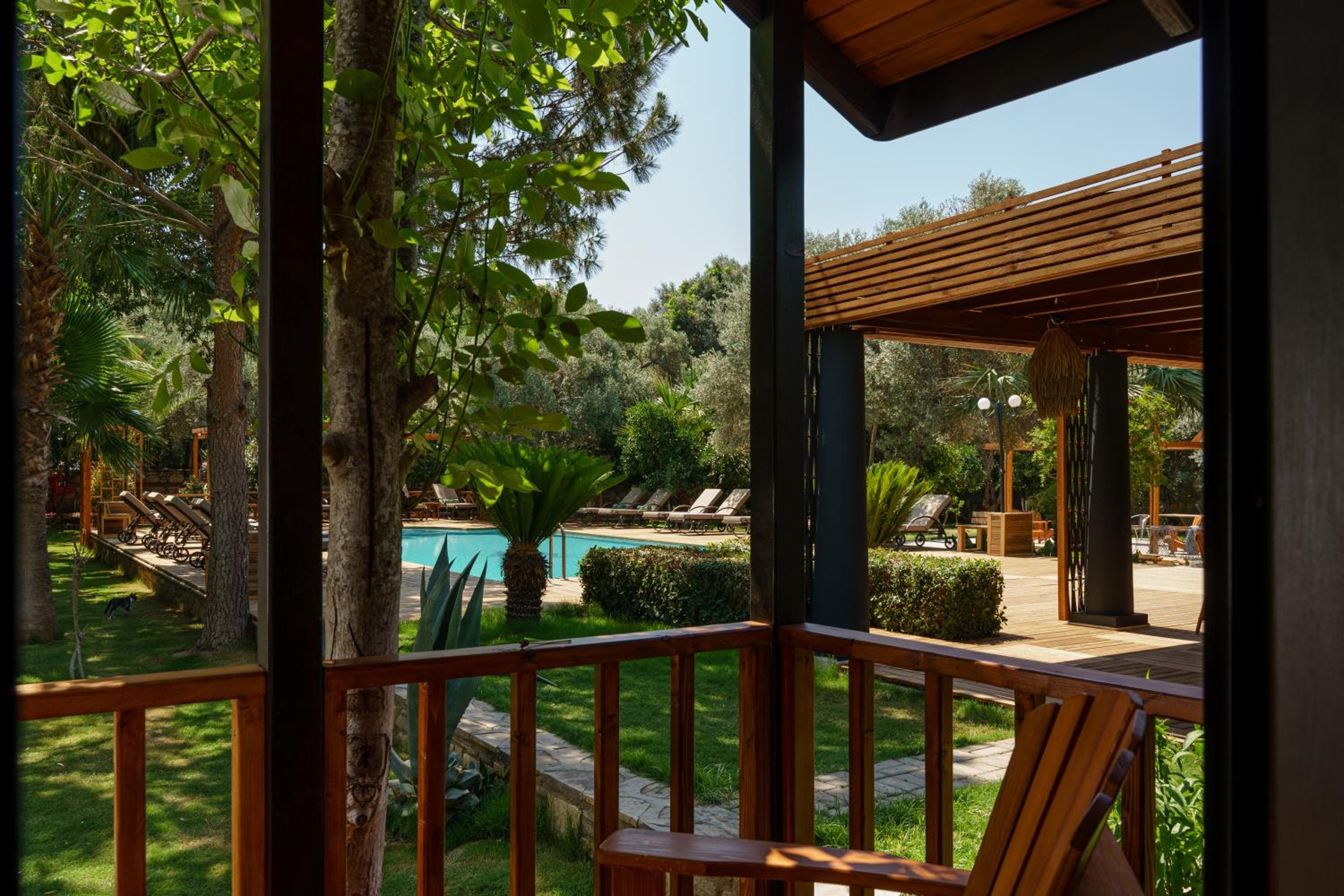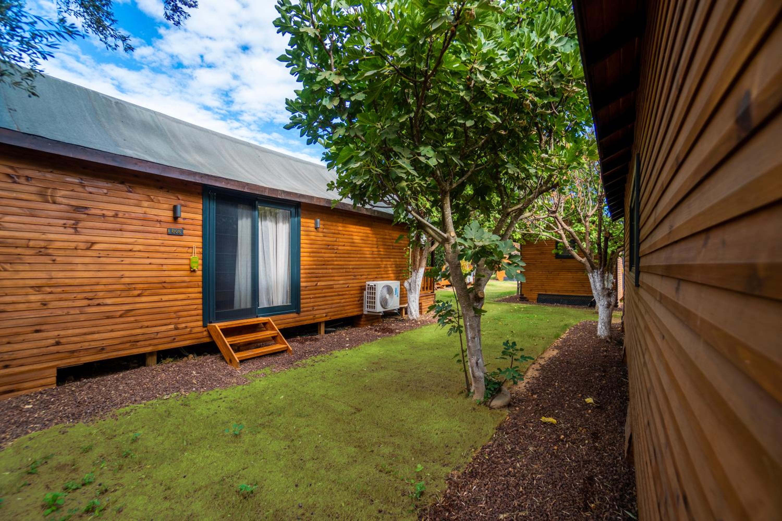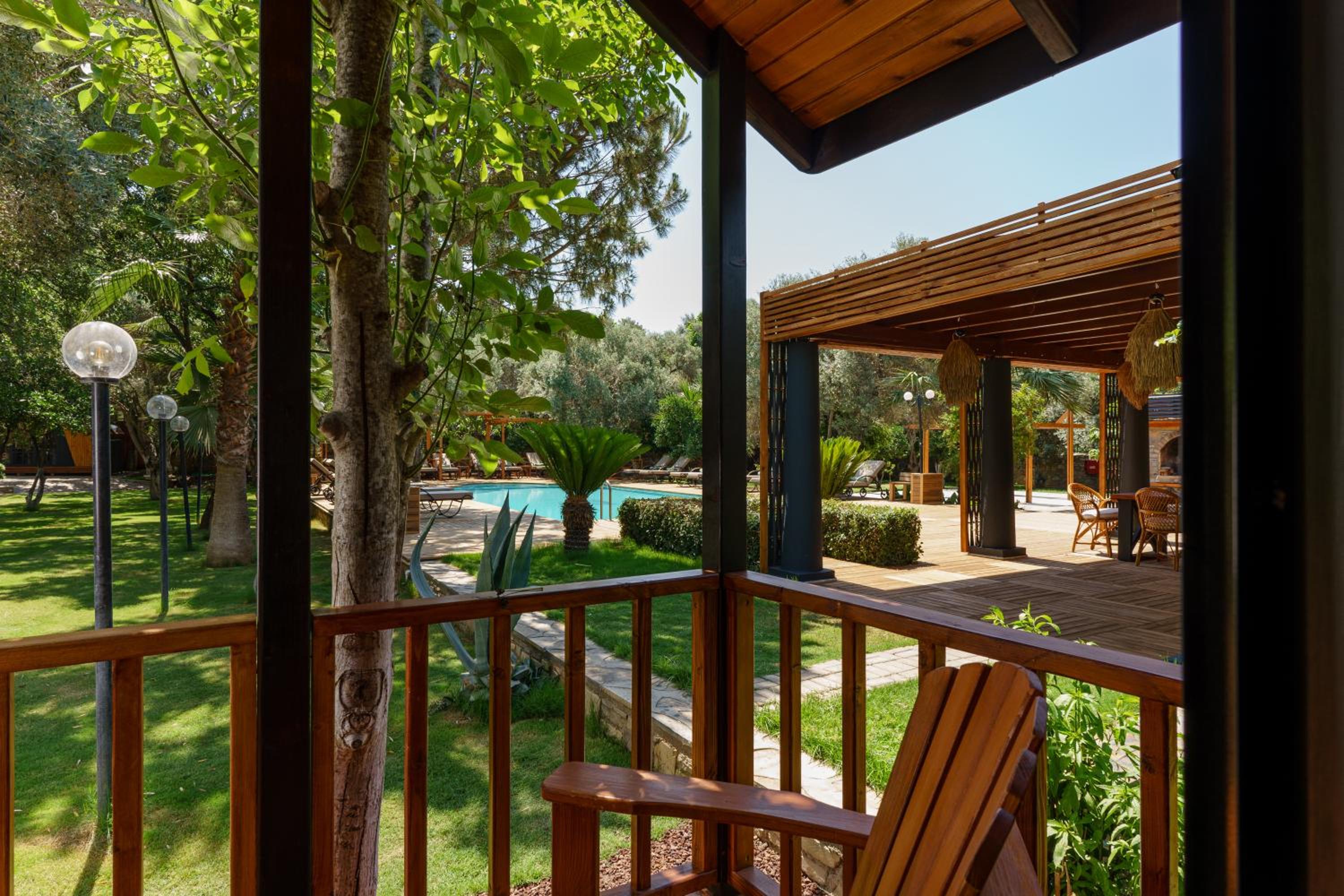 Lovely wooden bungalow set in gardens with olive, fig and pomegranate trees. Fabulous pool with plenty of sun loungers and choice of sun or shade. Owner cankat friendly and welcoming as were most of other staff who couldn’t do enough to help, special mention to Tarken. Our air conditioning worked well. Food was also very good. 15 min walk into Bitez with a selection of bars, restaurants and supermarkets. We will be back