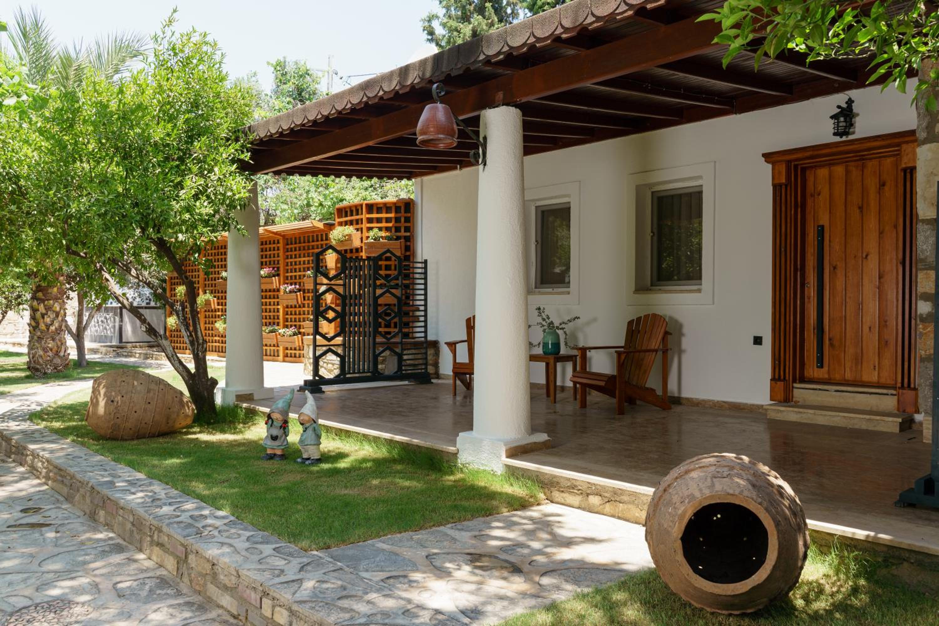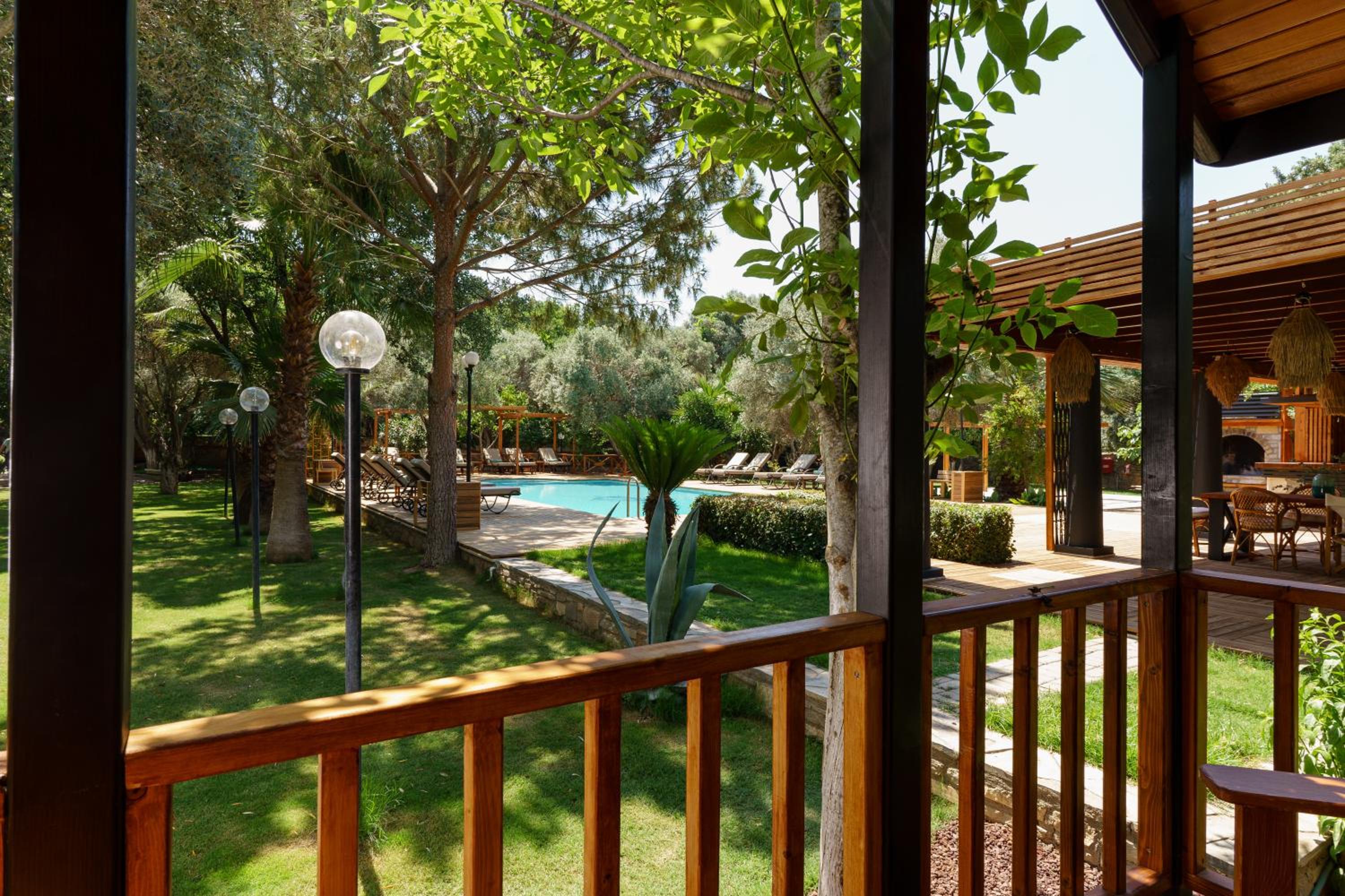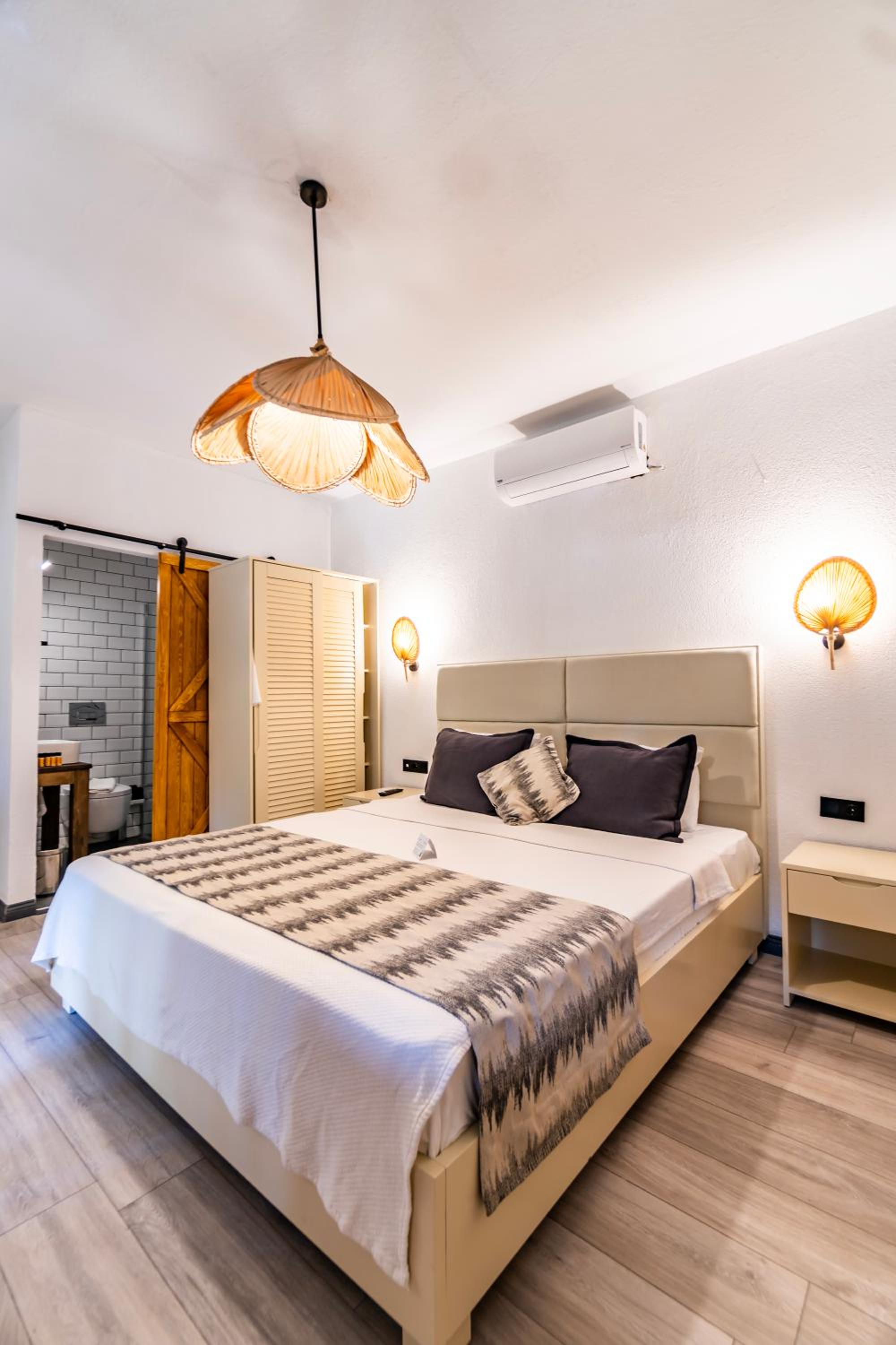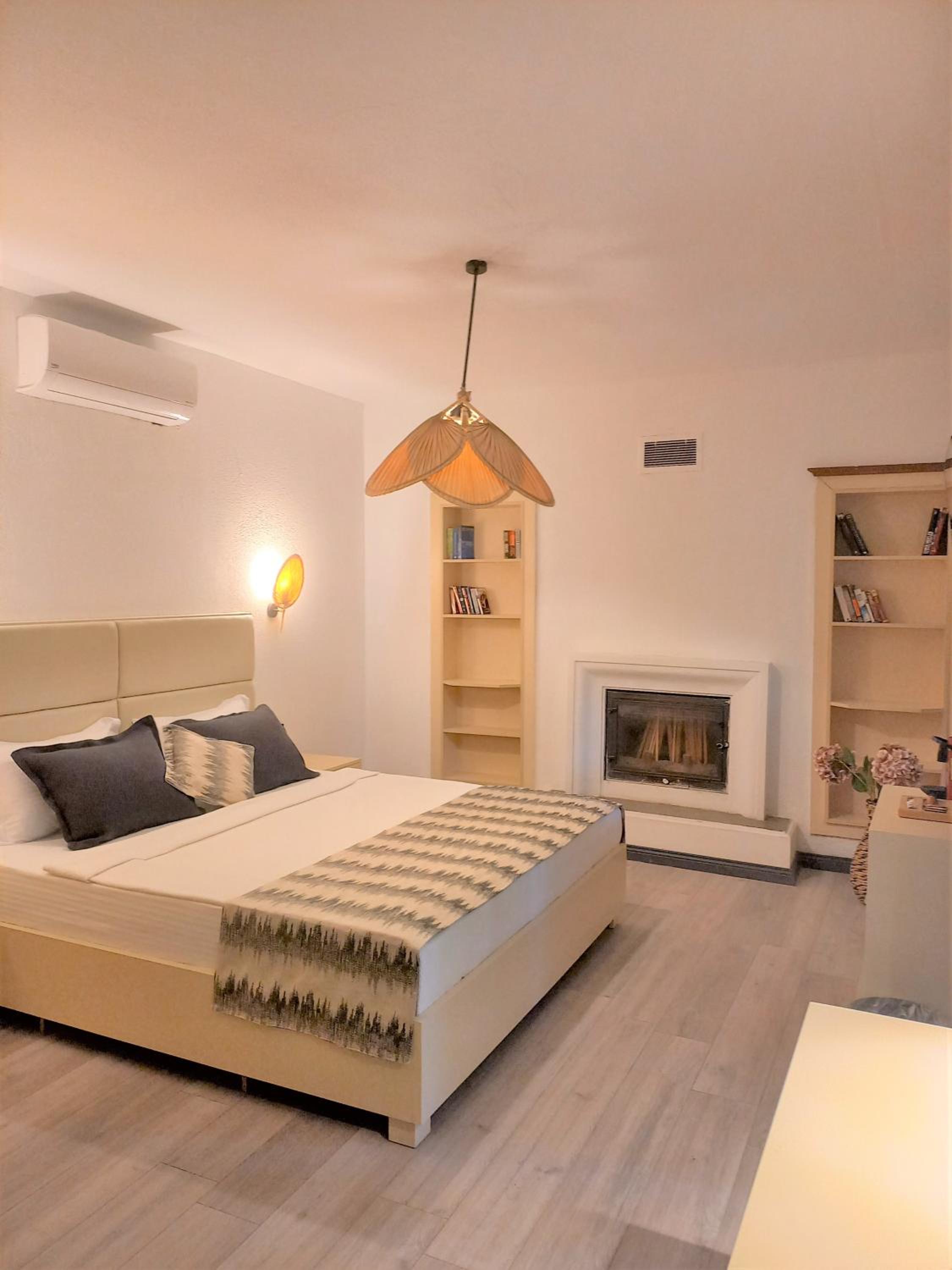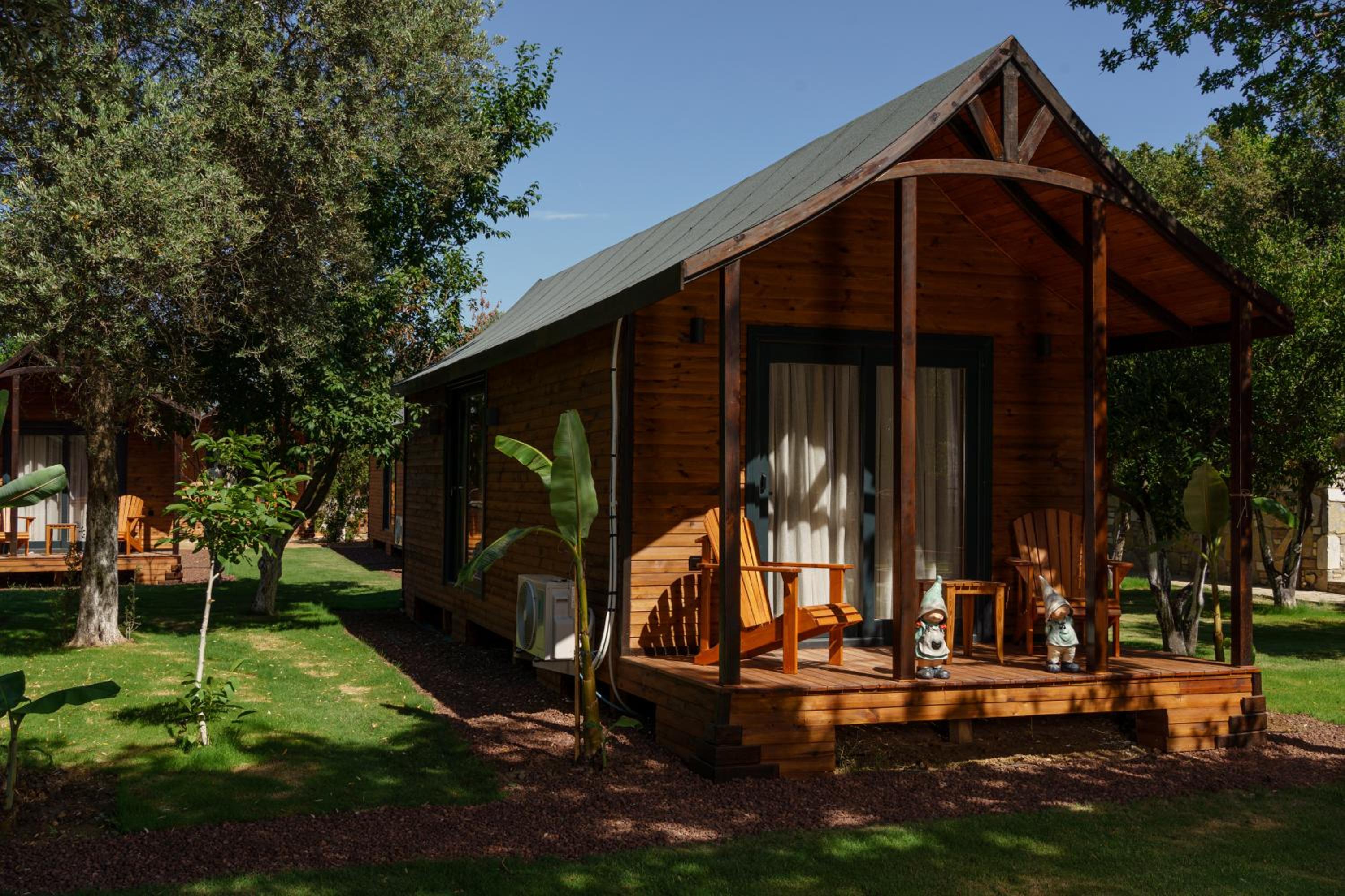 Lovely wooden bungalow set in gardens with olive, fig and pomegranate trees. Fabulous pool with plenty of sun loungers and choice of sun or shade. Owner cankat friendly and welcoming as were most of other staff who couldn’t do enough to help, special mention to Tarken. Our air conditioning worked well. Food was also very good. 15 min walk into Bitez with a selection of bars, restaurants and supermarkets. We will be back