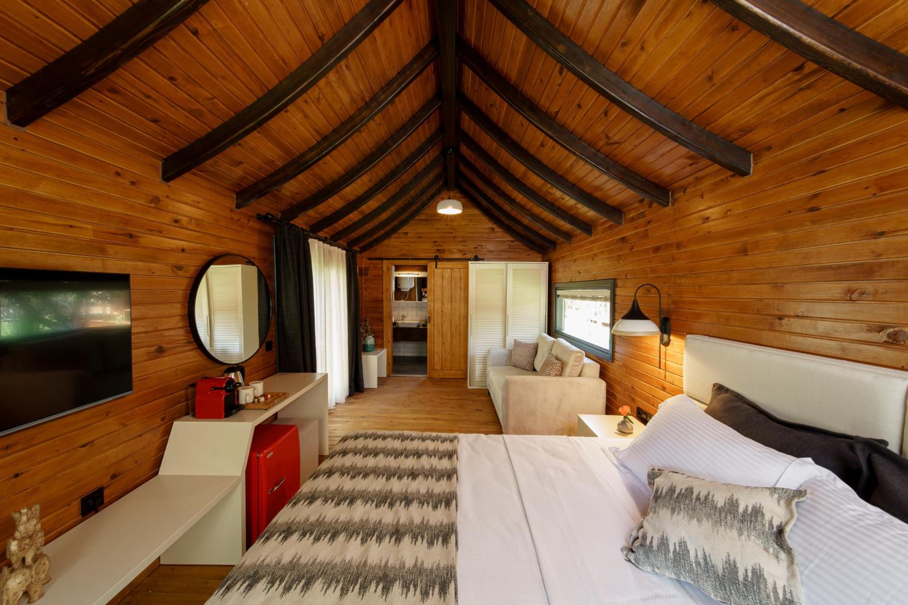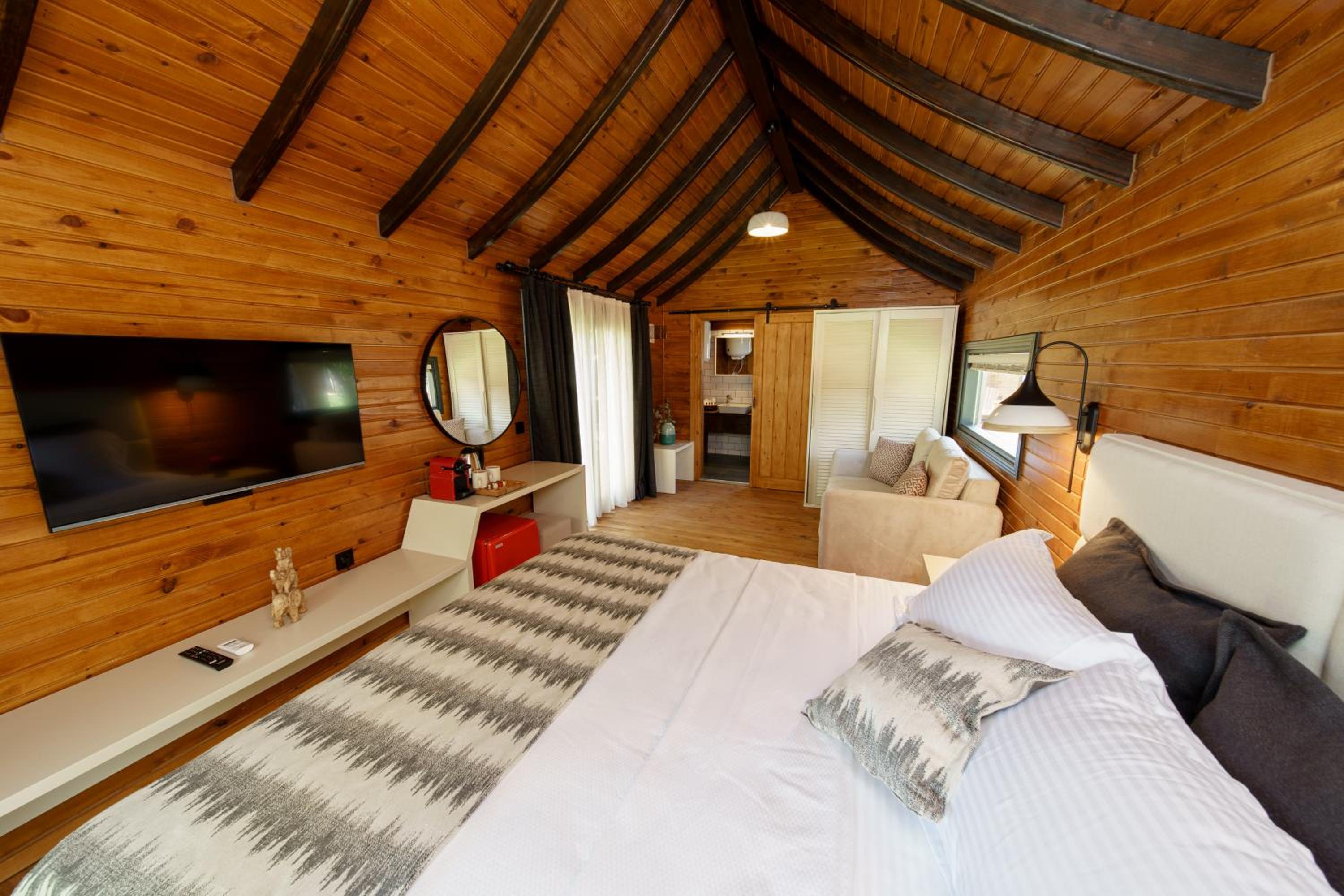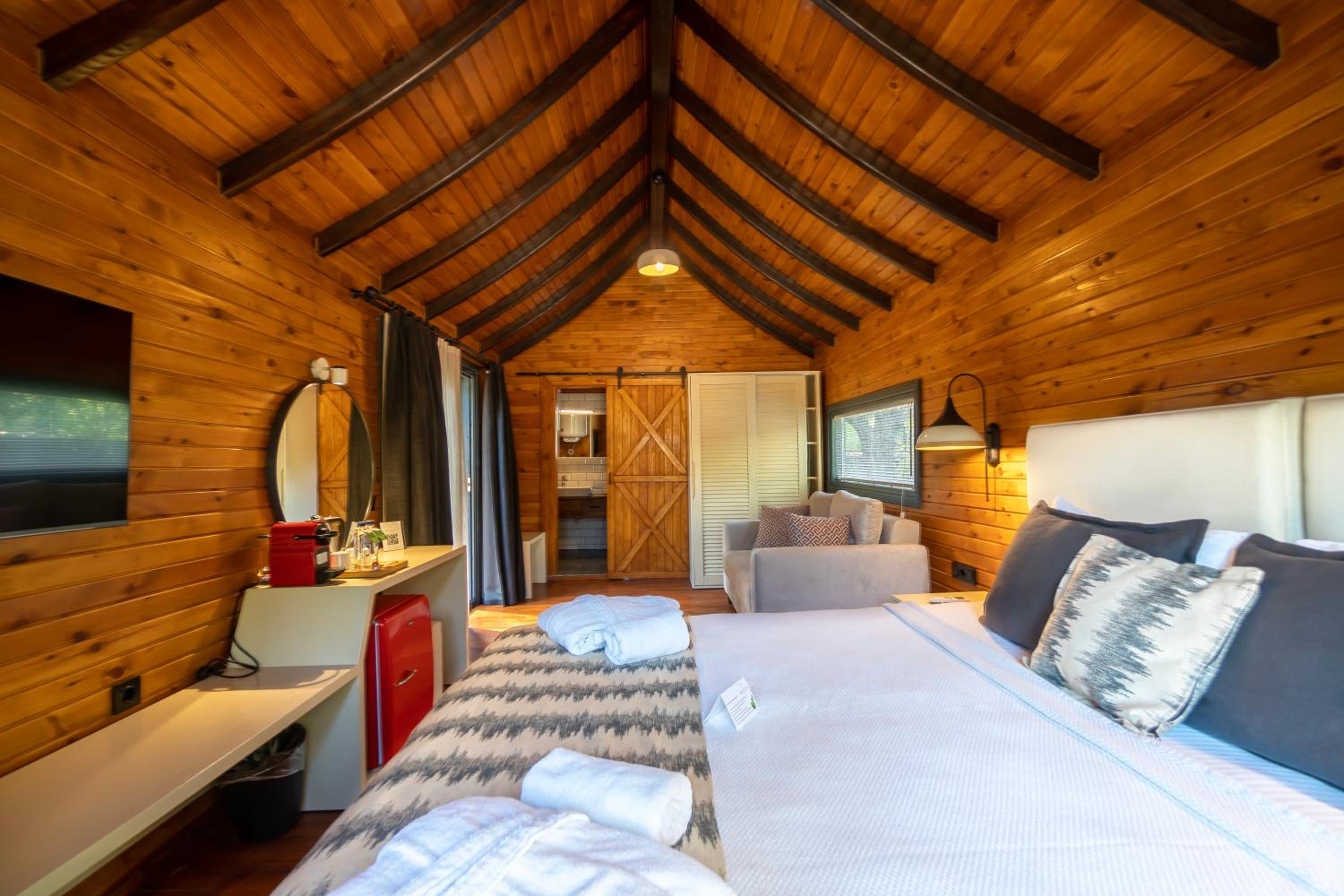Dolce Vita Luxury Bungalows in Bodrum City offers a premium stay experience with beautifully designed rooms featuring coffee machines, terraces, and stunning mountain views.