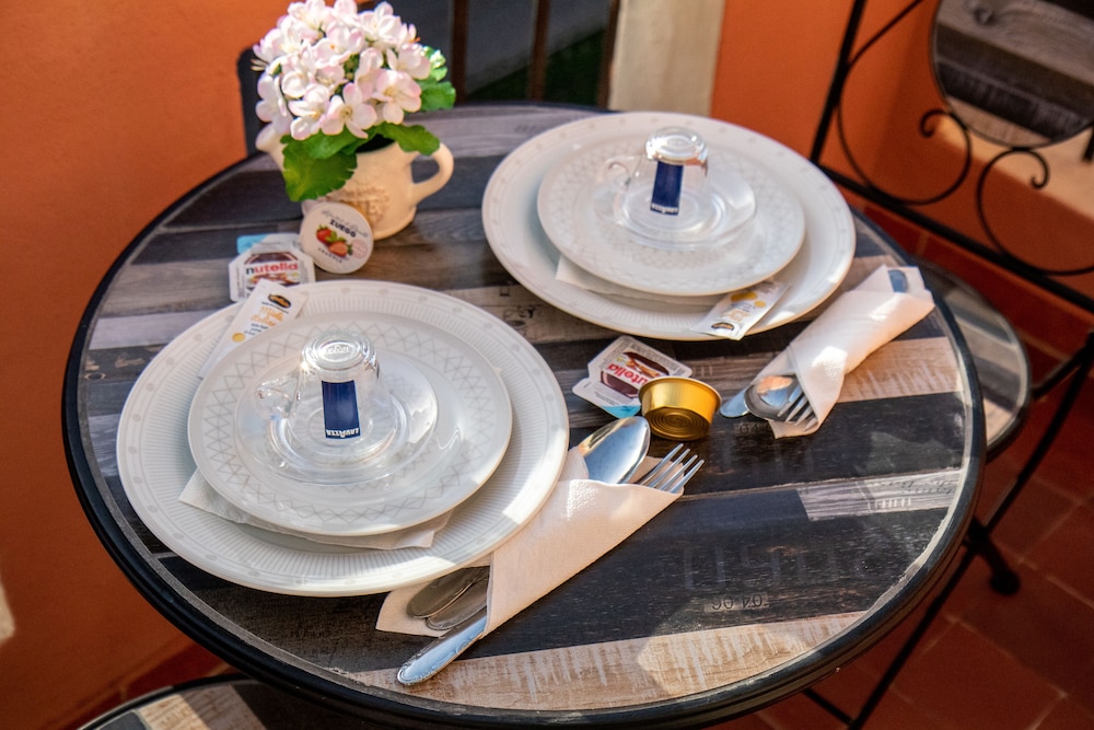 Once you got beyond the entrance which is not that inviting you were treated to a most comfortable room, very modern and very well appointed. The bathroom is modern and very efficient. The smart tv gives you lots of options. You can log in to Netflix if you have an account (remember your password). Outside the bedroom is a very nice common area supplied with tea and coffee. Upstairs is a lively huge terrace decorated with plants and a comfortable sitting area. There’s a view of the mountains in the distance. Breakfast is at a bar/cafe a very short walk away. The staff there are most accommodating. You can take away your coffee and cornetti if you prefer. The only disadvantage is the 5 mints walk away from the pedestrian area which certainly wouldn’t be a problem for younger people. Be sure to be in touch with the owner ahead of time to let them know your arrival time. There’s no staff at the site. They will meet you there.