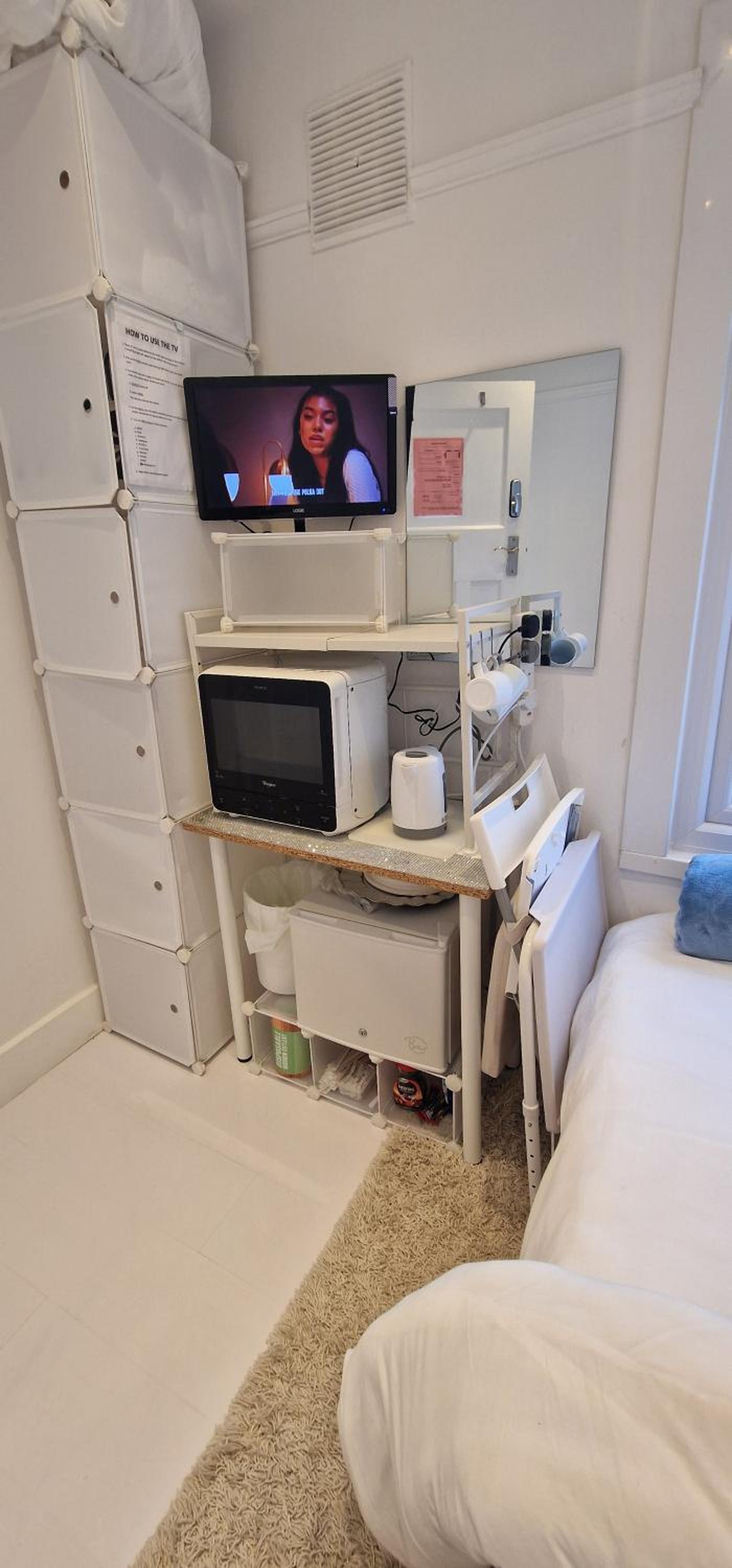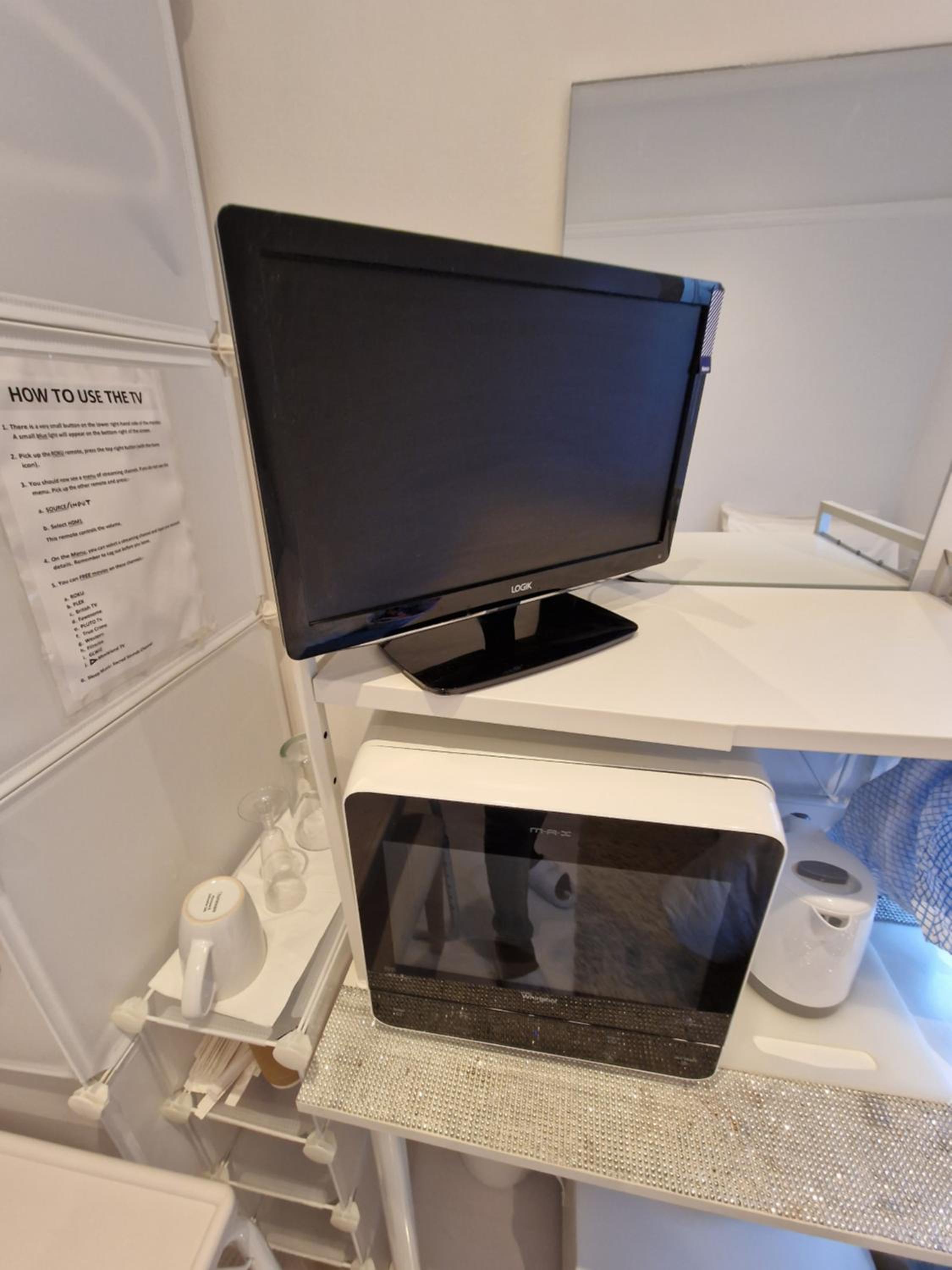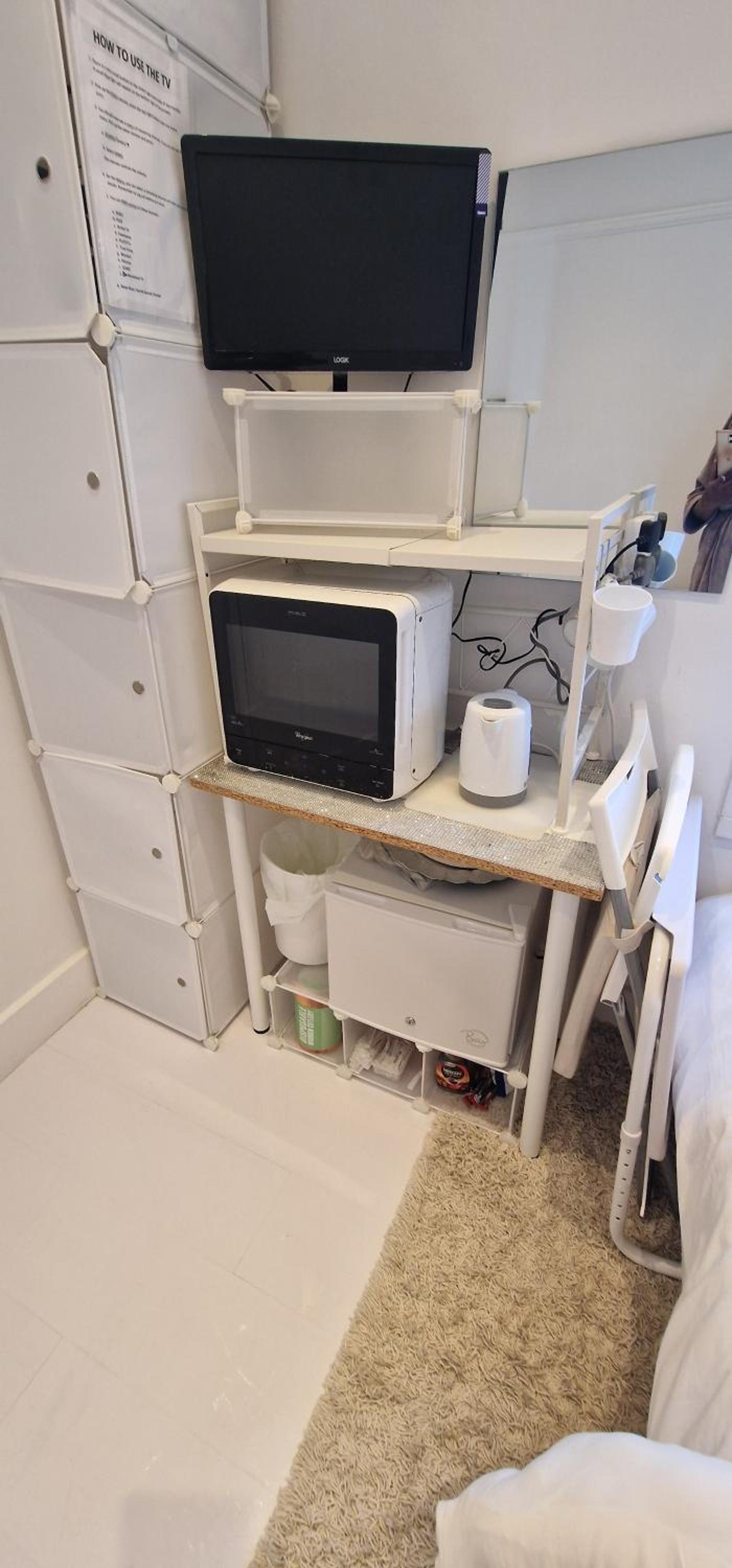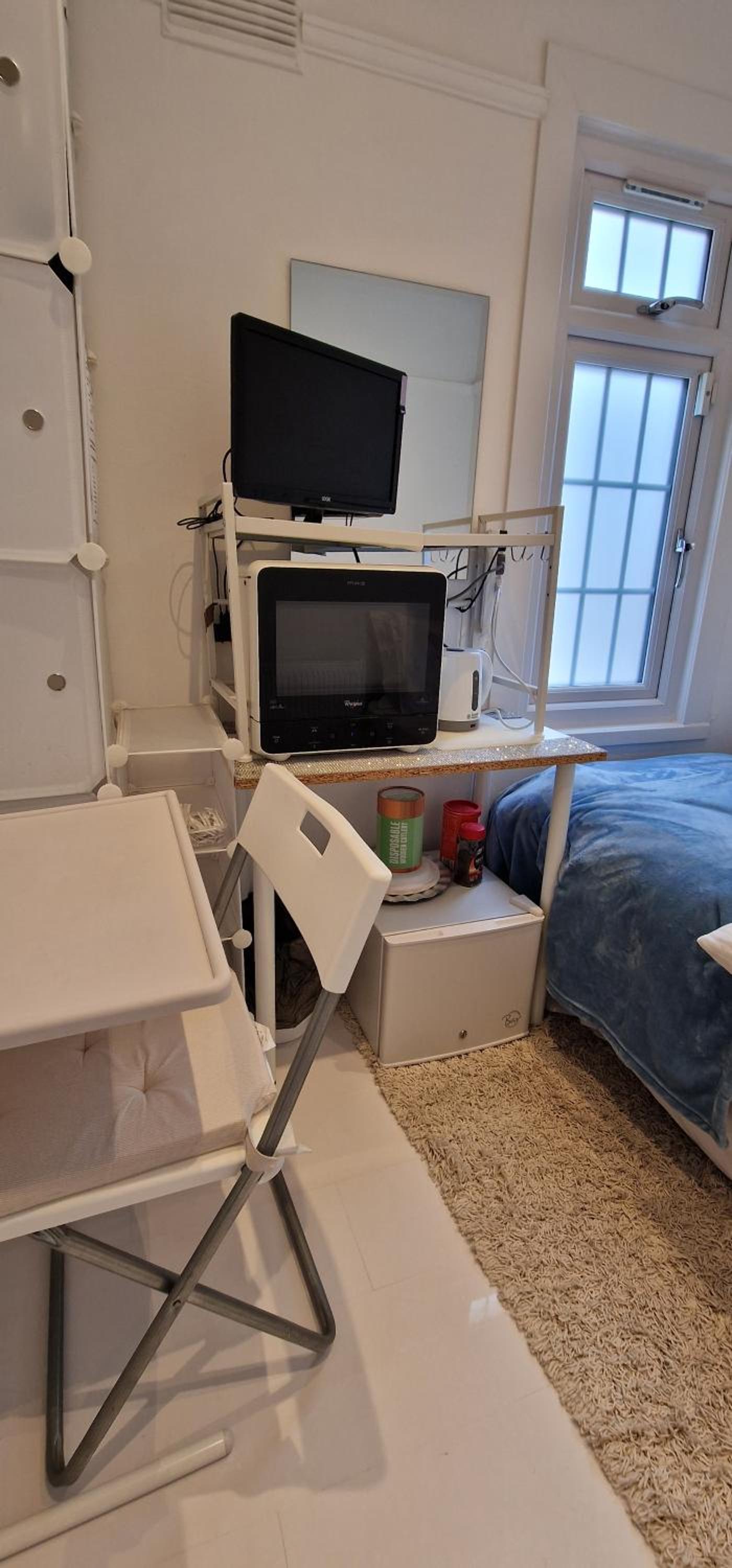 A smoke alarm on the landing beeped the whole time, so, in need of batteries it would not have alerted in the event of fire.....therefore a serious health risk. Appliances packed tightly in the room (kettle, microwave AND TV) were all plugged into one extension lead then into a single socket. None had been PAT tested.
