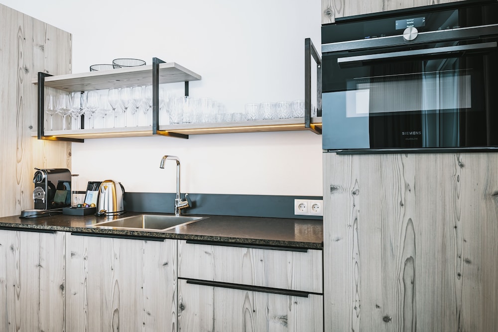 Wasserkocher, Nespresso-Maschine, Besteck usw. sind vorhanden.