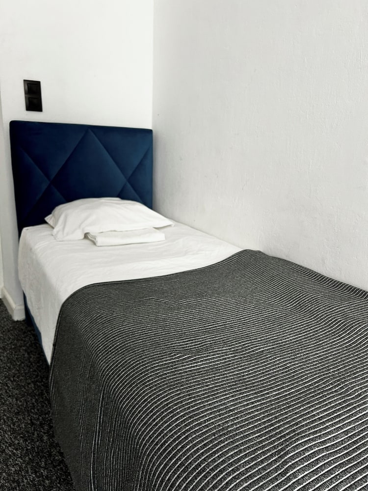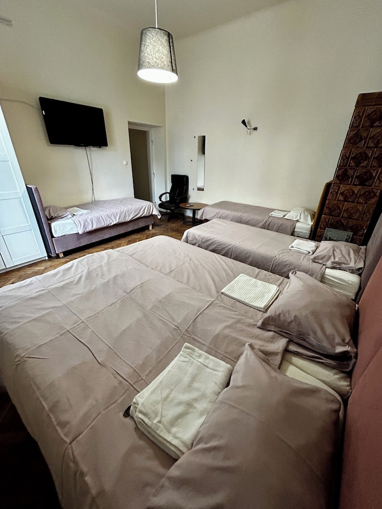Great location large bed Tiny bathroom wall 3 inches from toilet. Bad smell from pipes. Bed super hard. No pillow on 3rd bed. No AC. TV broken. Can hear others through walls.