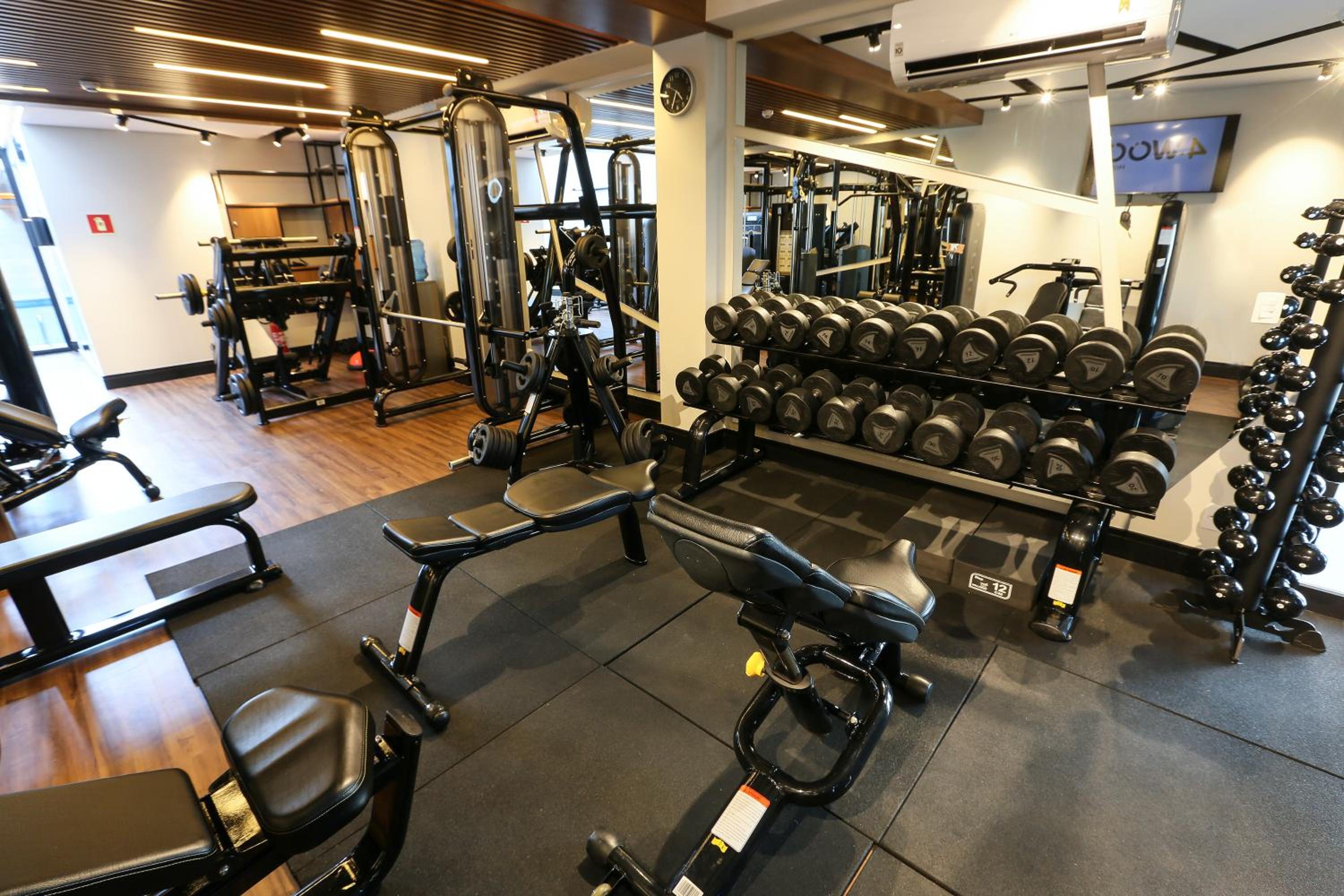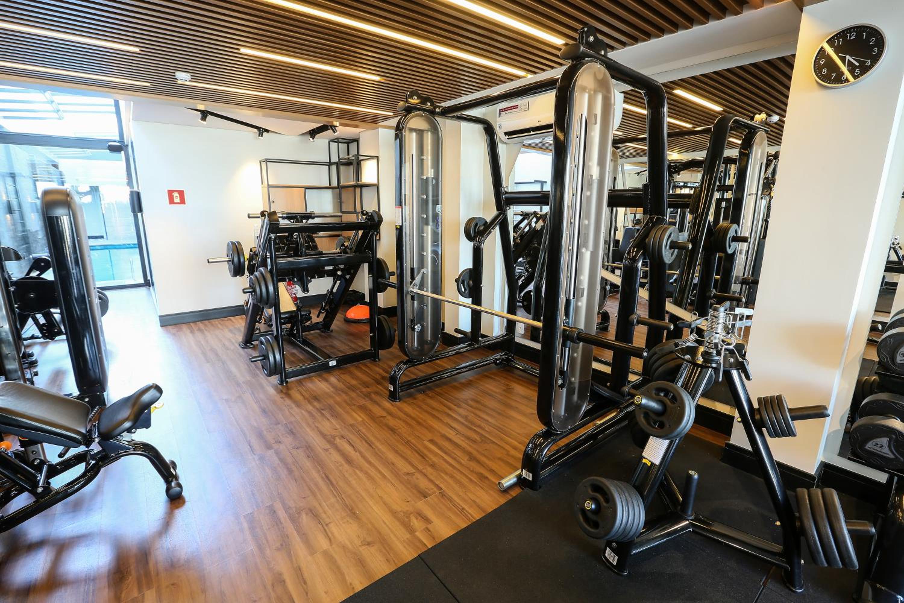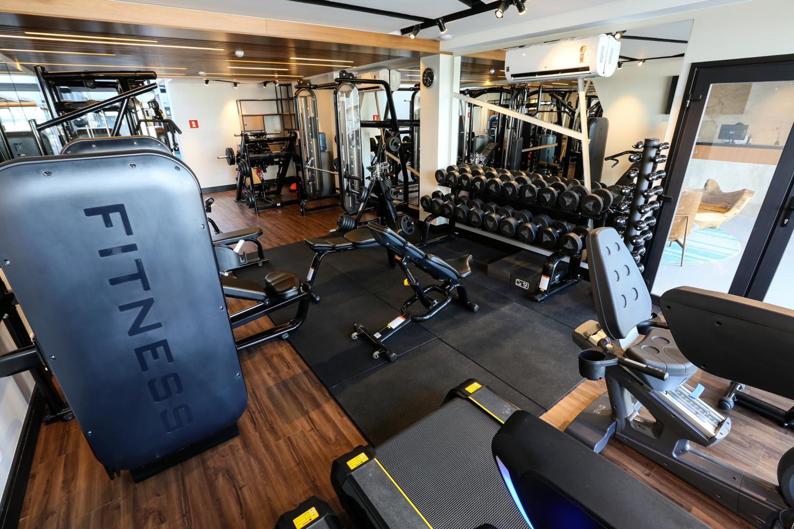 Academia com uma esteira funcionando e uma parada. Ou seja, estava sempre ocupada.