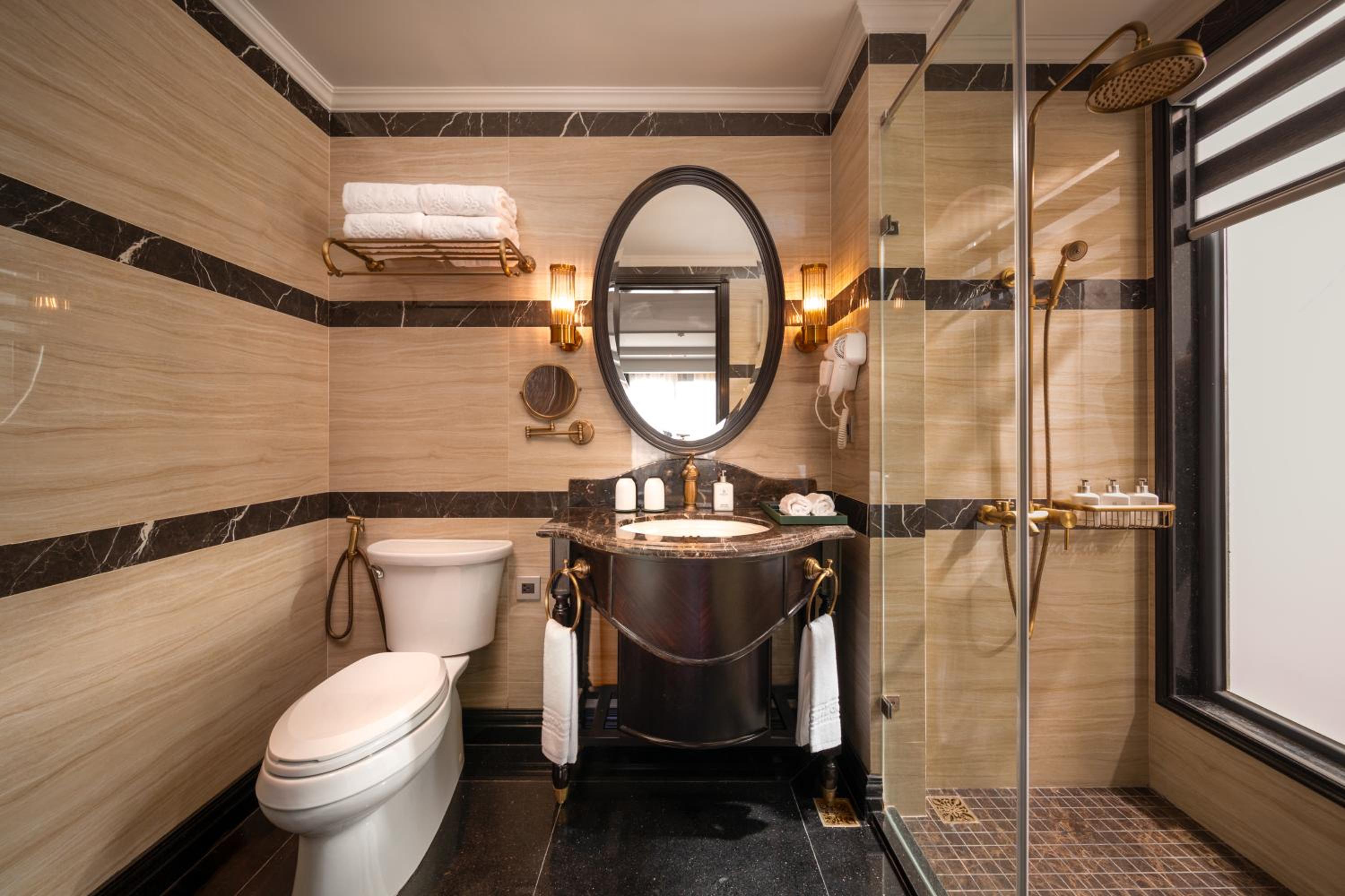 Experience comfort and convenience in the air-conditioned rooms at Meritel Hanoi, equipped with modern facilities such as a flat-screen TV, minibar, and private bathroom. The cozy bedding and plush towels add a touch of luxury to your stay.