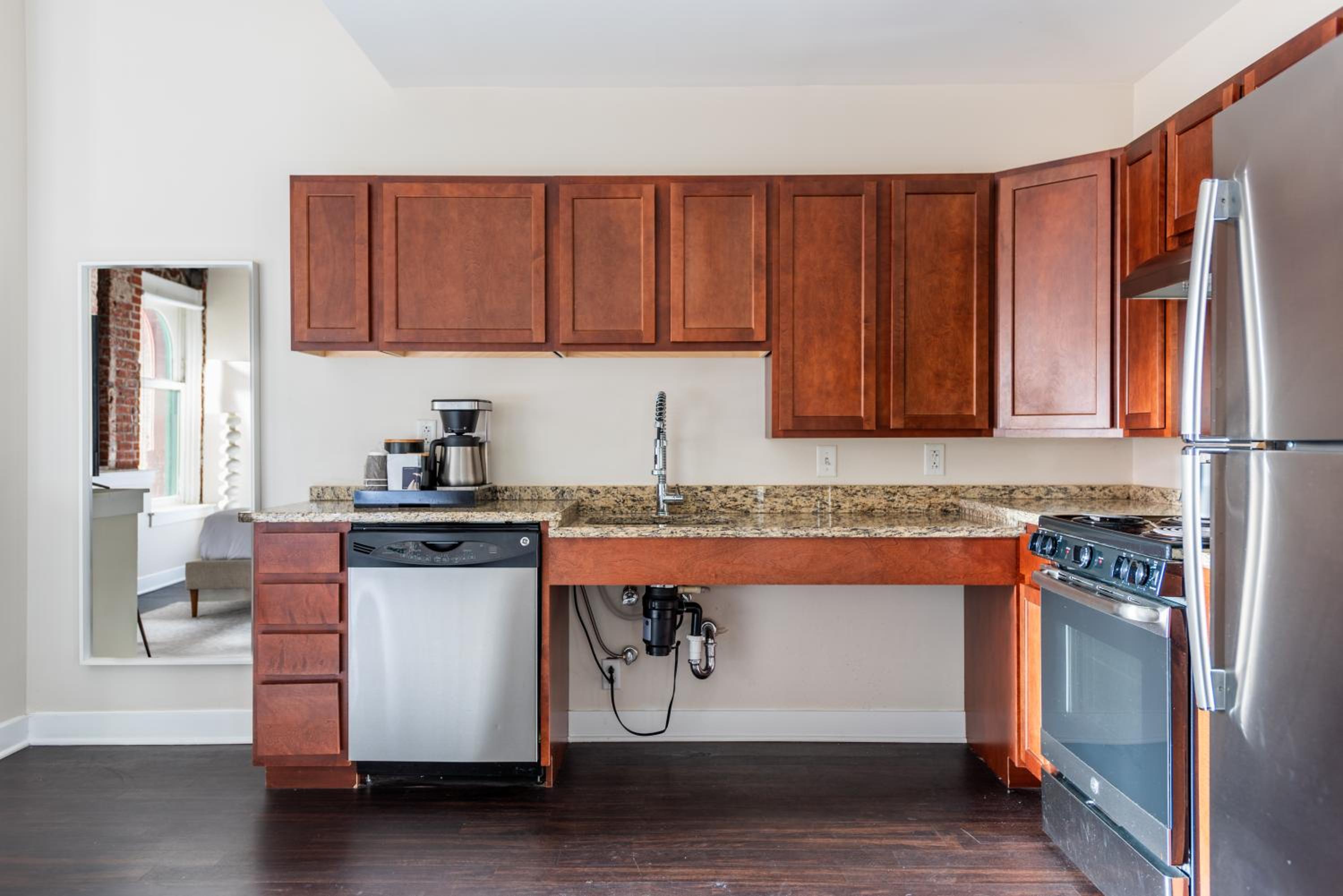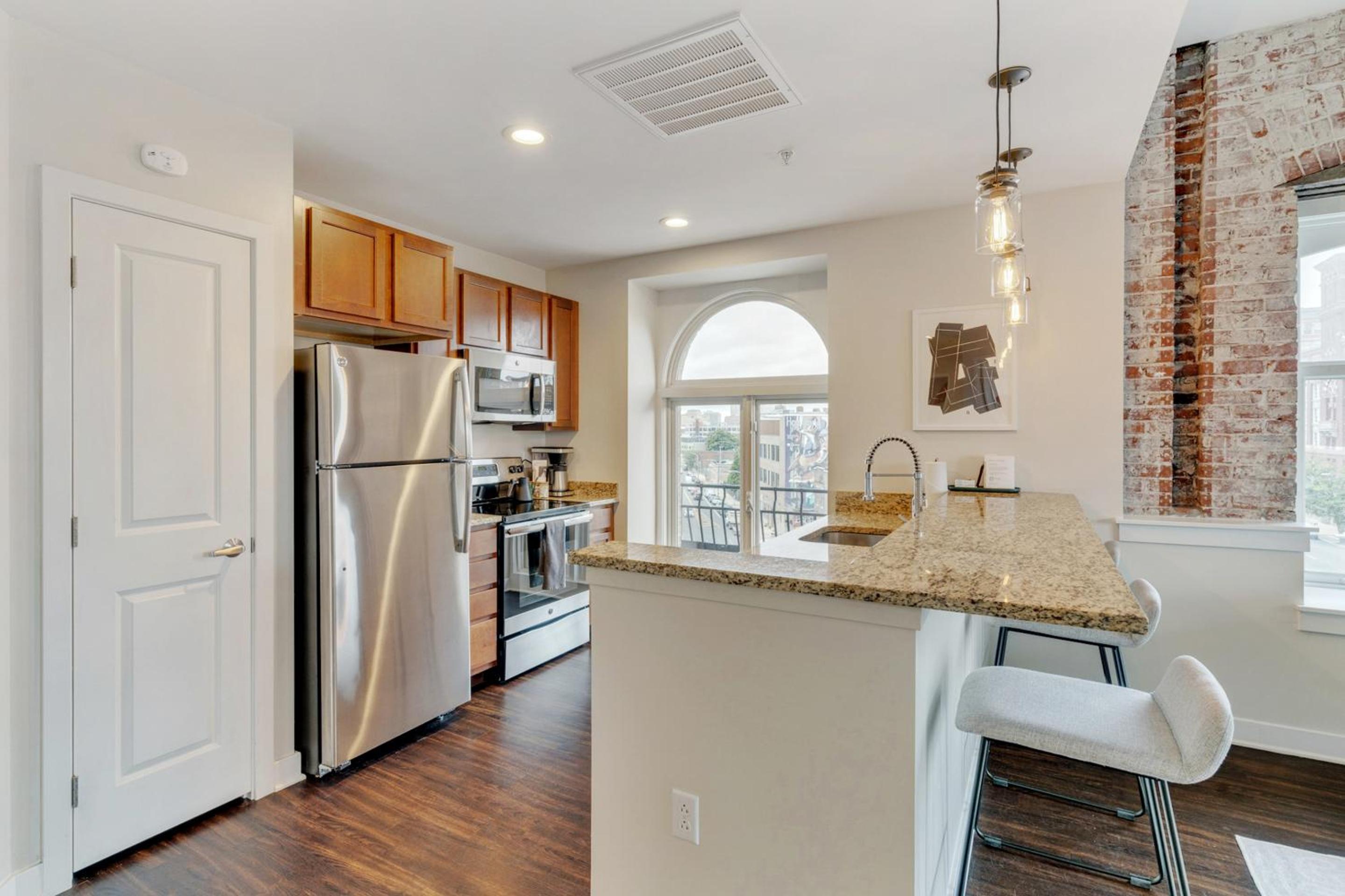 Wonderful hotel. Apartment style rooms that are large and extremely comfortable. Perfect for a short or extended stay. Staff very friendly and helpful and the pre-stay email communication was outstanding. Neighborhood is the only (slight) detraction. You can tell it’s improving but still a bit rough around the edges. However, it did not pose a problem for us (very nice coffee shop just down the street) - just something to be aware of so you are not surprised. We will definitely stay there on our next trip to Philly.