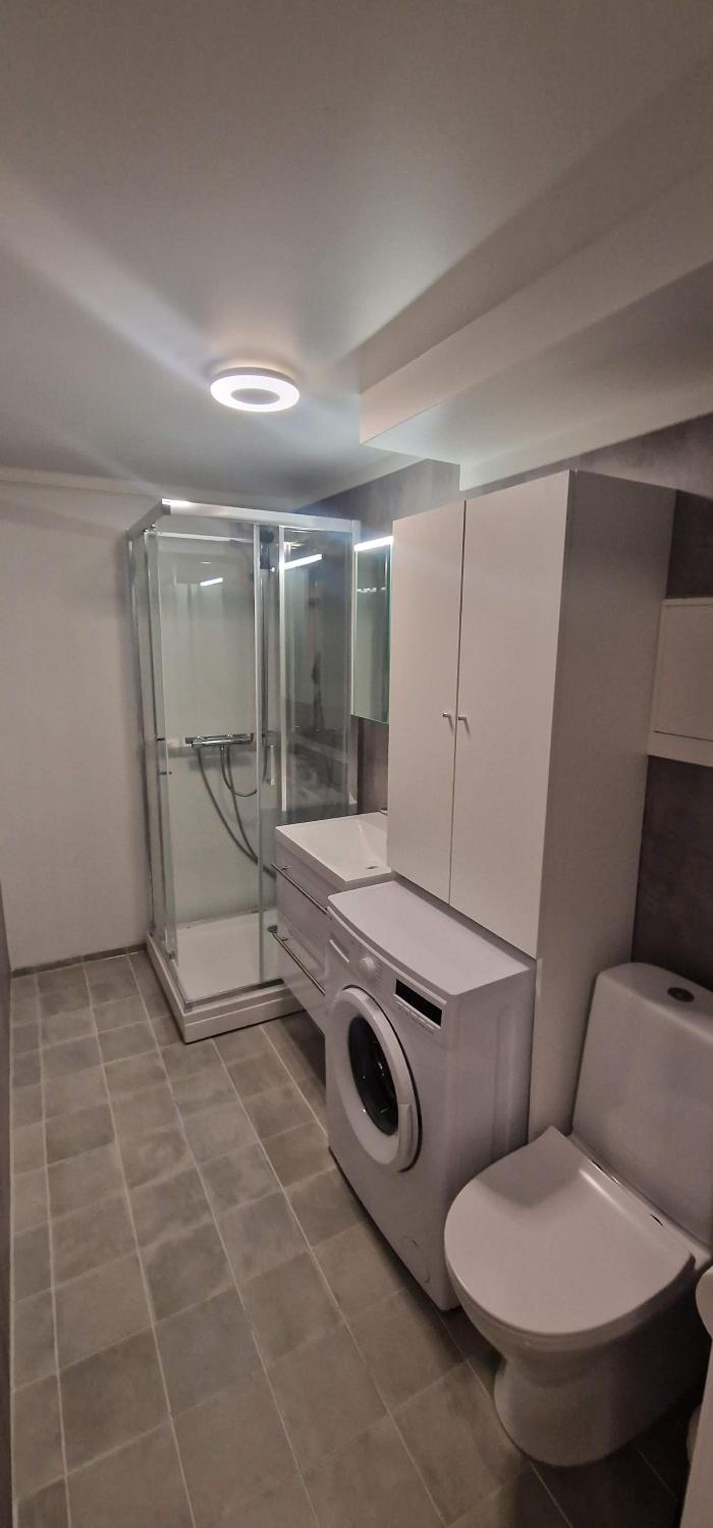 Mała łazienka z bardzo wąską kabiną prysznicową. Słuchawka prysznica cieknąca z kilku stron. Kabina prysznicowa nie doklejona do podłogi i przeciekała. Woda się lała po podłodze. Ani jednego wieszaka na ręczniki. Nie było gdzie odwiesić ręczników.