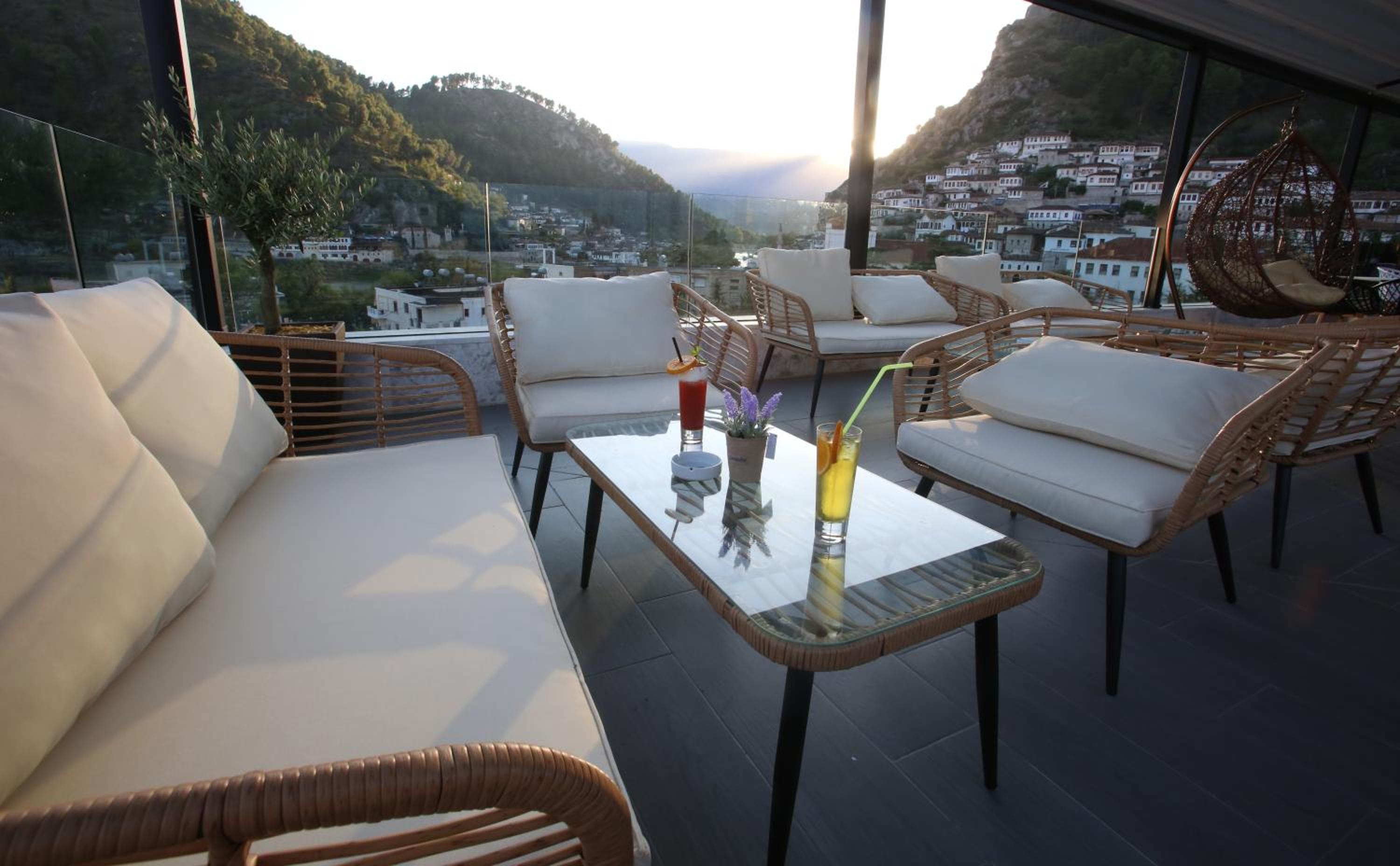 Terrace and Bar - Enjoy the stunning views from the terrace or unwind with a drink at the bar at Portik Hotel in Berat.