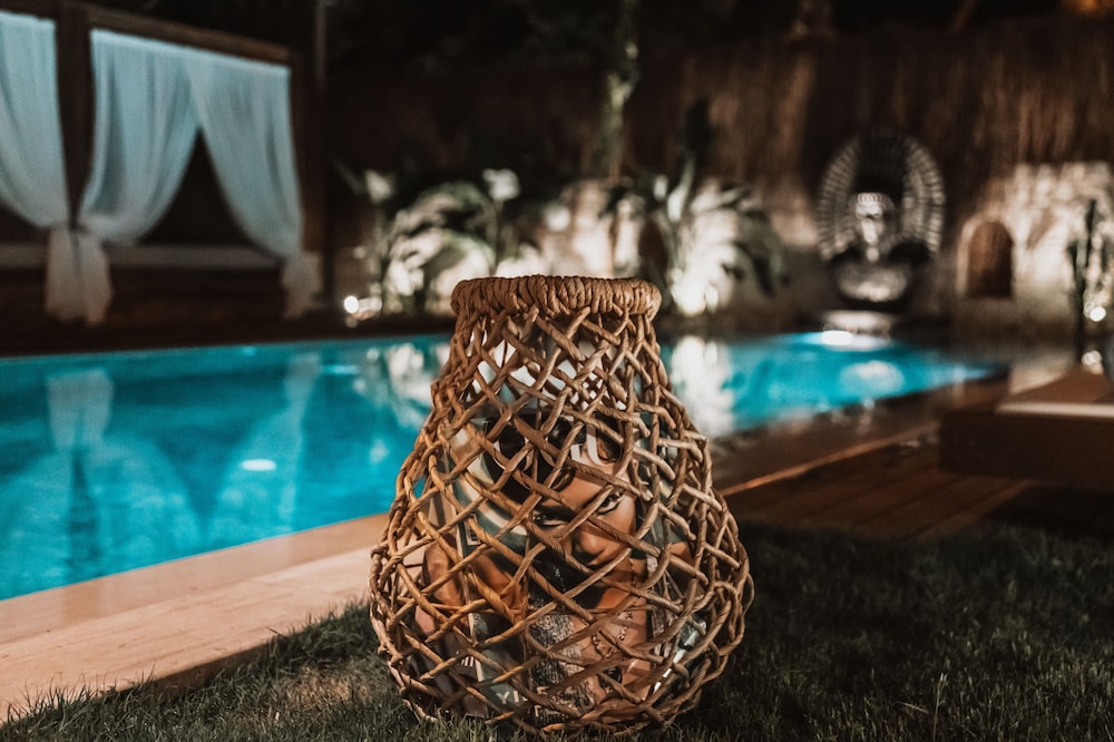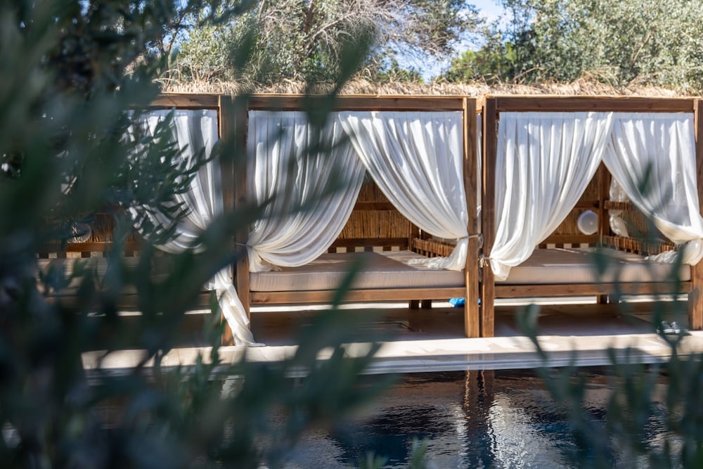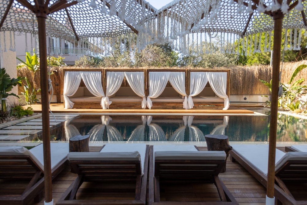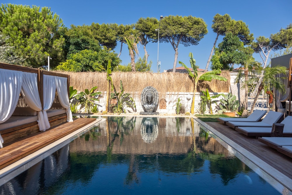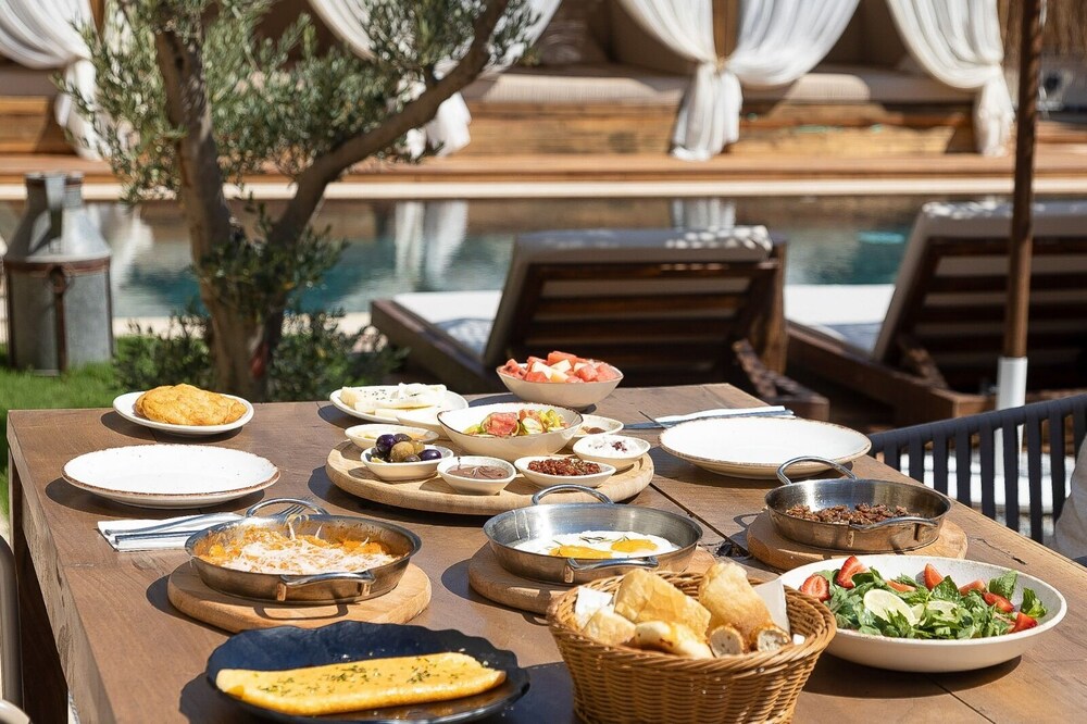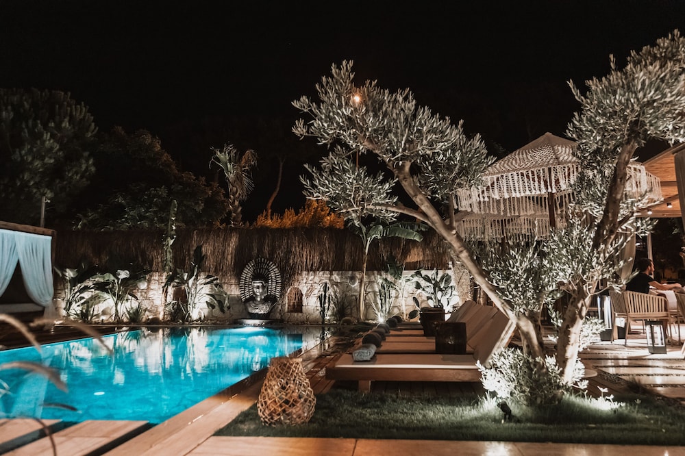 Indulge in relaxation by the outdoor pool or soak in the serene garden view at Asha Alacati.