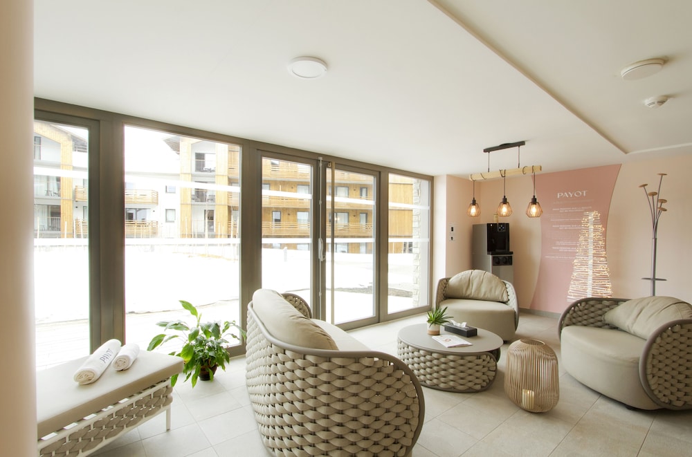 Had a small bar area with lots of seating and modern communal area. Also had a pool table. We also used the swimming pool once which was also lovely. Used the ski lockers for our equipment and a short walk to use the Alp Express cable car to take us to the ski areas or you could walk 5-10mins if preferred. Wouldn’t hesitate to recommend!