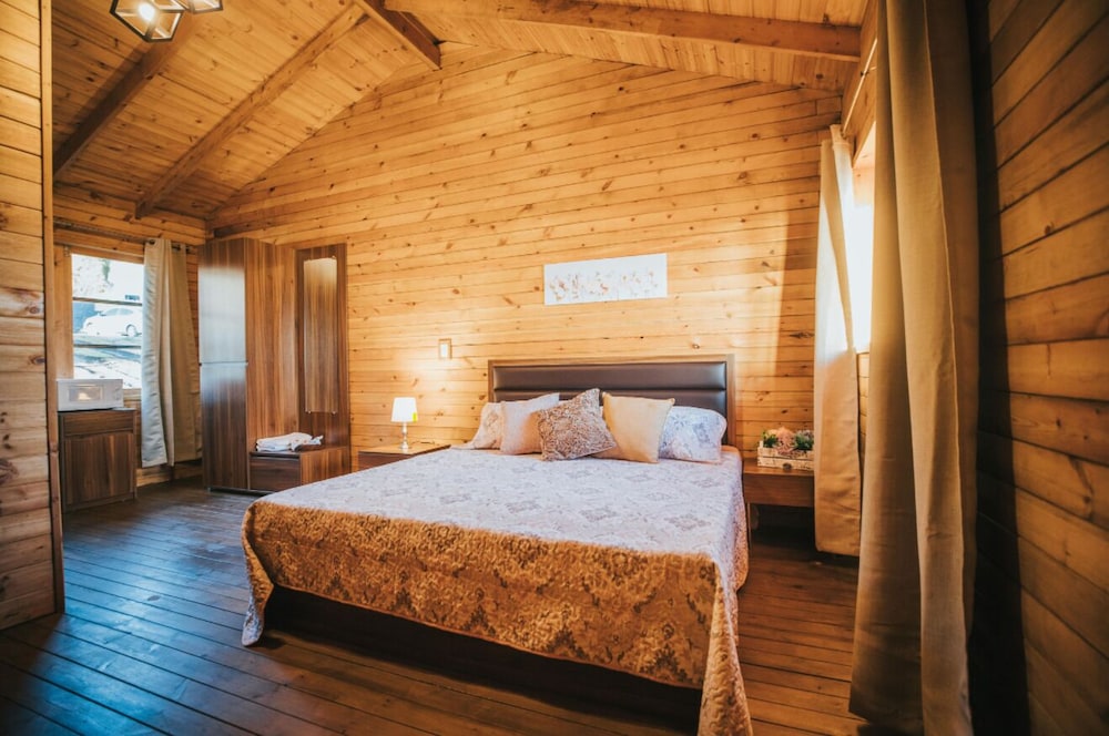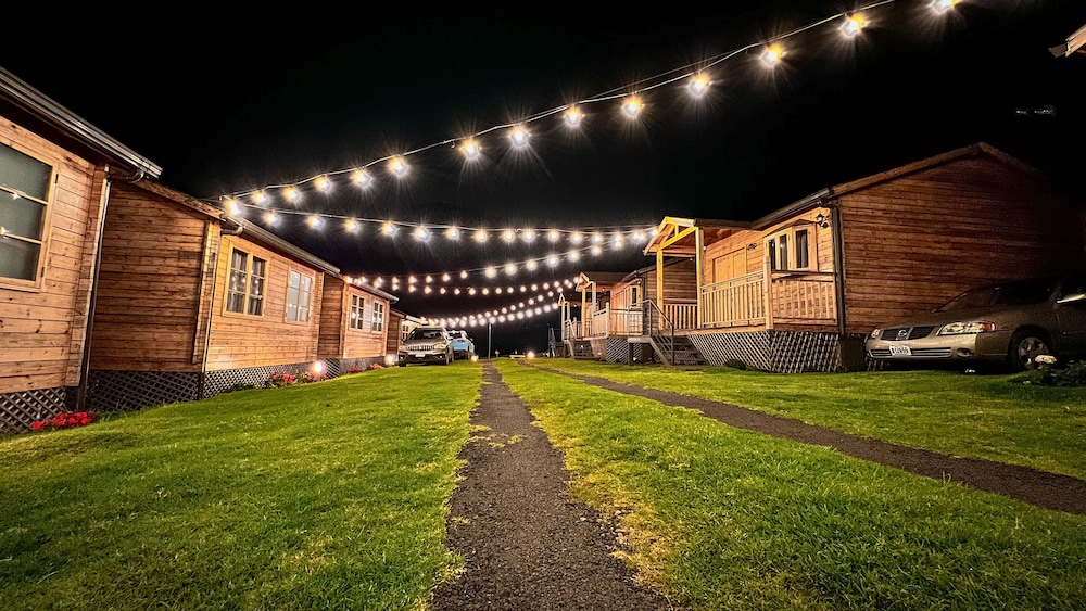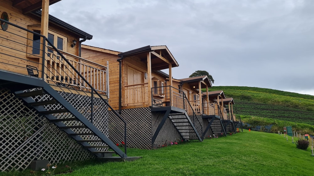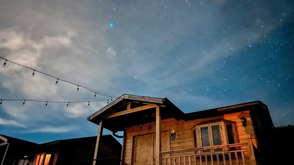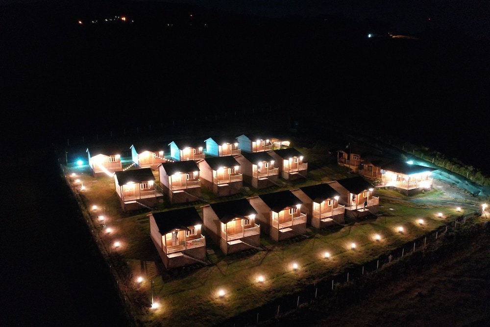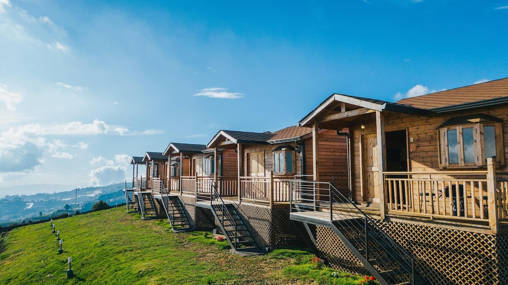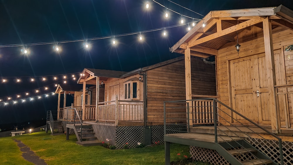 One of a kind view, with nice and cozy wooden cabins..