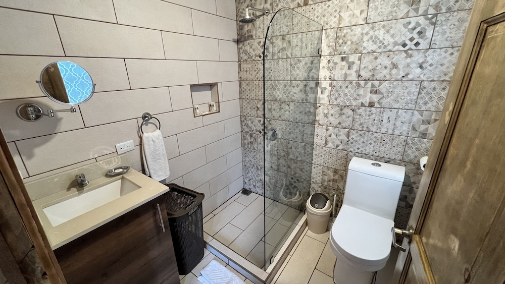 Room was spaceous with firm bed and several seating options. Shower is a rain head with no door, so splashes the bathroom.