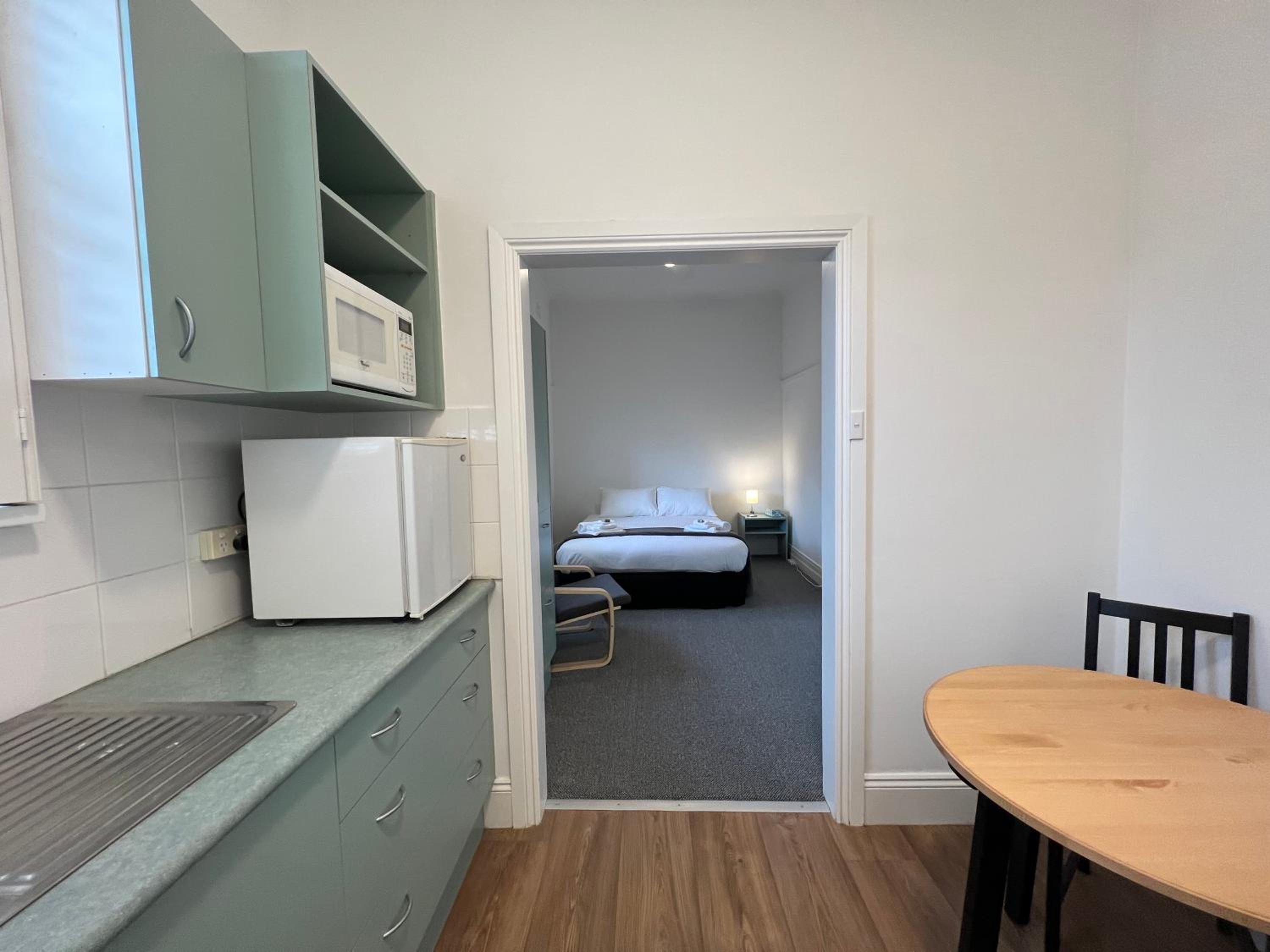 Whilst the bed was comfortable the doona cover had large brown stains. Neither of the two bathrooms that I used had hand cleaning products. The single bedroom was hot and airless. The aircon took 2 or 3 hours to cool the room and had to be left on all night. The TV was approx 8 feet high on the top of a tall cabinet. The staff were polite but not helpful. There is no commune room and contrary to advertising there are no kitchen facities and no access to a microwave.