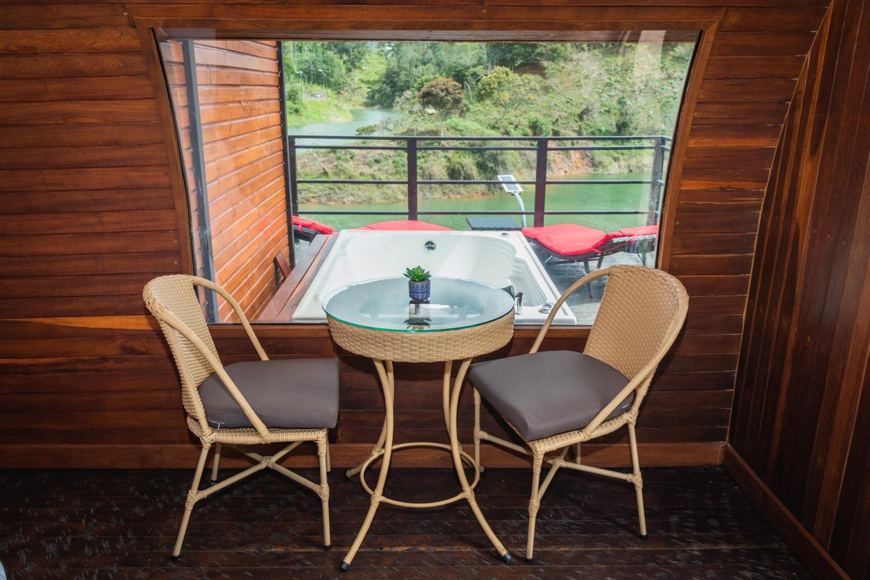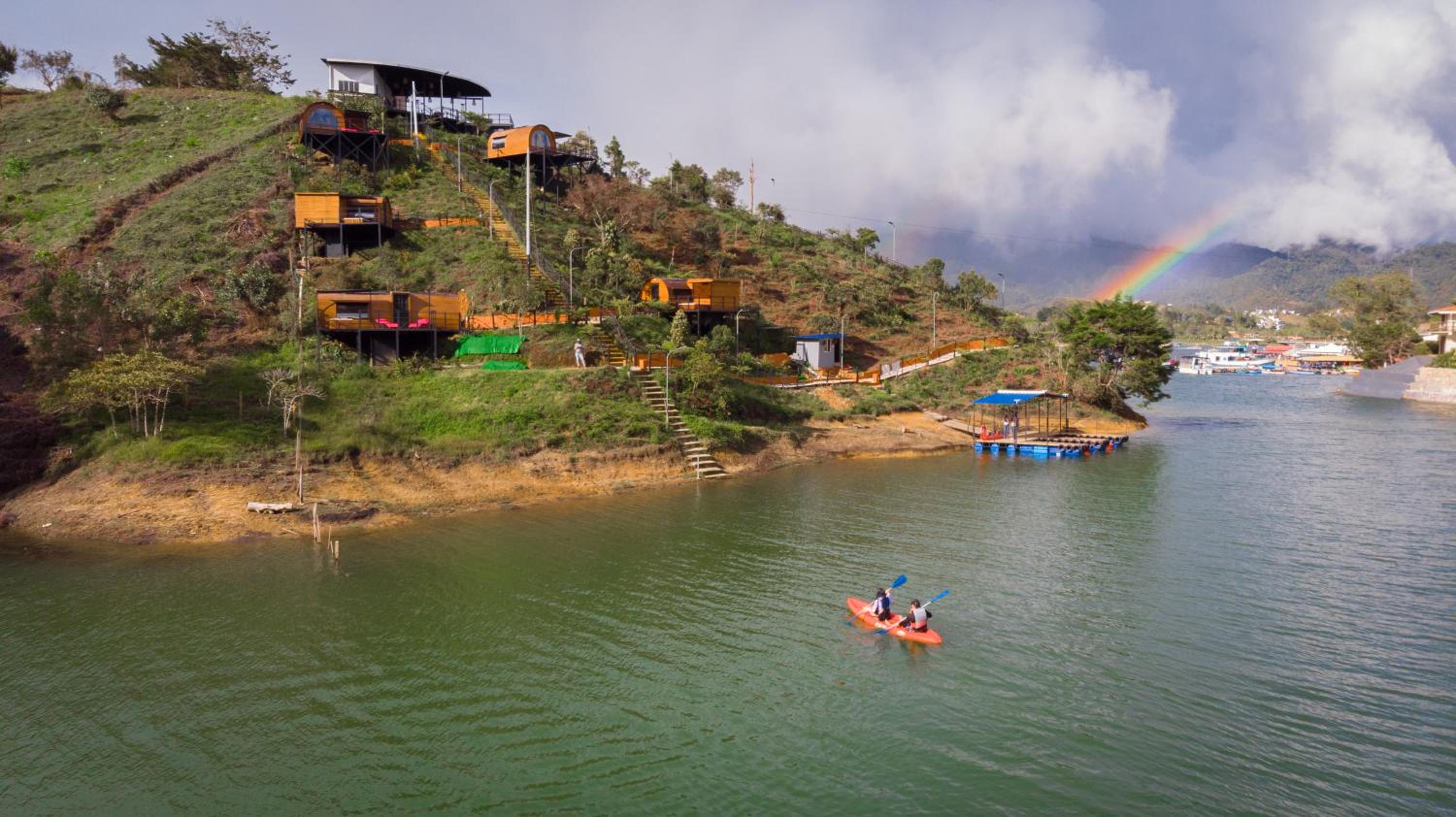 However, brutal steps to climb, very uneven, with often no handrails. No boat was necessary (maybe dry season). Cabins facing wrong way, as despite pictures on site, you are faced with looking directly over town of Guatape, and NOT the mountains, no night sky or stars viewable which was what we wanted to experience. So that was a disappointment for us. Had most expensive dish on menu which was tepid and very tired - sure it was just shipped in. Very different experience to breakfast. So in conclusion, worth what we paid but not a real Glamping experience.