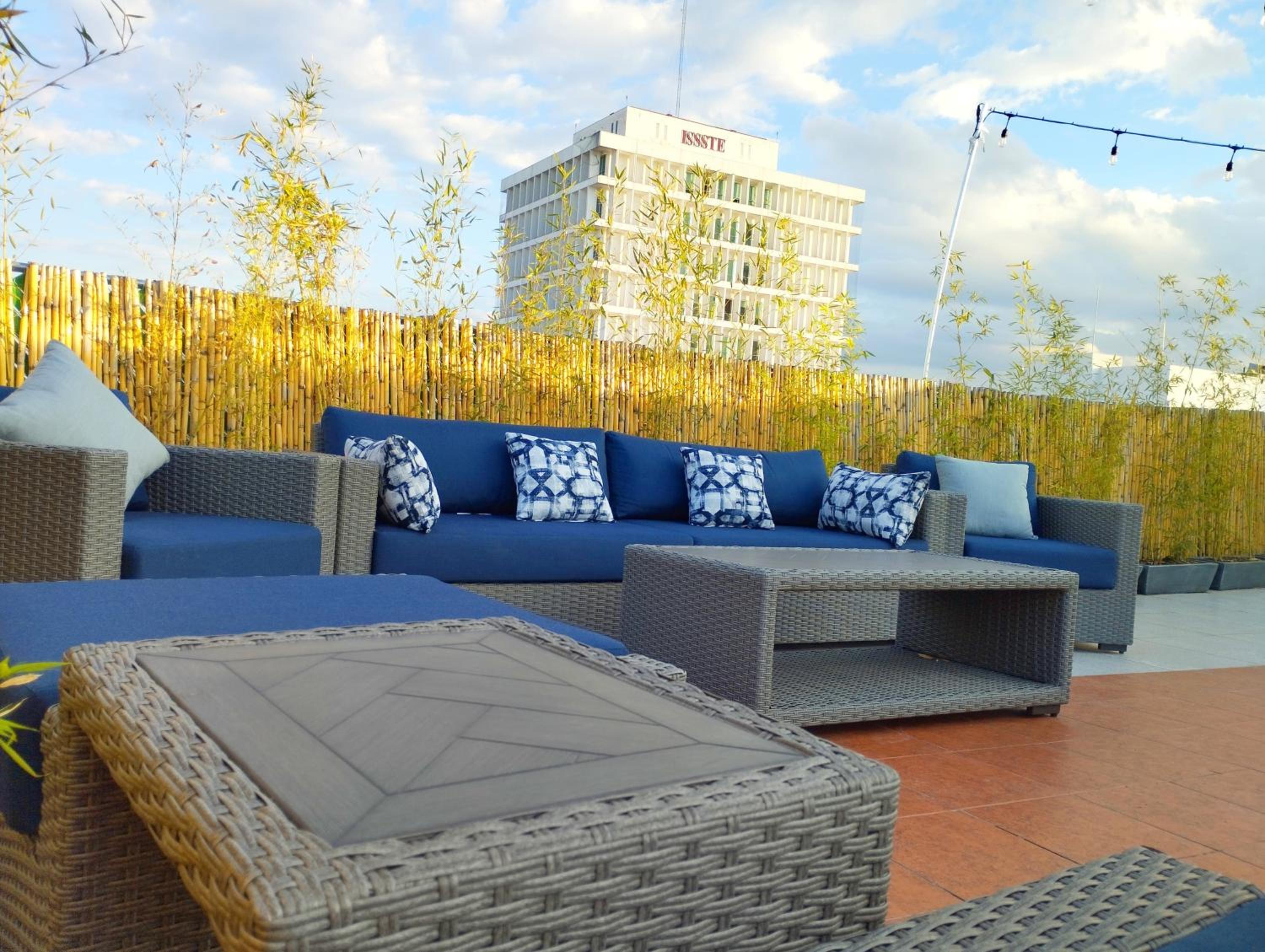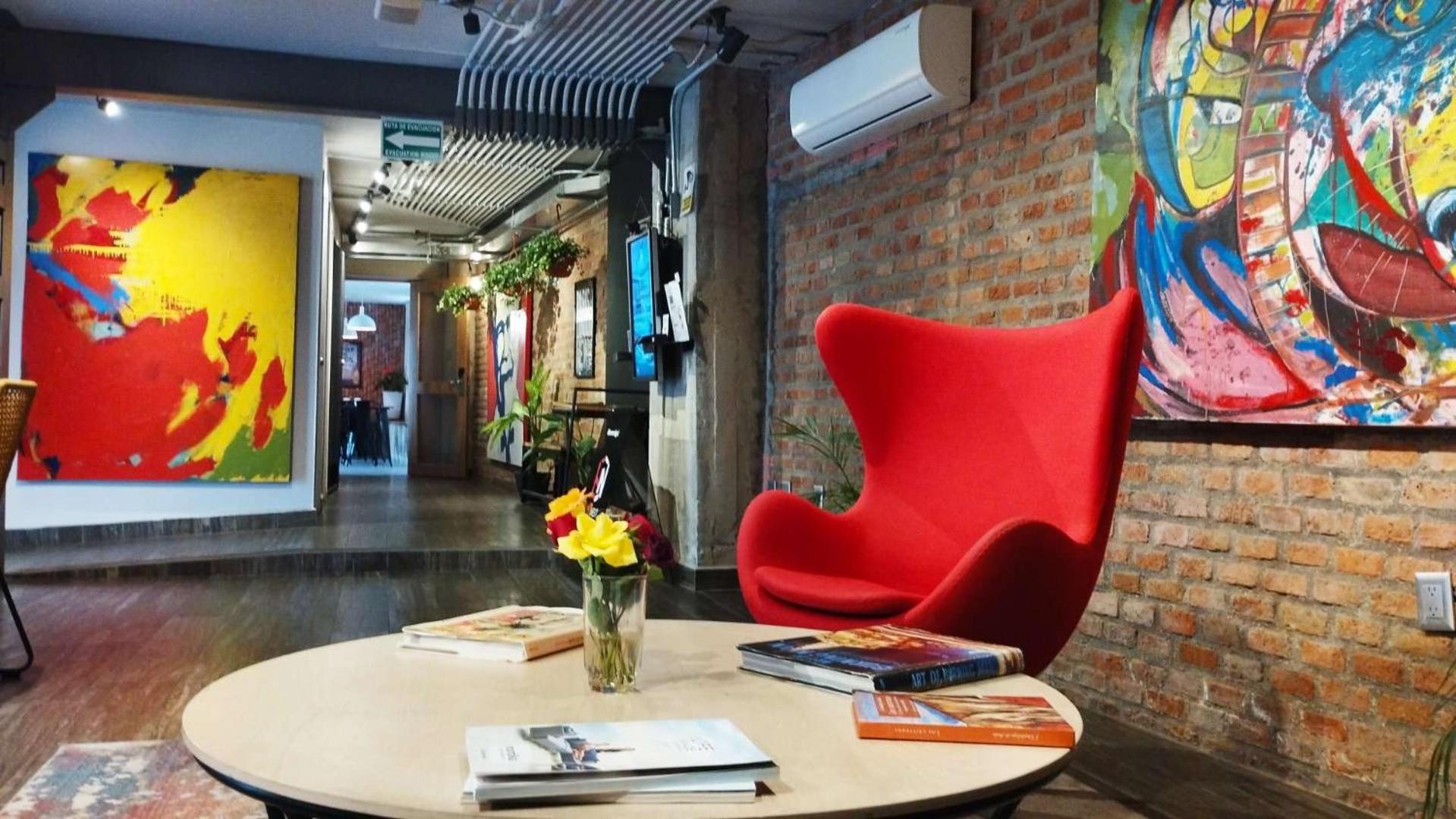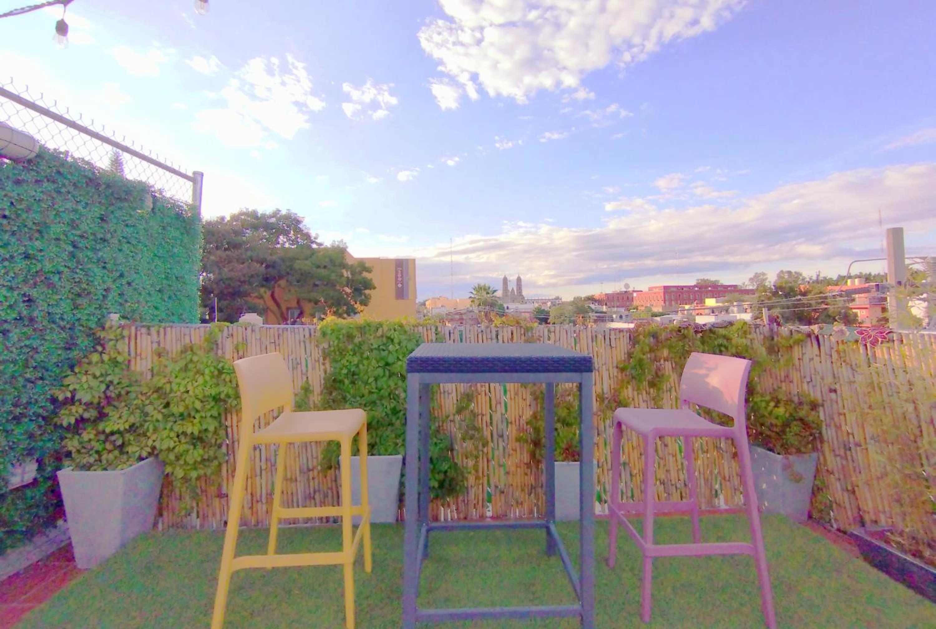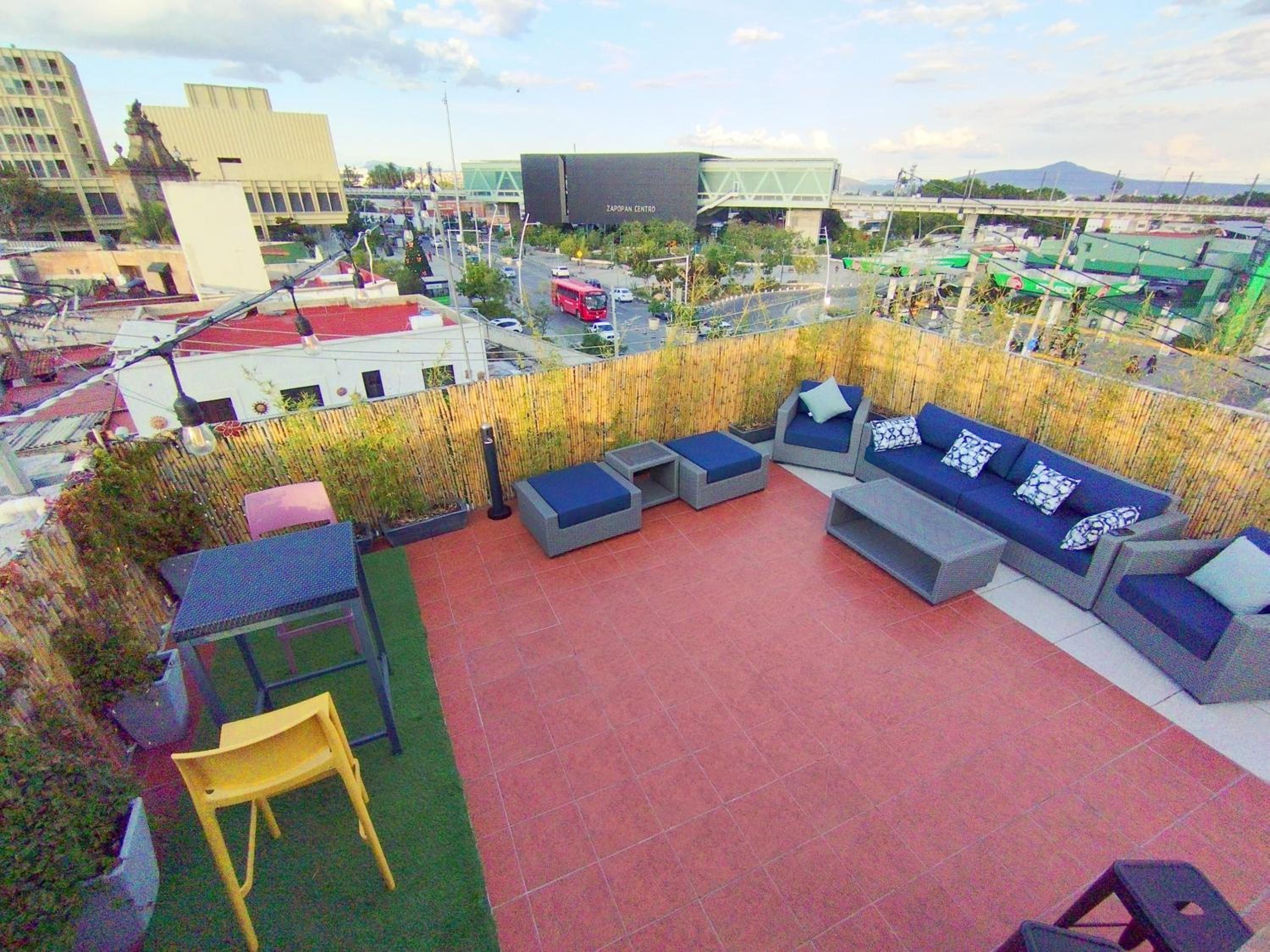 Está junto en centro de Zapopan y el tren elevado, así que muy buena ubicación. Las habitaciones son pequeñas, pero tiene varios espacios para platicar y tomarse algo.