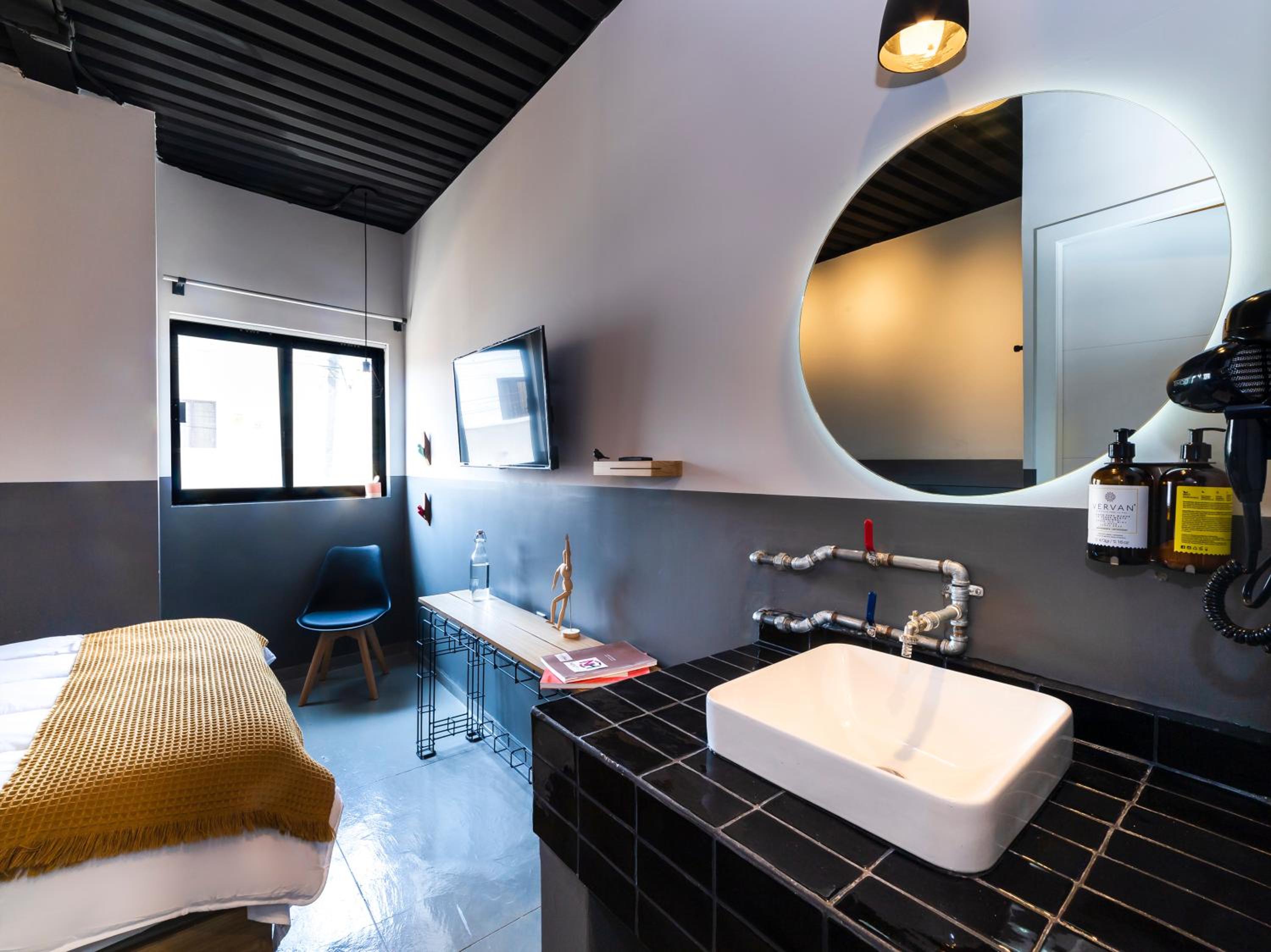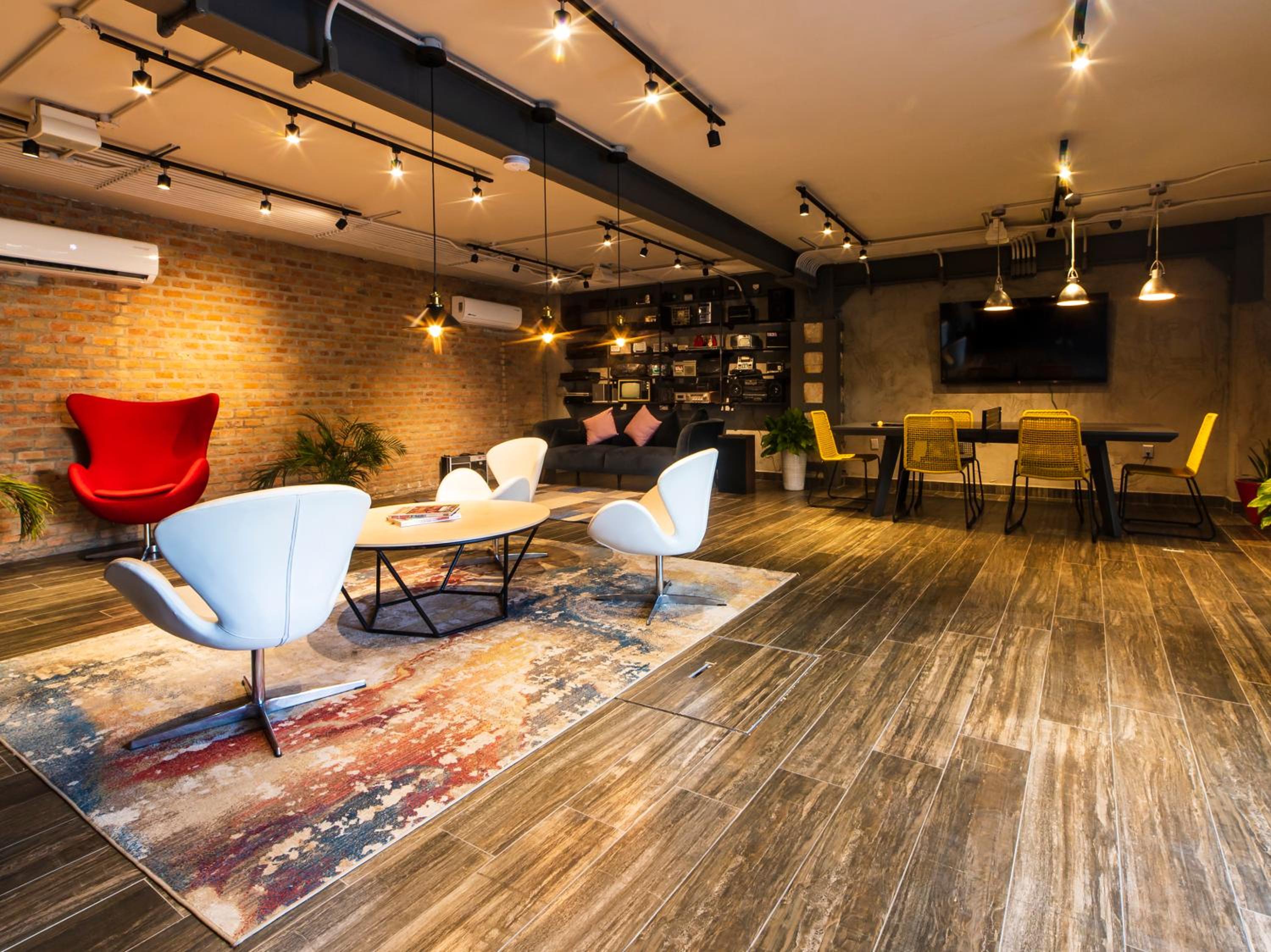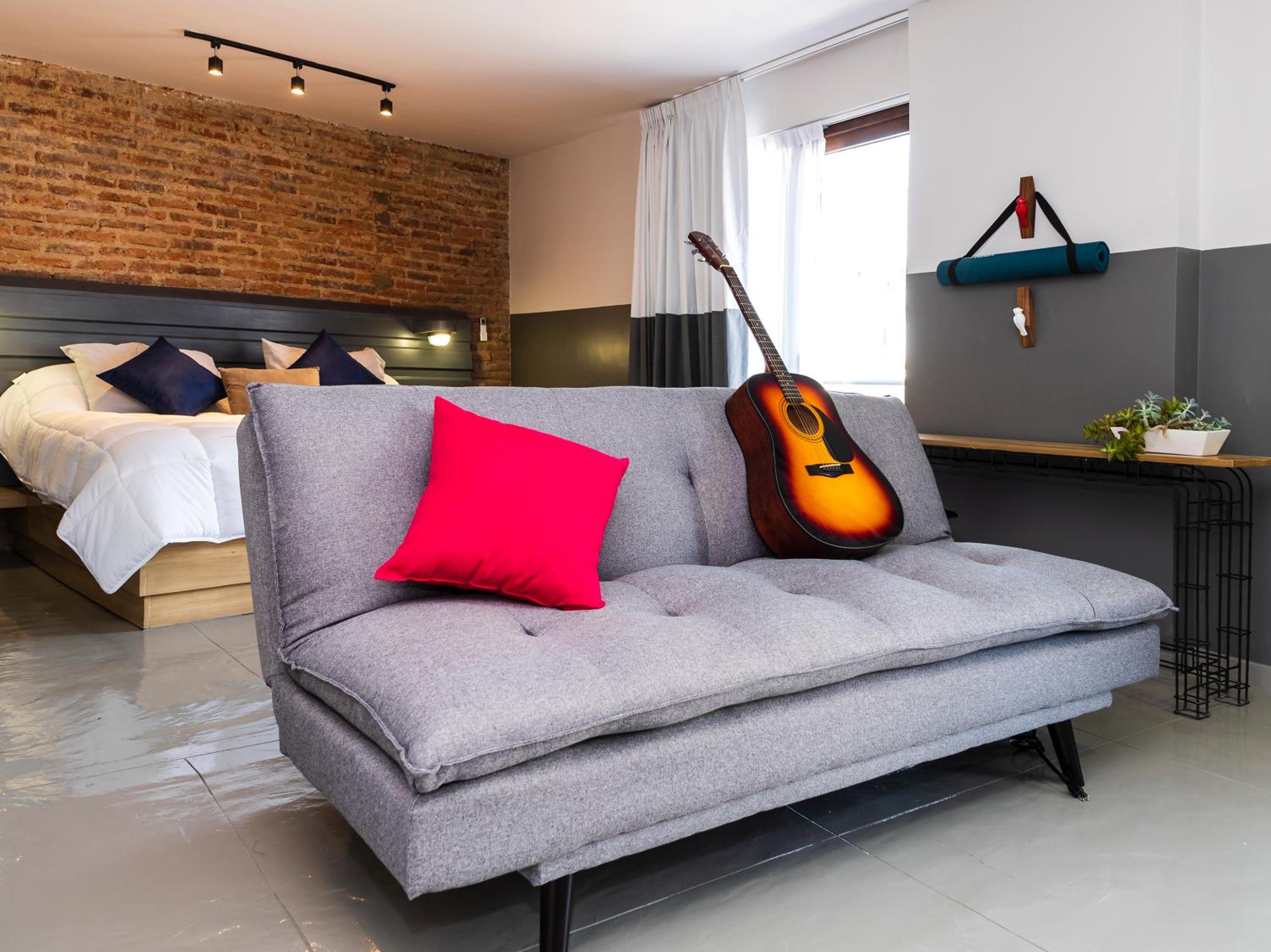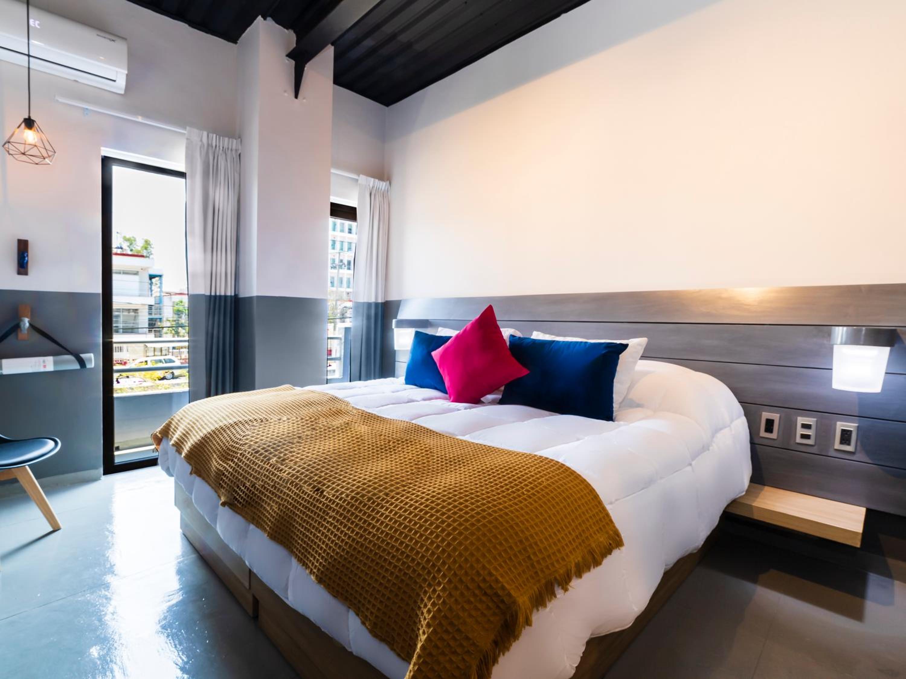 Está junto en centro de Zapopan y el tren elevado, así que muy buena ubicación. Las habitaciones son pequeñas, pero tiene varios espacios para platicar y tomarse algo.