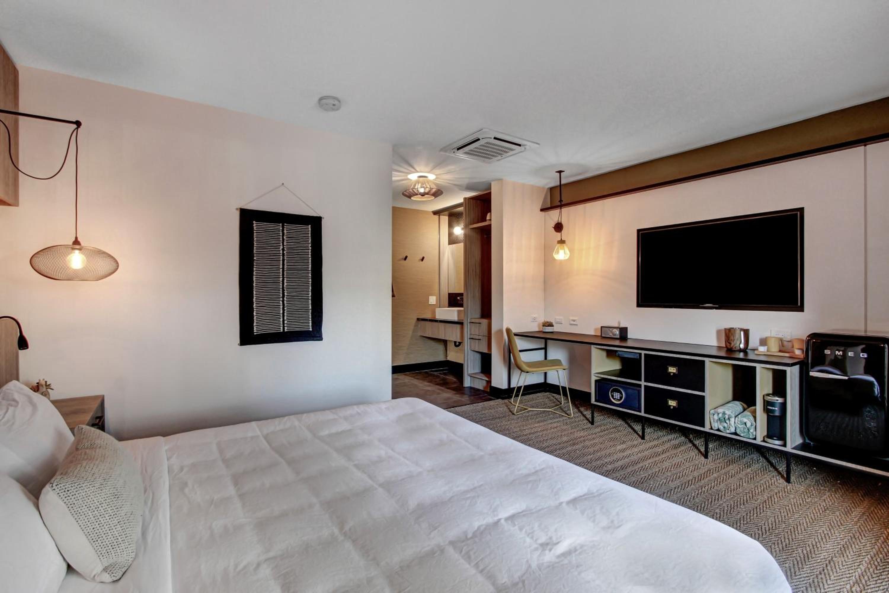 Nicely decor! Loved the pool area with palo verde flowers floating in the pool! Magical. Seltzers in the frig and reverse osmosis water poolside were great touches. Clean and newer room, secure parking in rear was nice when traveling with bikes.