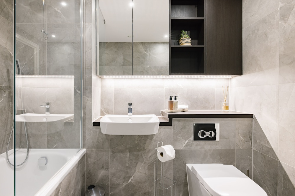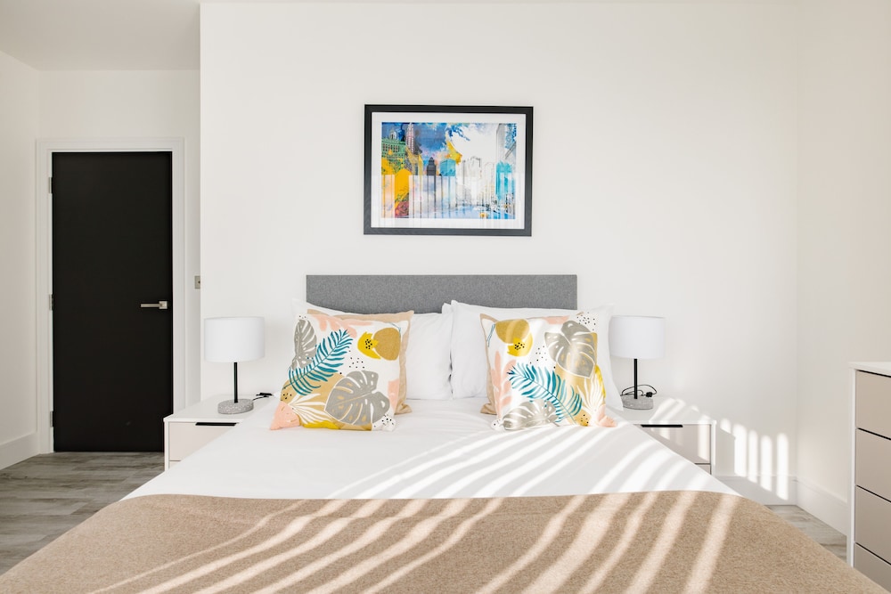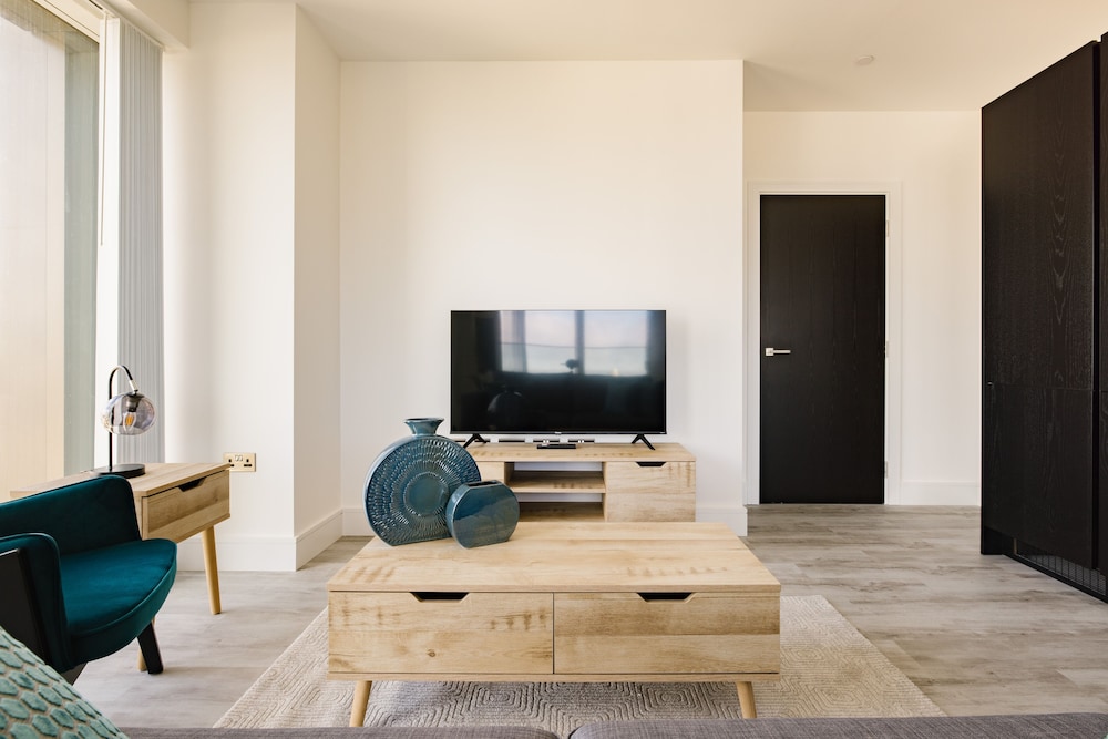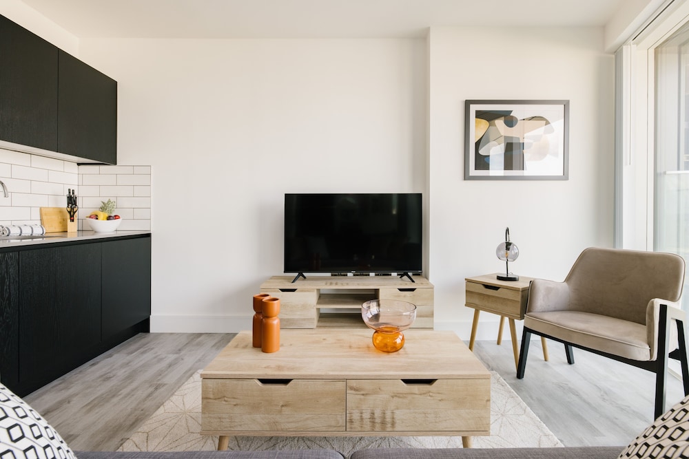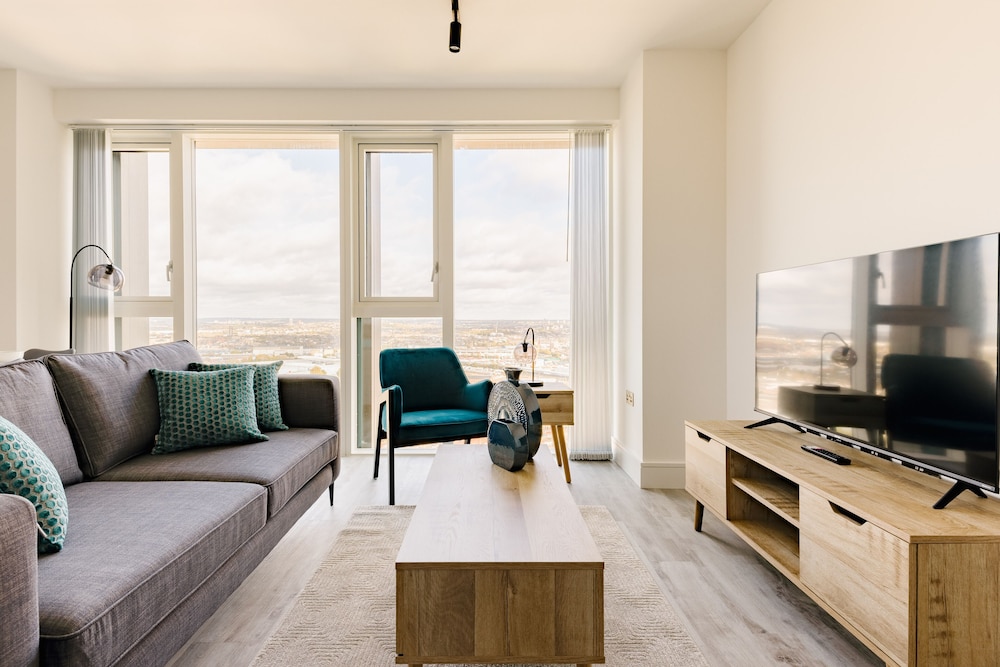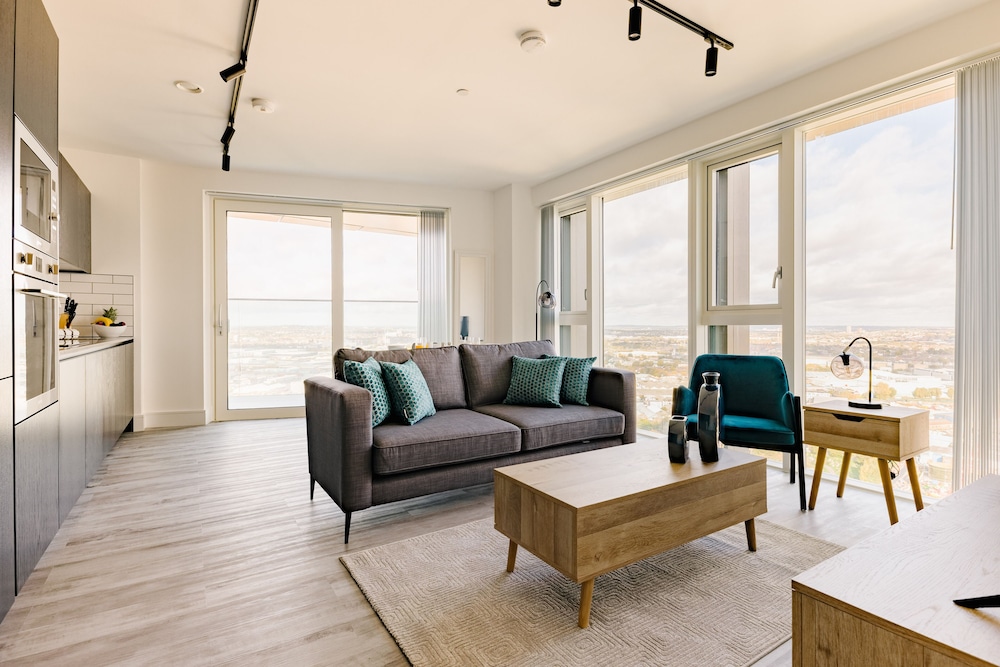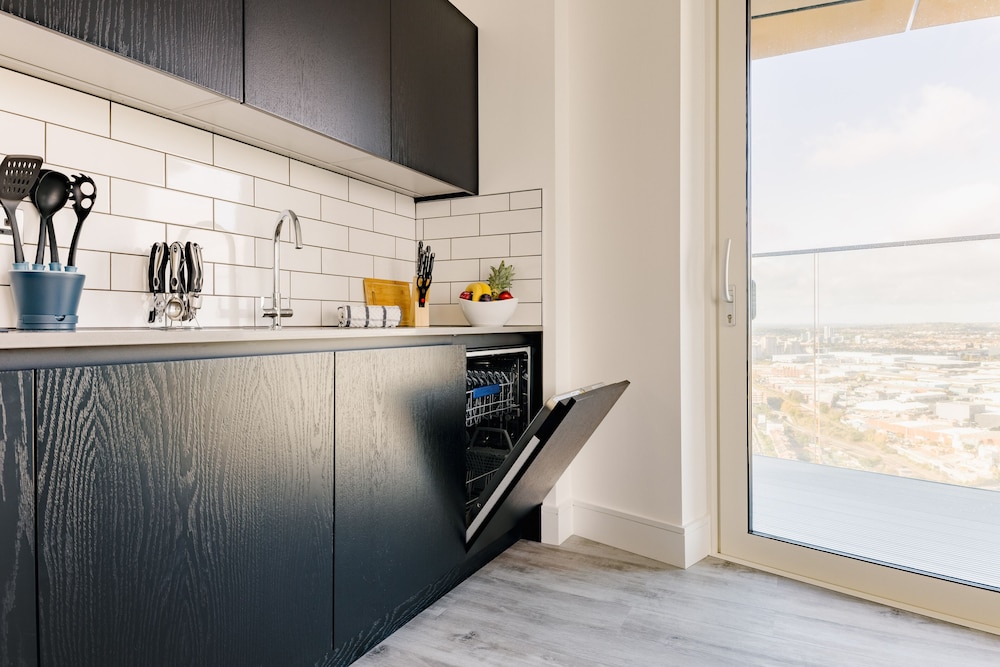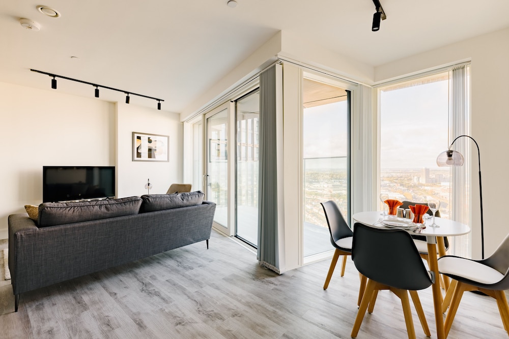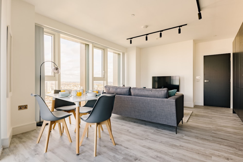 Excellent place to stay! Apartment is very clean, modern and spacious with everything you need for a comfortable and relaxing stay. All appliances including washing machine are of good quality. TV, streaming services & broadband. The views towards the city are amazing. I could happily sit and enjoy the view all day!! We were on the 44th floor with balcony (though we weren’t brave enough to use it!) Communication with the host was good and we were met by a nice lady at the reception who showed us how to use everything in the apartment. There are supermarkets nearby and tube station with trains to central London.