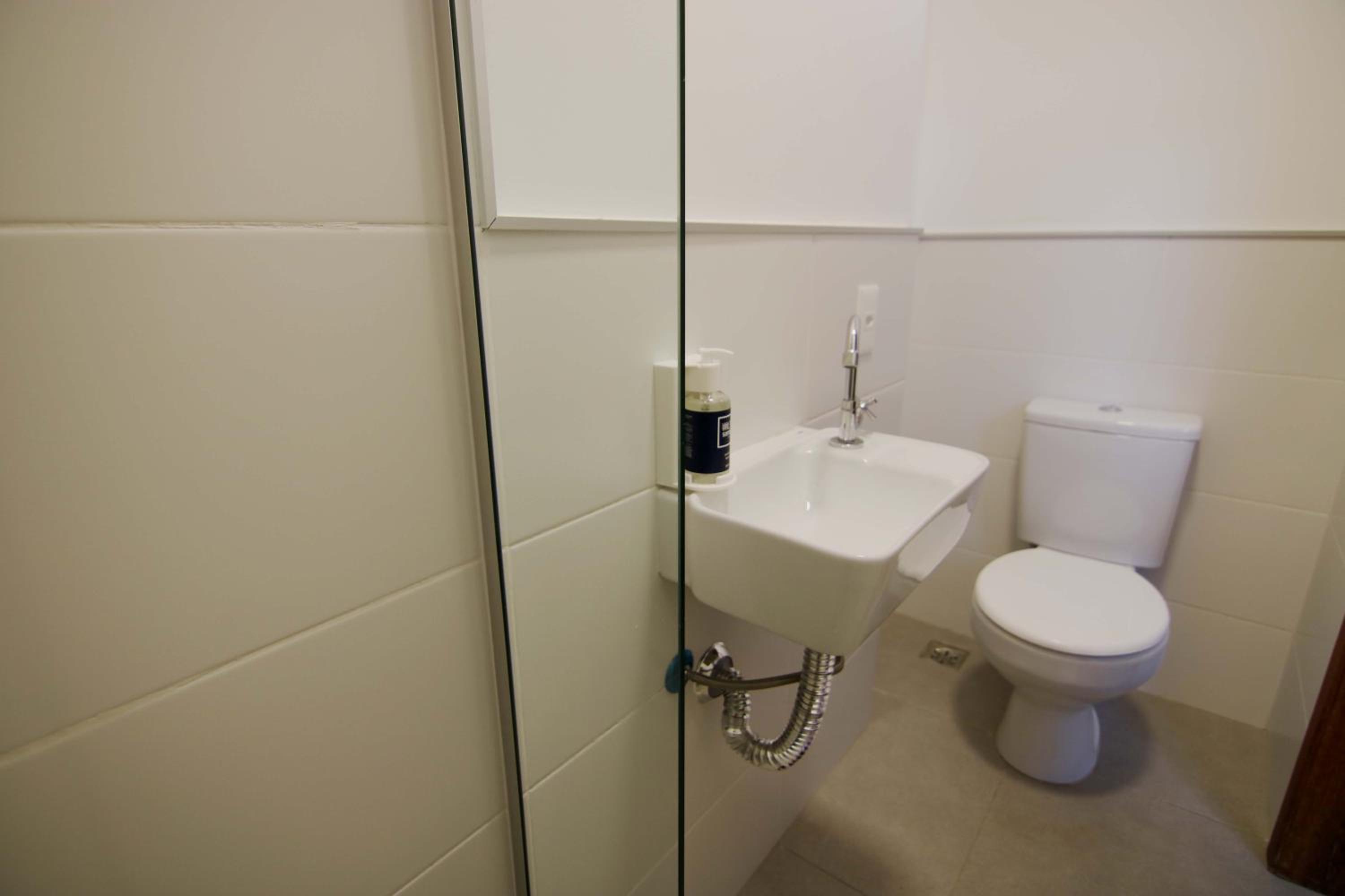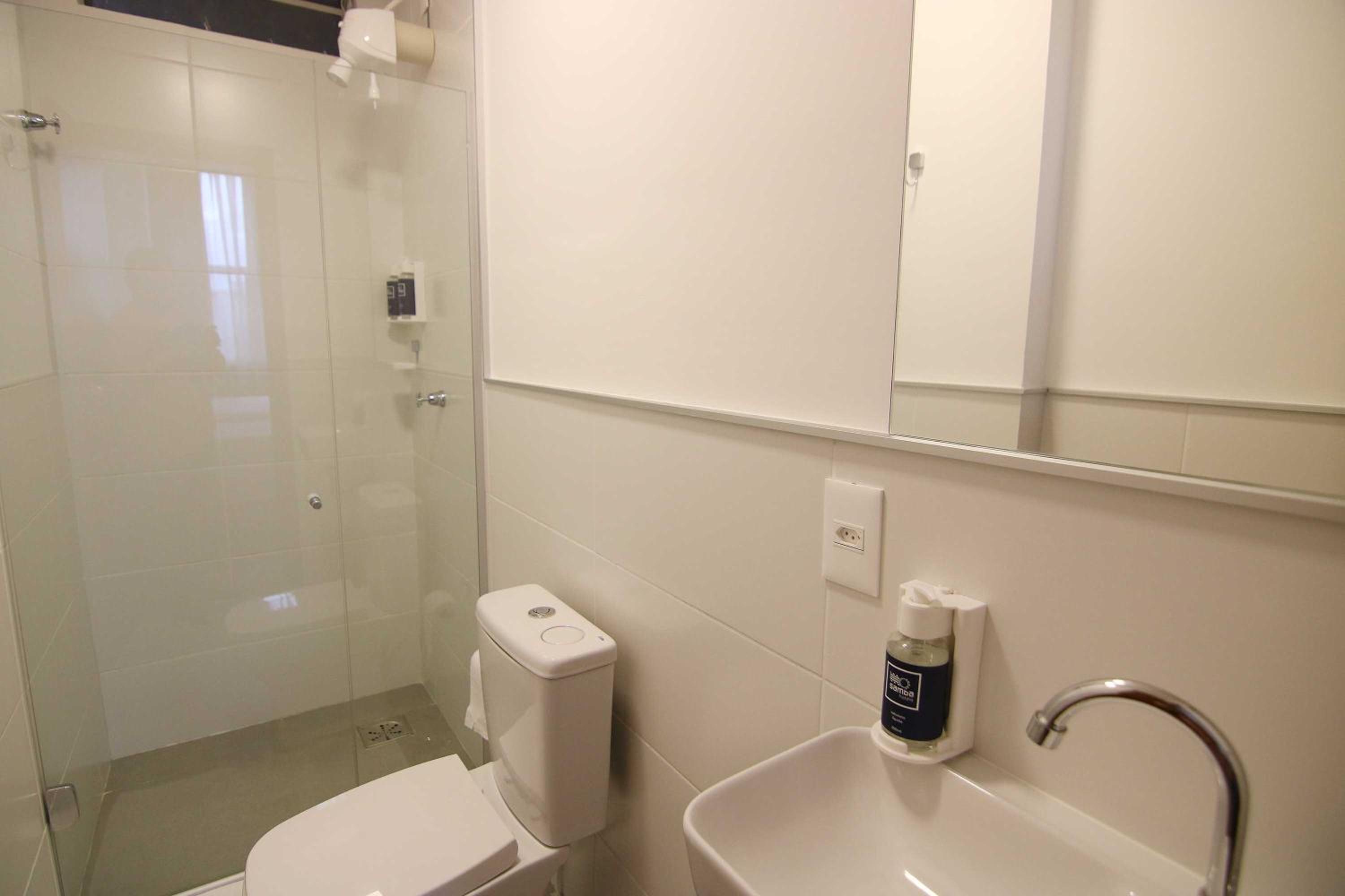 Sabonete e shampoo líquido disponibilizados em dispenser.