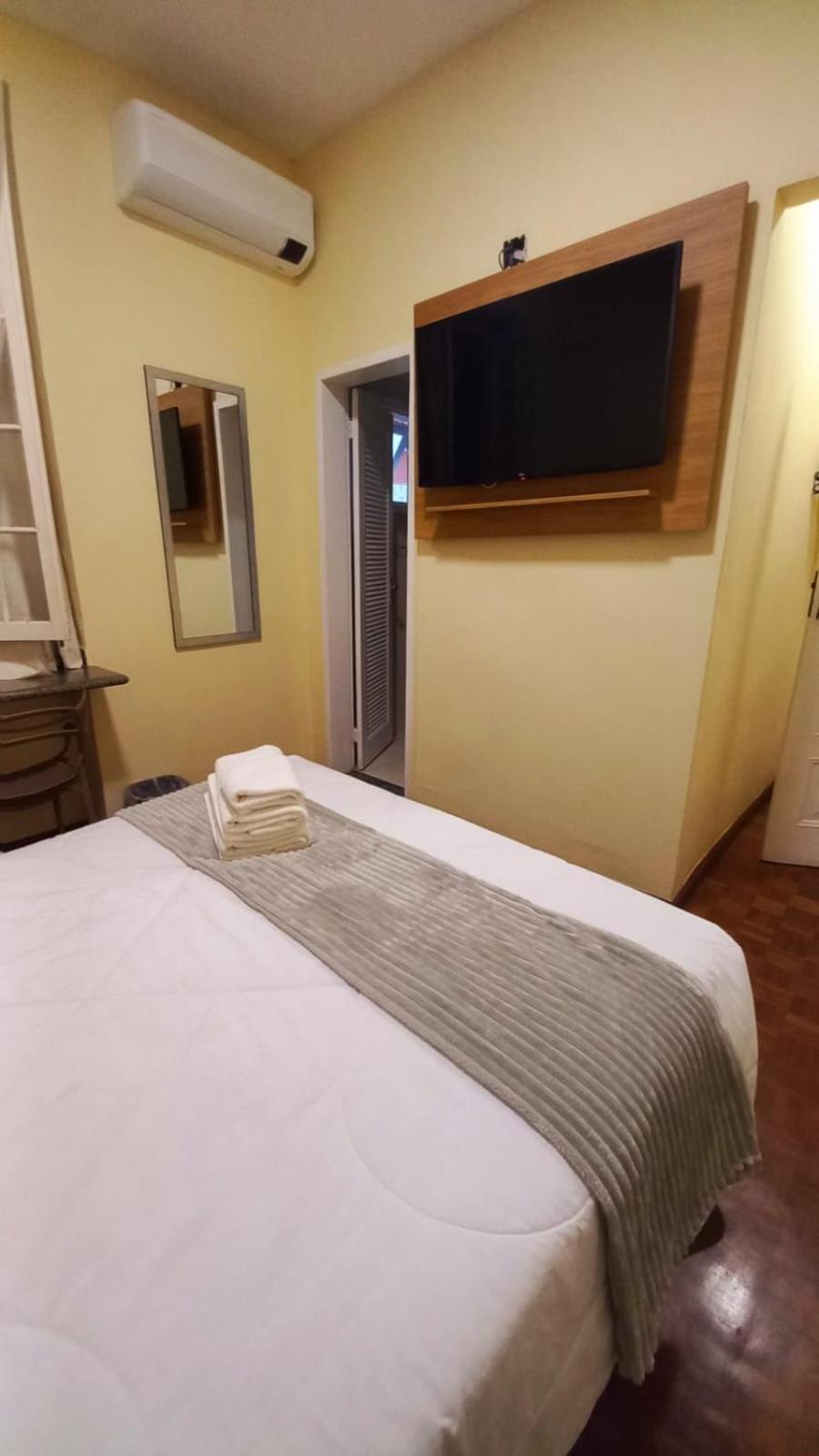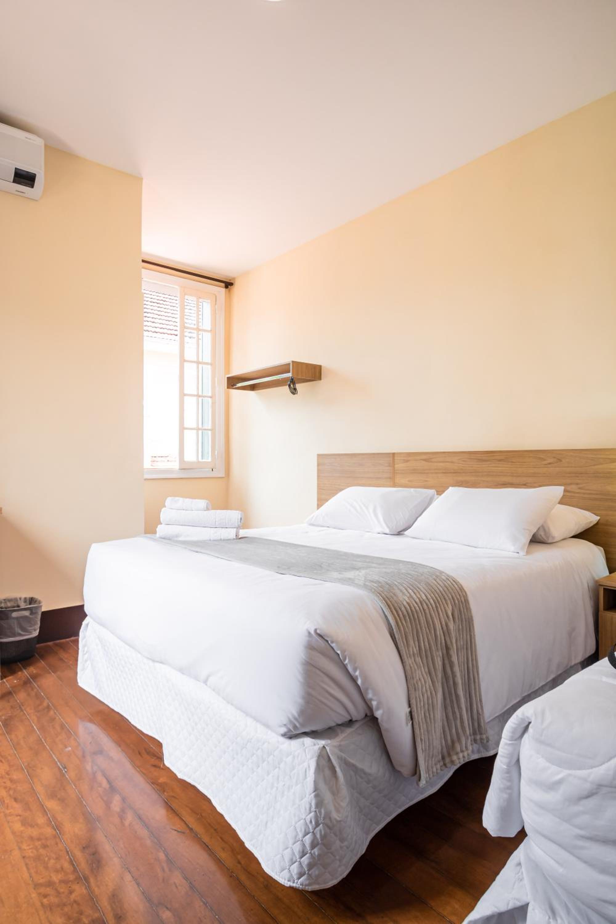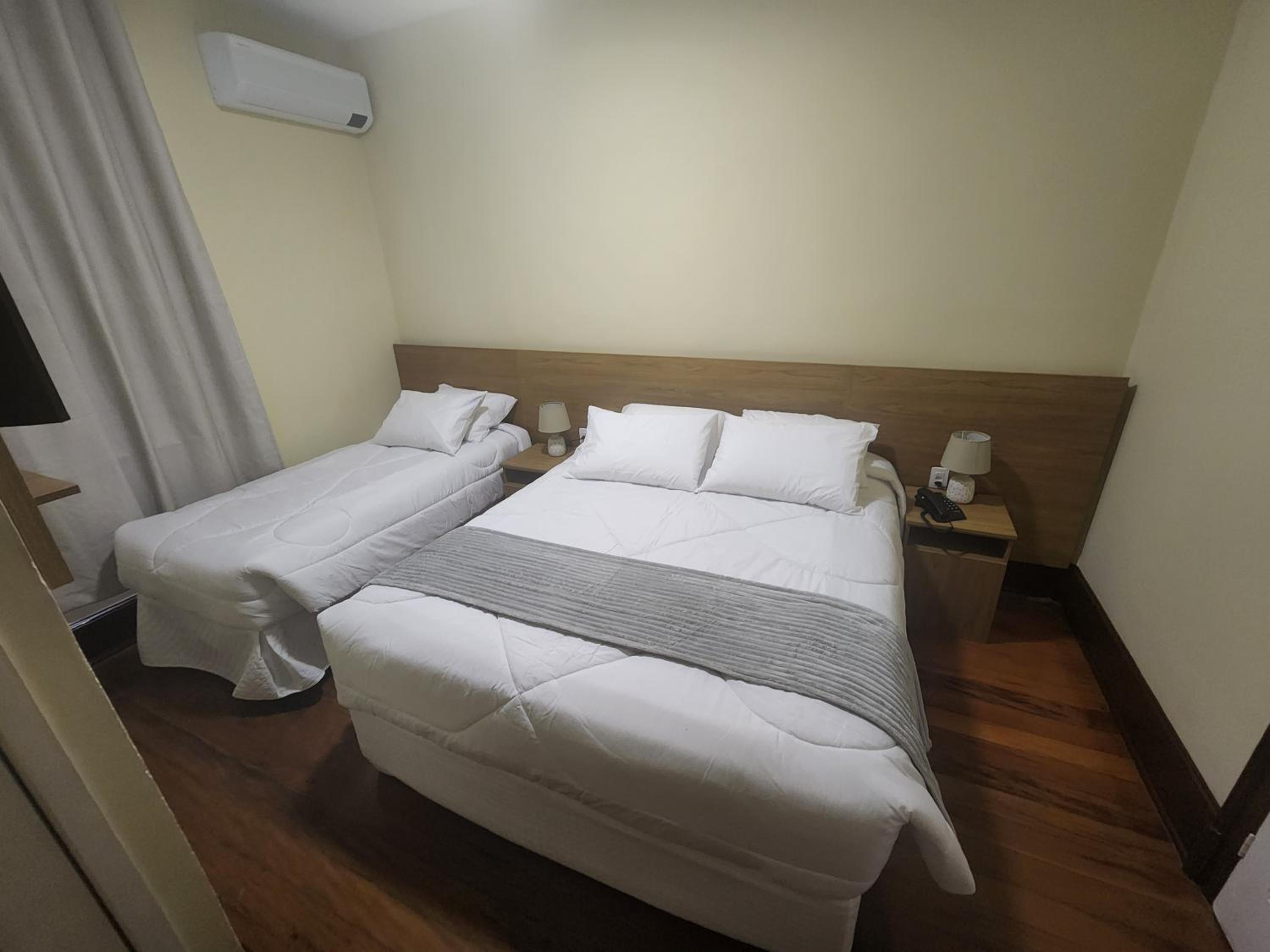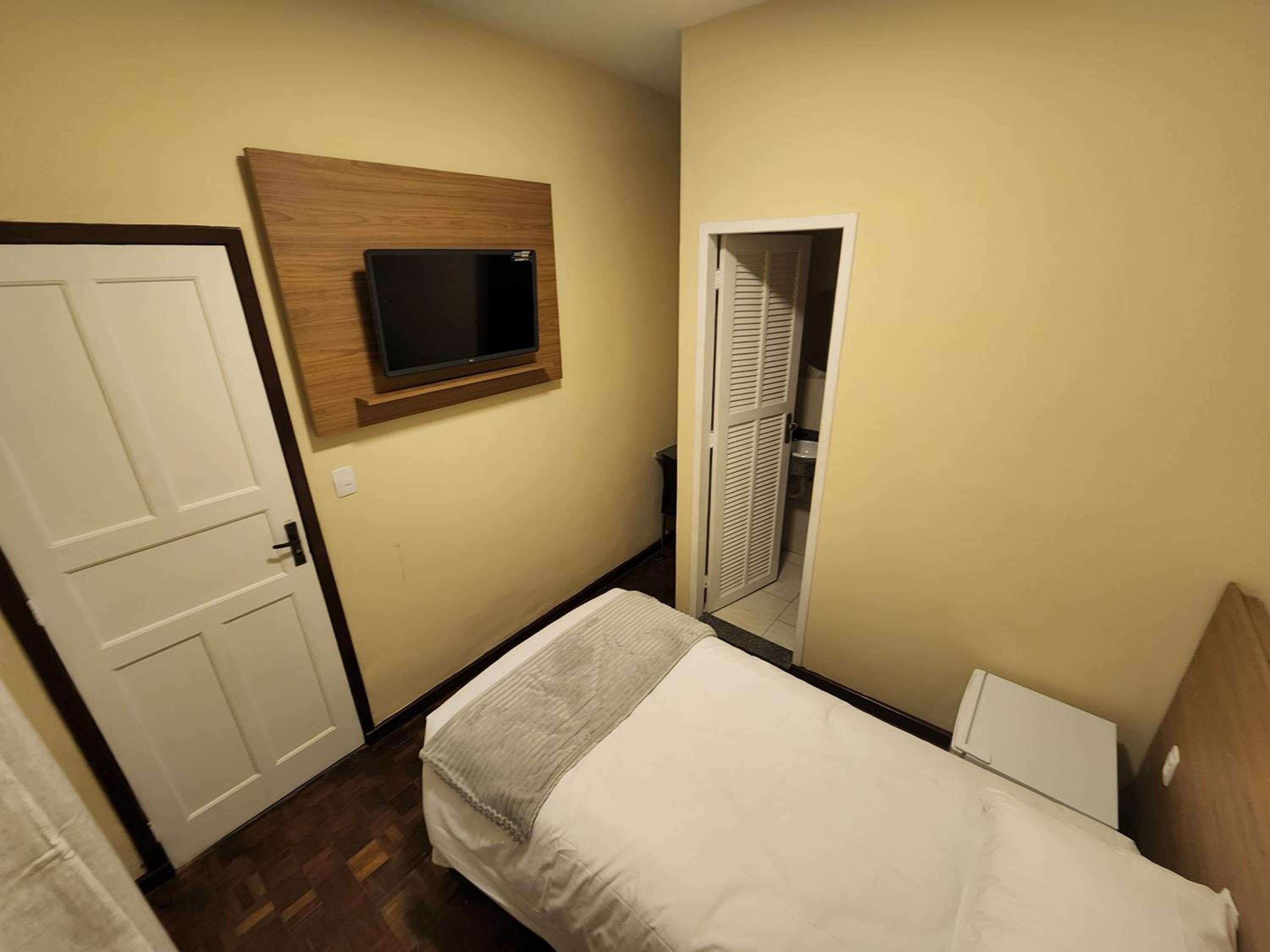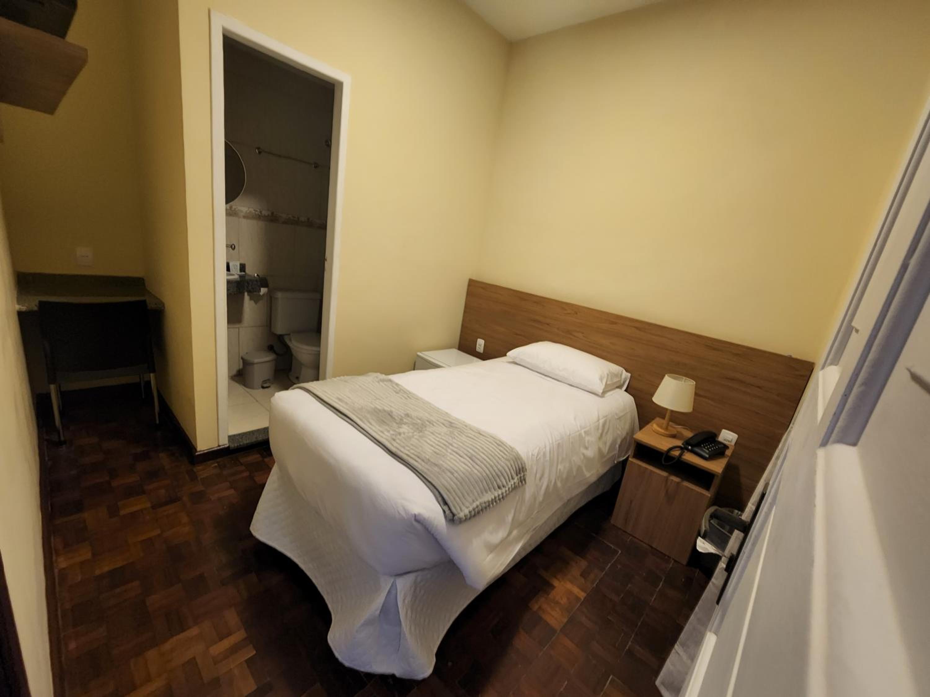 Ar condicionado, tv, frigobar, cama com colchão razoavelmente confortável. Chuveiro bom e secador de cabelo, café da manhã honesto e estacionamento próprio.