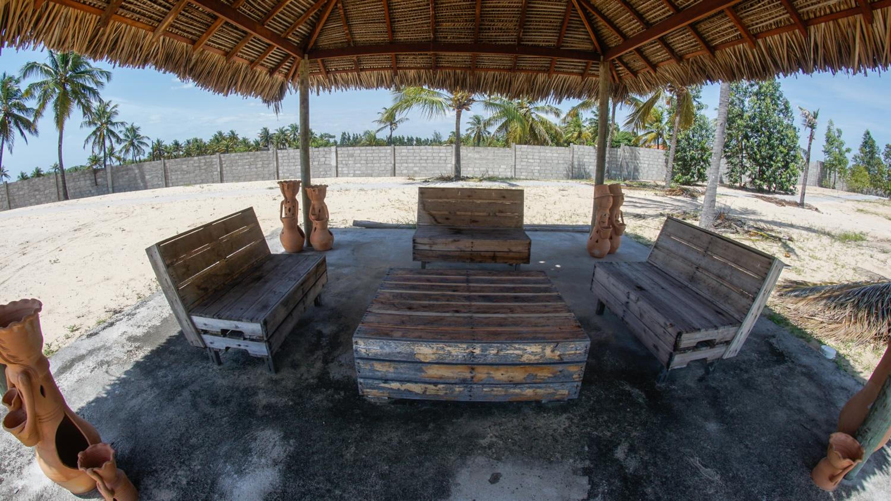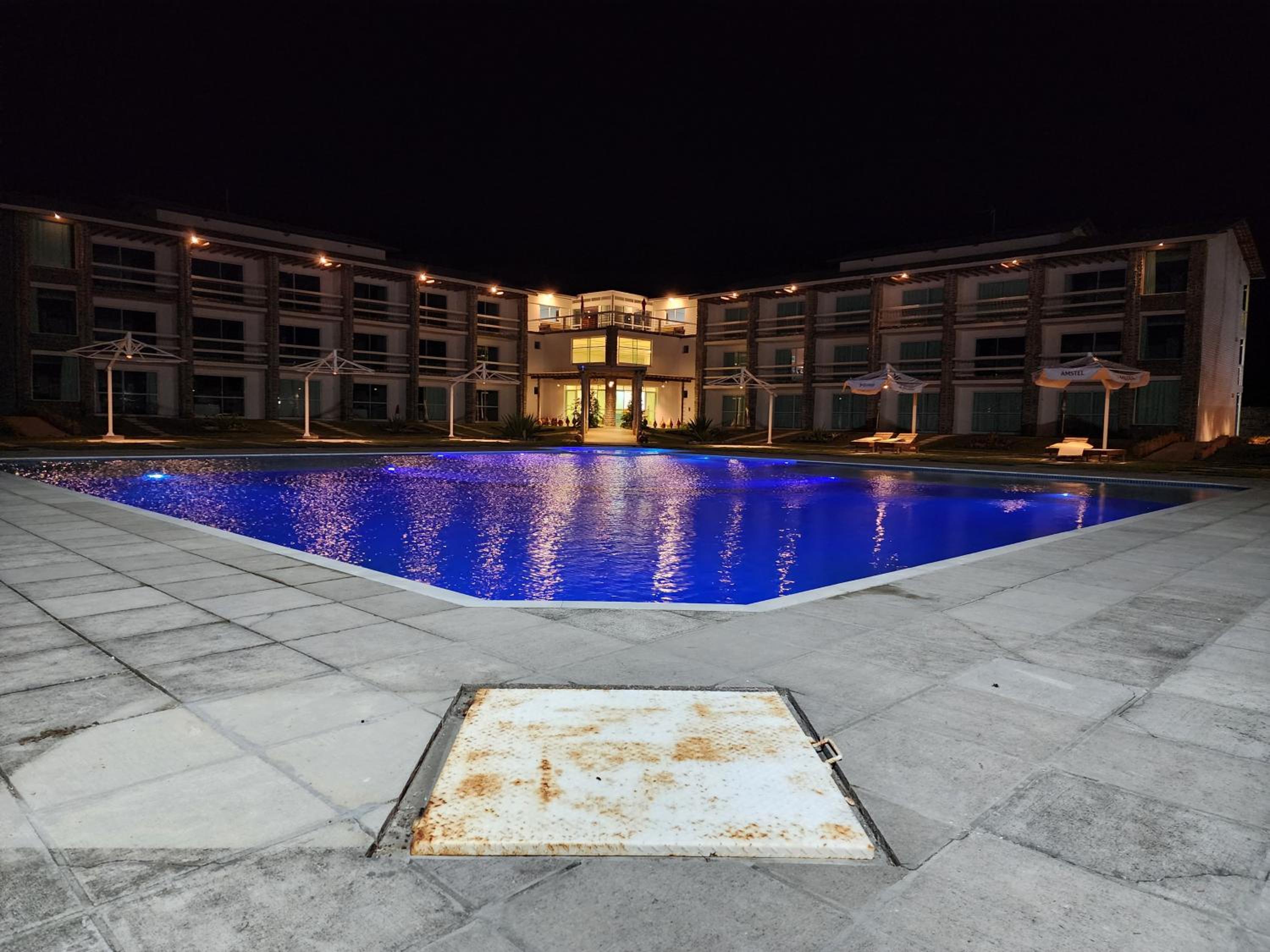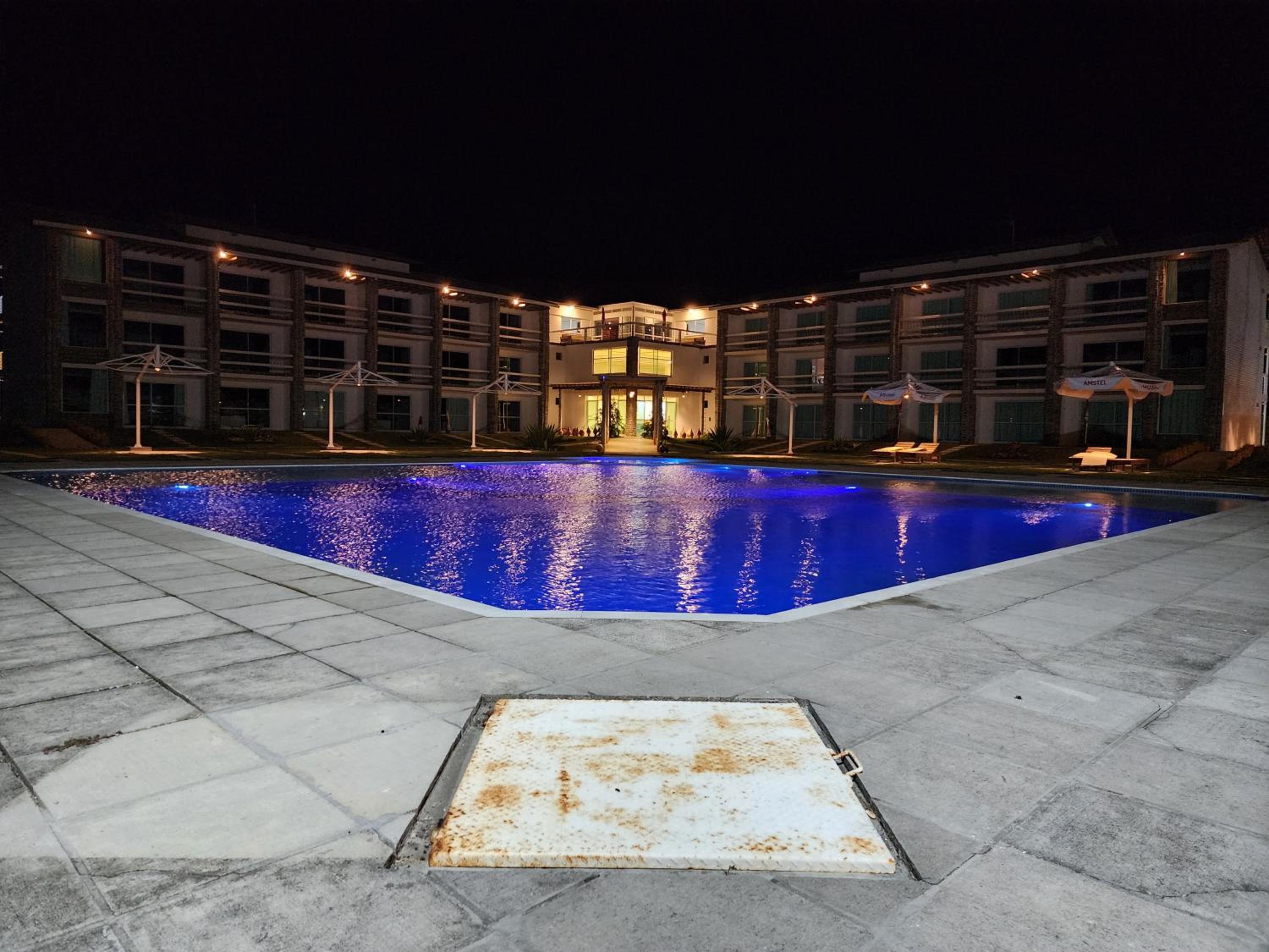 A área externa, com exceção da piscina, está abandonada.