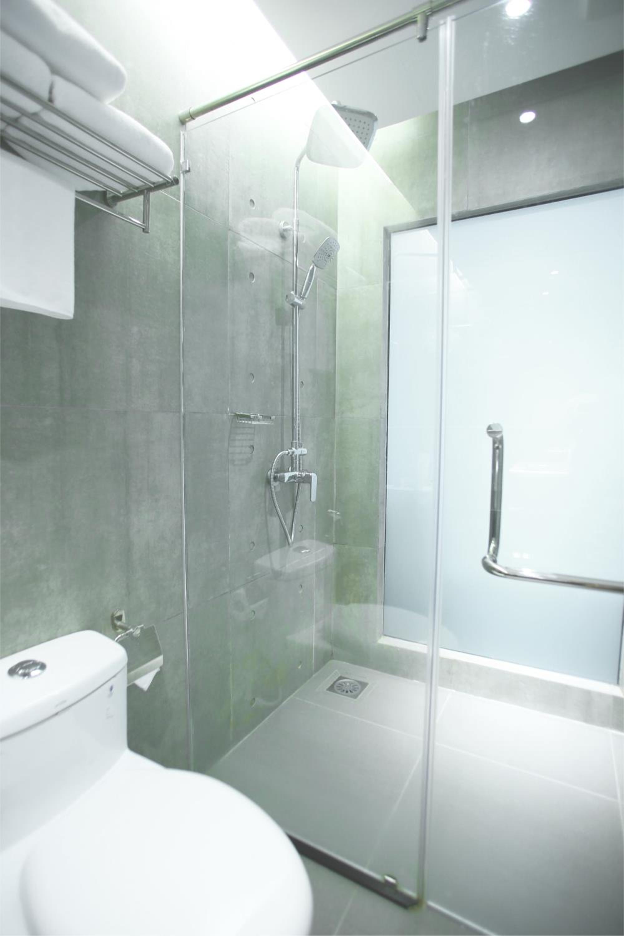 The bathroom has a wet room-style layout, where there's no partition or separator (like a shower curtain or glass wall) between the shower area and the toilet which causes the floor to be slippery. They don't provide hand towels or top up the toilet paper and tissue paper.