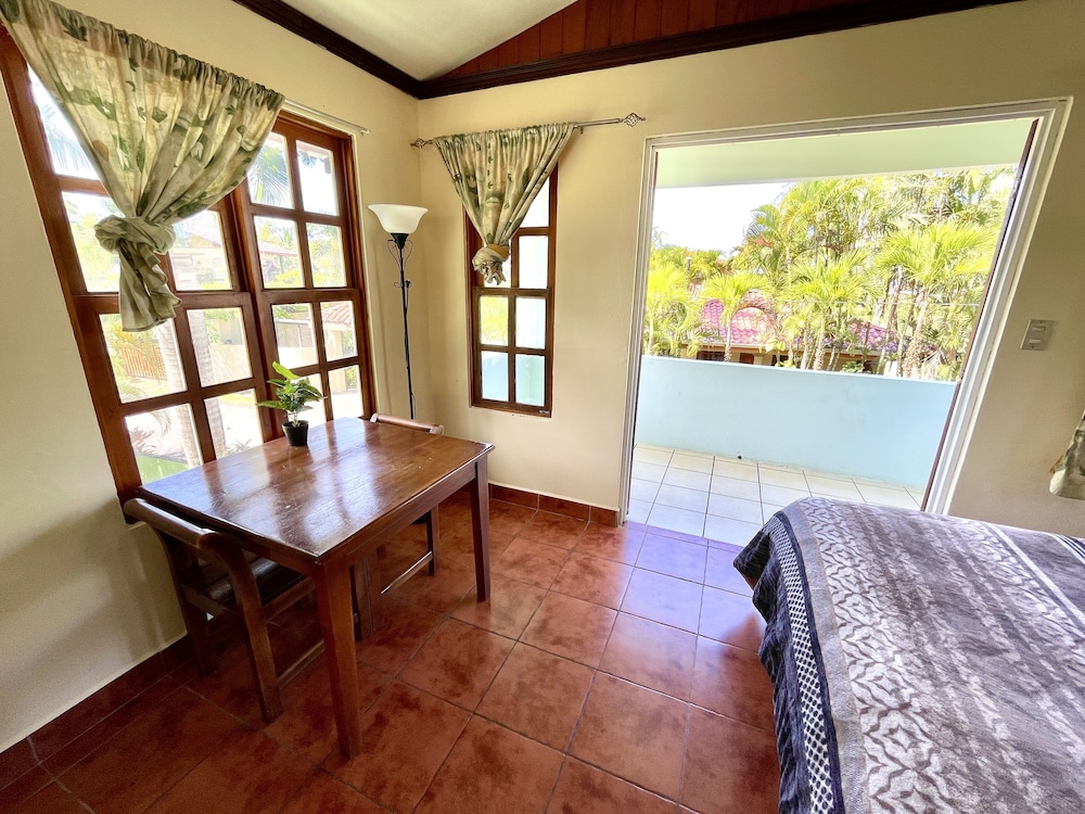 PROs: pool, close to beach, walking distance to restaurants. Parking included. Hot water to shower. Walkable. Clean, room smelled of bleach when we arrived. Had a window, and a lamp as it was dark. Bed was okay. Refrigerator. Pizza Pata/smoothie place beside exceeded expectations. Markets nearby with lots of drink options.