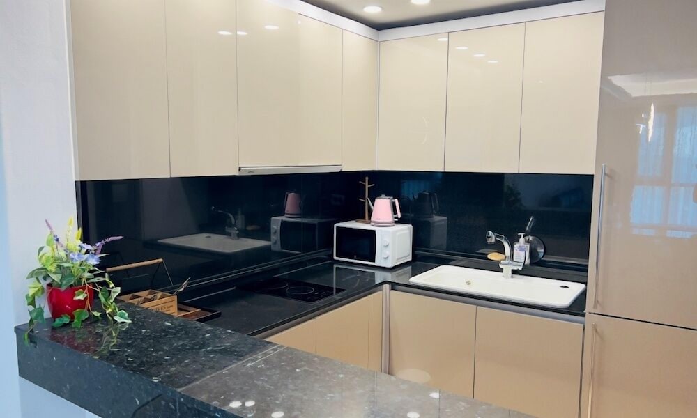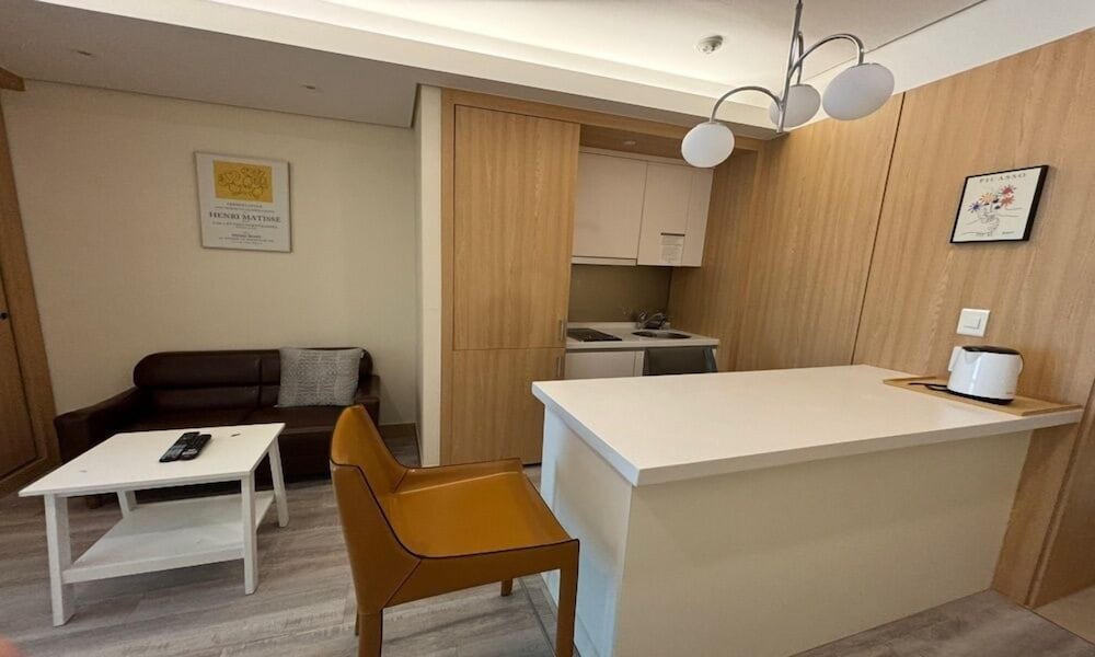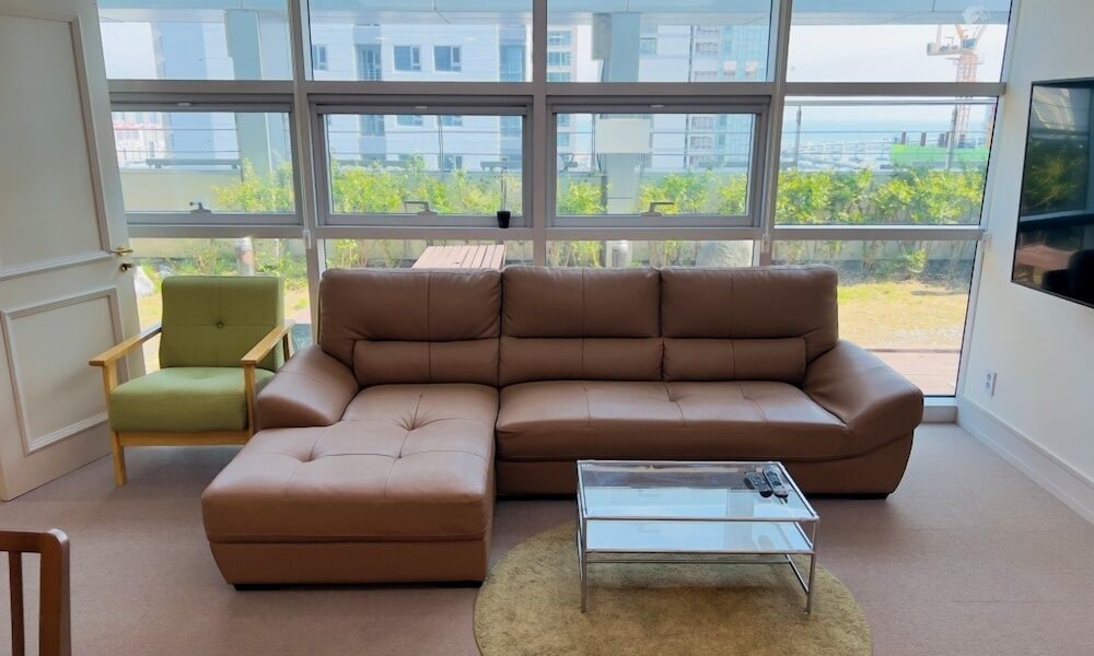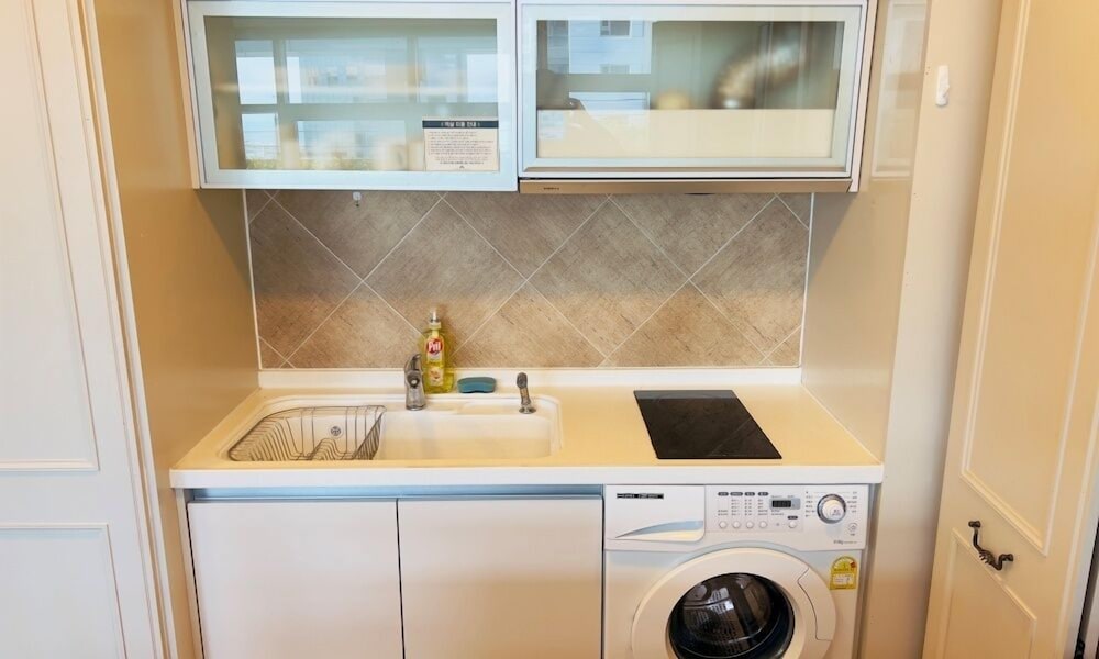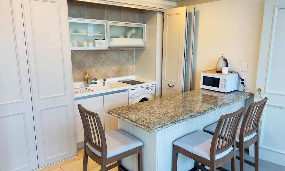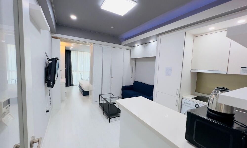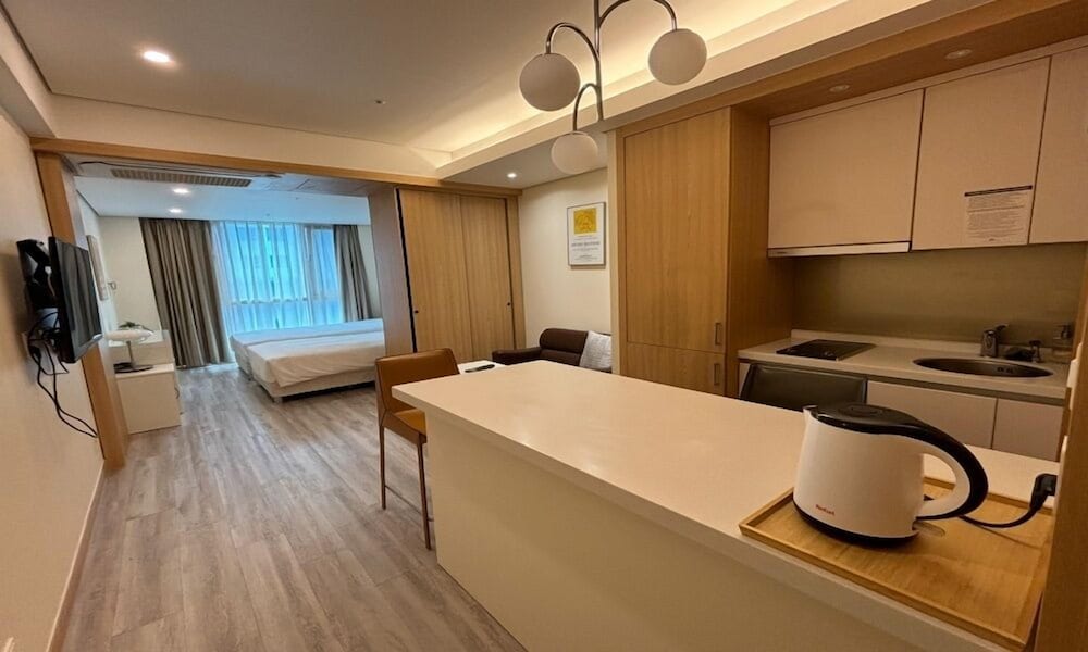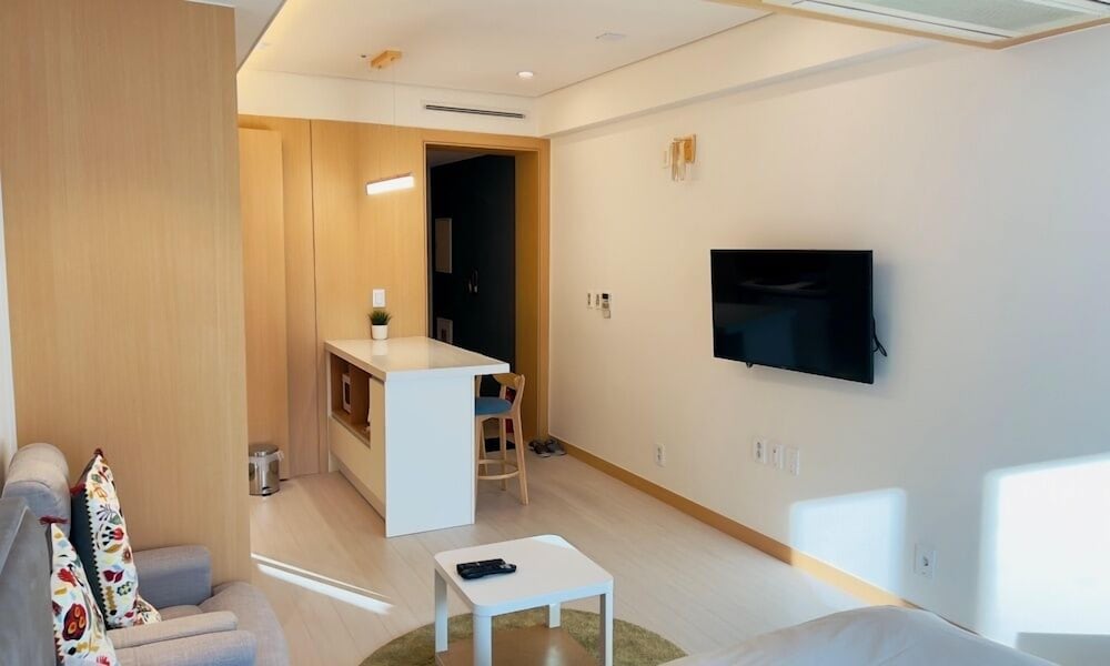 The rooms are quite big. Divided into 4 areas.. 1st the sleeping area with Double / Twin bed. Small working table with a chair. Ample number of power points and a LAN point. There is a wifi router wirh 100 mbps free internet connection. 2nd area is the sitting area with a coffee table, a double seating sofa. There is a 43inch 4K TV with LG Hellovision Set top box. Thankfully there are over 6 channels with English Movies. OCN and The Movie. A small closet for the clothes. 3rd Area is the kitchenette equipped with a Microwave Oven, Fridge, Electric Tea Kettle, 2 induction tops with electric chimney. . There were basic utensils also. A small table with two chairs. The 4th Area was the entrance and the bathroom. In the bathroom there was no health faucet so have to manage with a water bottle or the tissues. Nice shower area wirh shampoo, conditioner and shower gel. If you stay for over 4 nights then one day they will clean your room and make the beds. If you want the room to be specially cleaned then you have to pay KRW20K. Toiletries are not included and you have to pay KRW4. 4K for that. Every day they will hang two hand towels and two 500ml water bottles on the door handle. Overall very happy with the room.