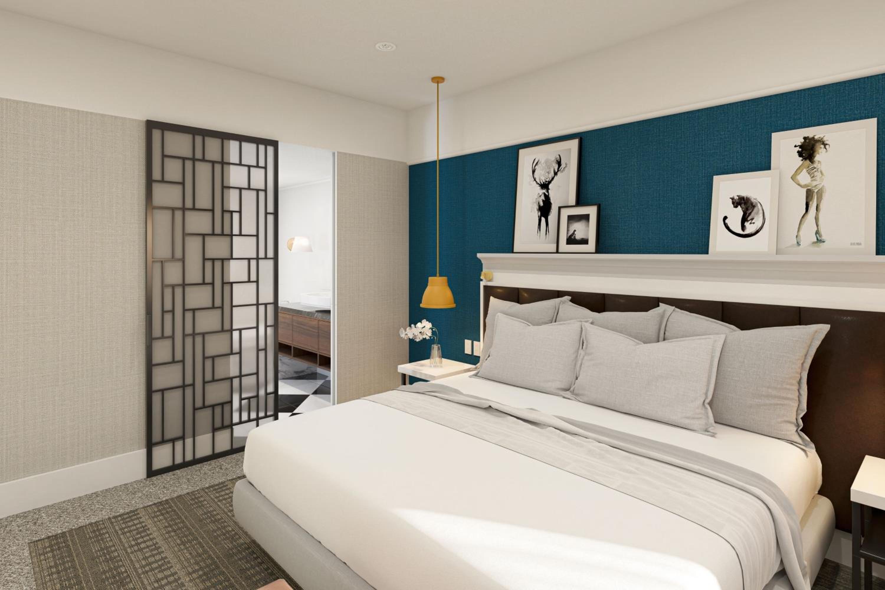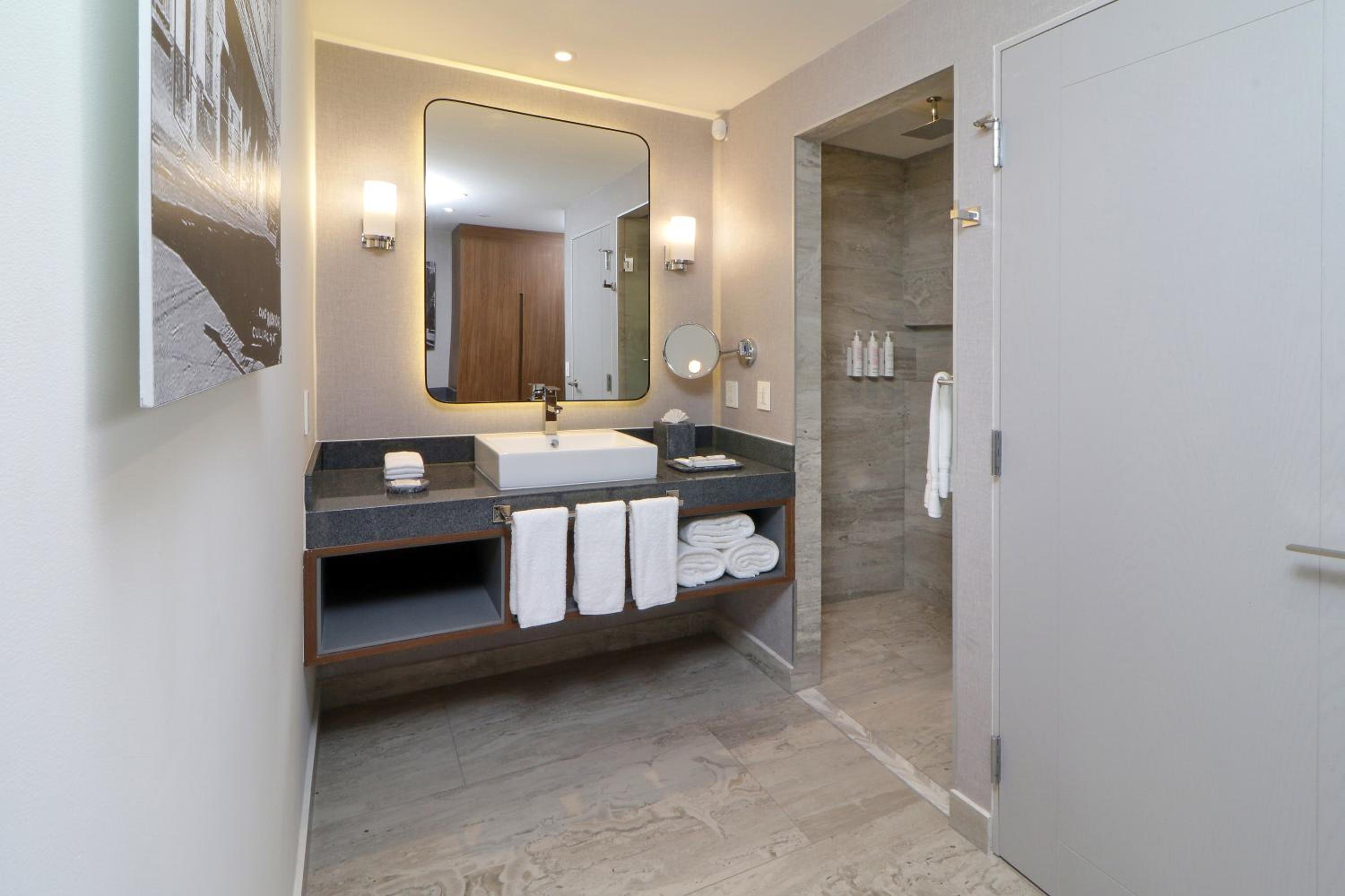 The staff was super friendly and helpful, from the front desk to the bartender. The hotel feels brand new and modern and very comfortable. It is connected to a modern mall with a grocery store, parking garage and other restaurants.