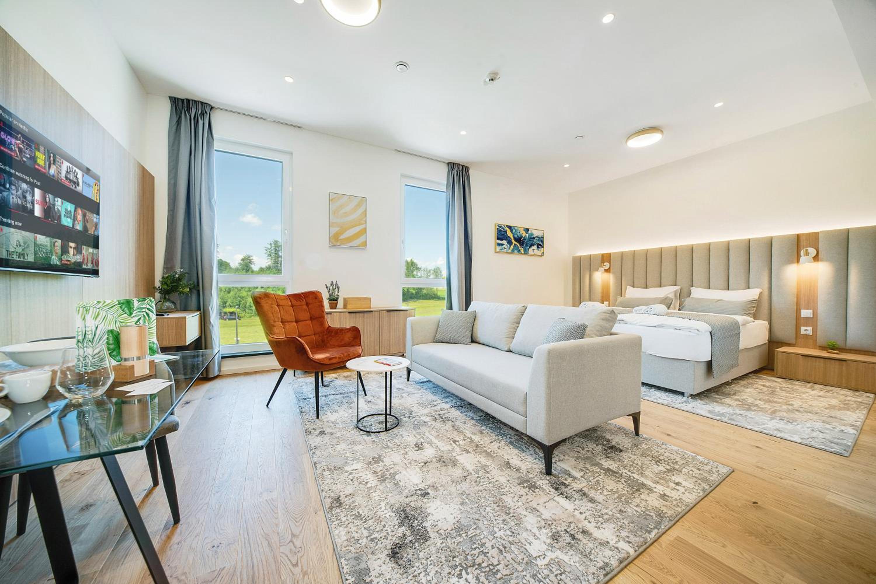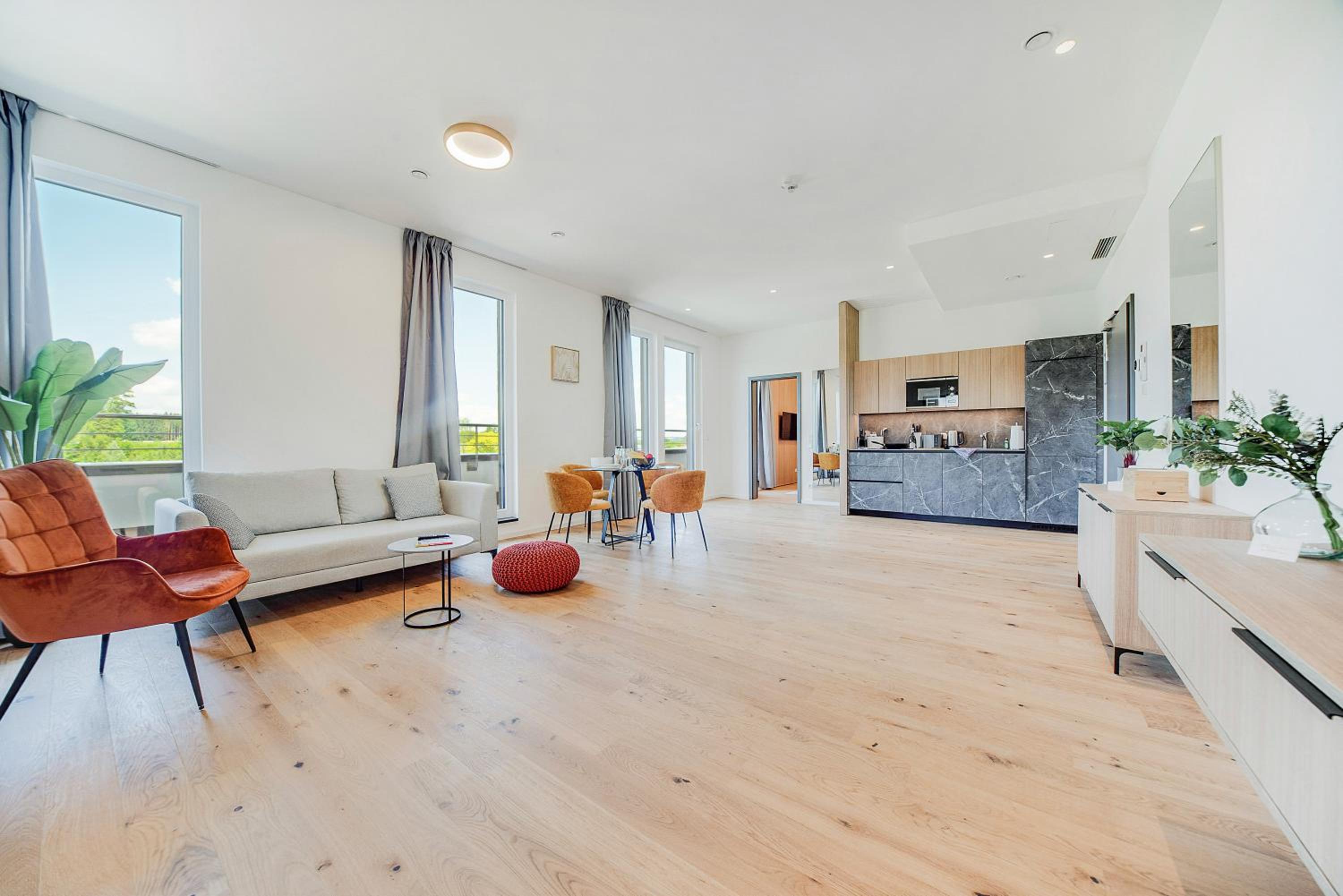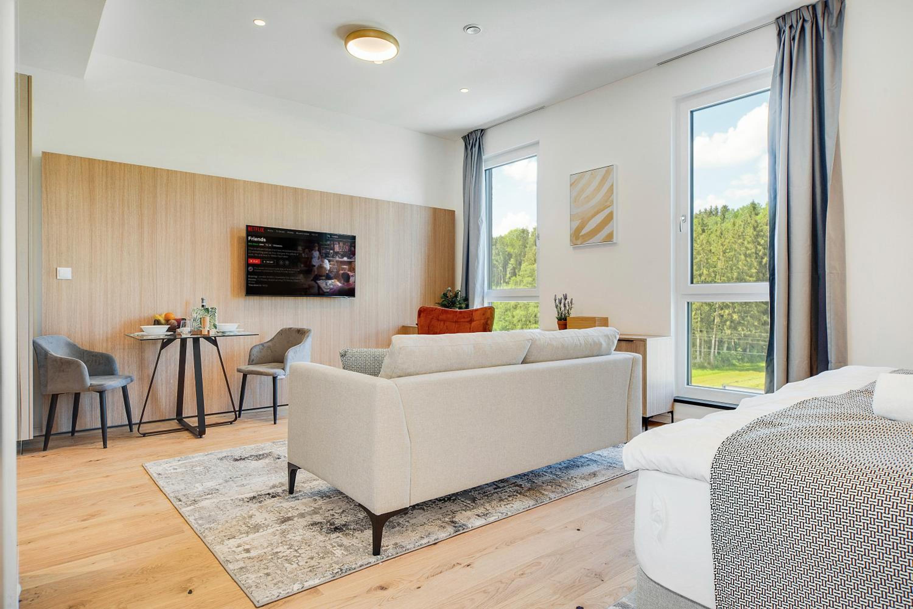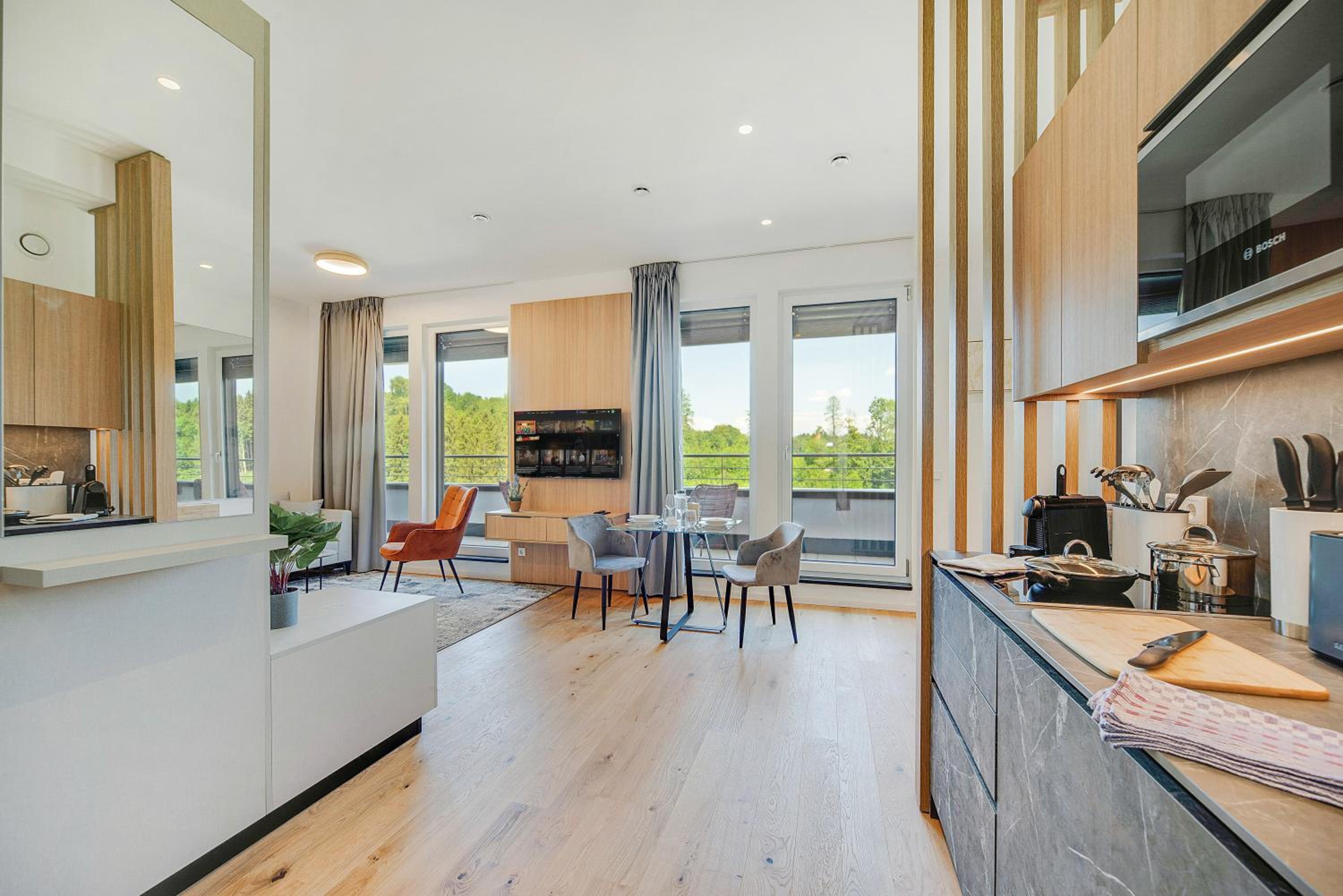 Experience a stay like no other at BRIGHT: Rosenheim Aicherpark, a newly renovated aparthotel in Rosenheim. Enjoy the comfort of air-conditioned rooms with free WiFi, private parking, and fully equipped kitchens.