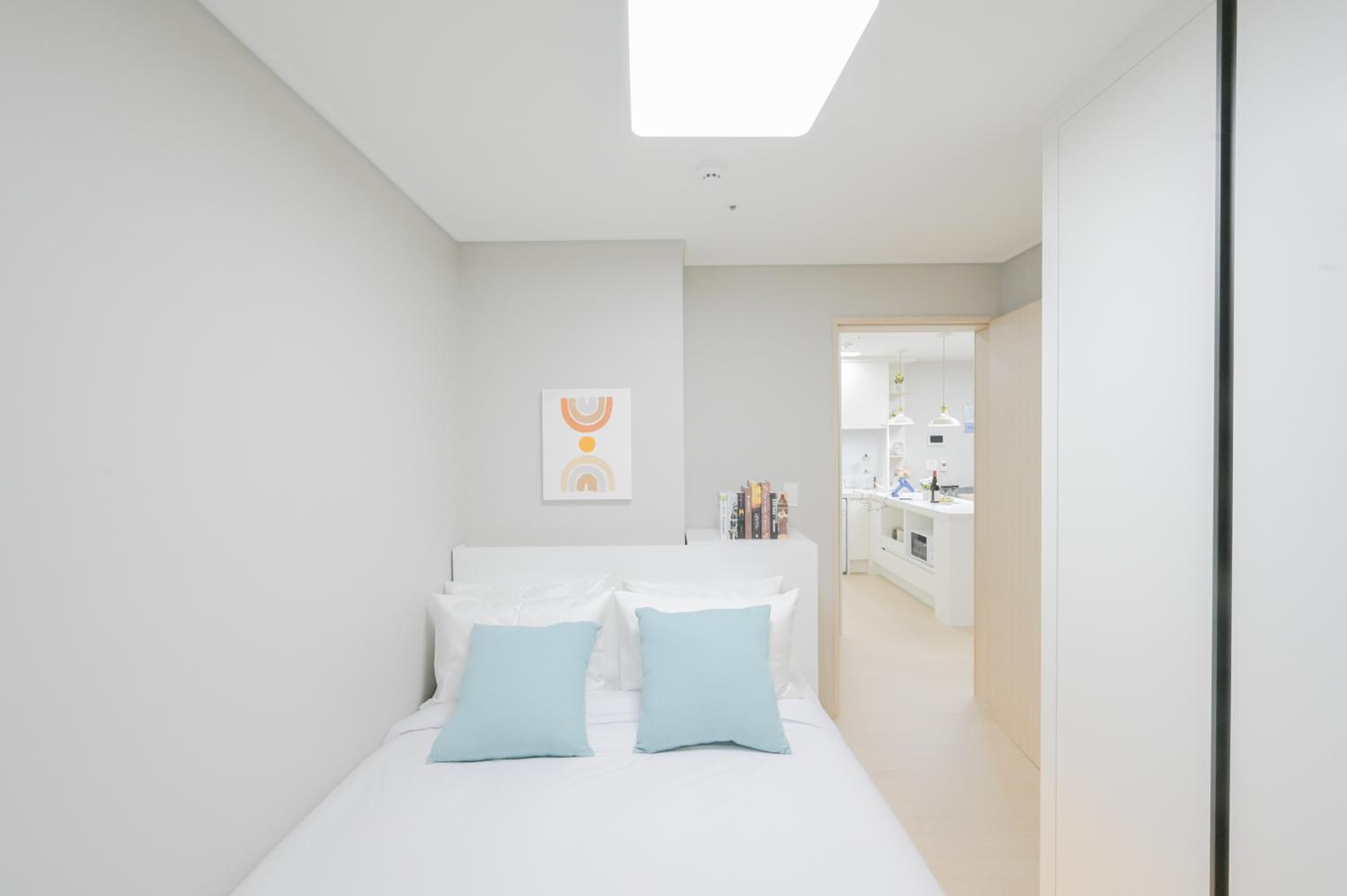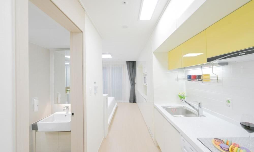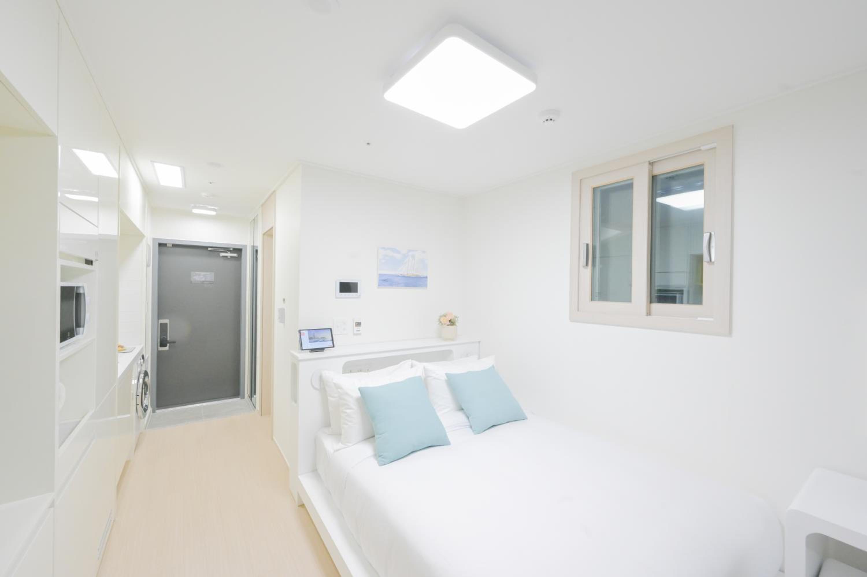 Hotel room like a one-room officetel or condominium. Very new, very clean, and very convenient. Strong wifi in the room. International power receptacle near bed. We stayed in the corner balcony sea view room on 17th floor, view was really great. Beach front hotel, and 10 minute walk to sea side restaurants and pubs. 3 floors underground parking lot and big parking area outside near beach.