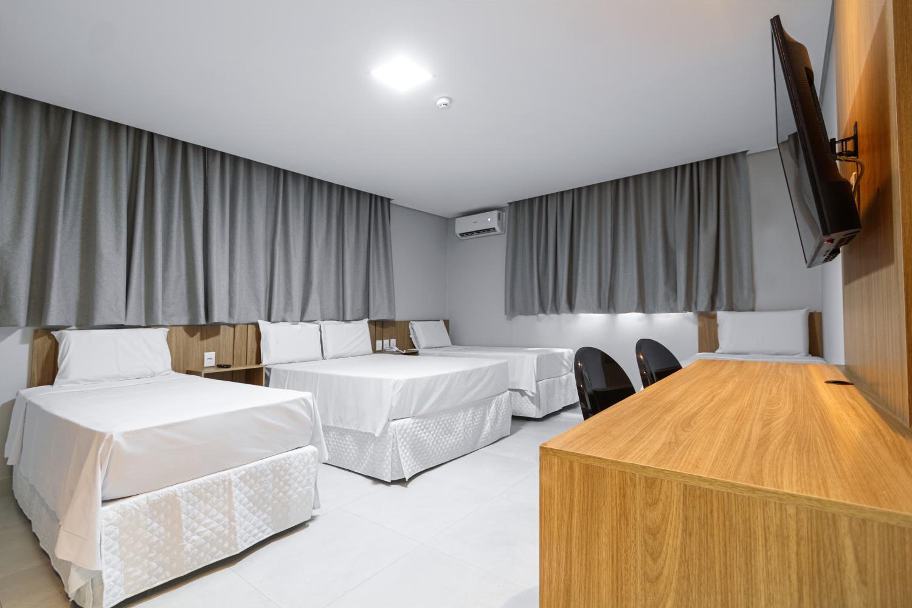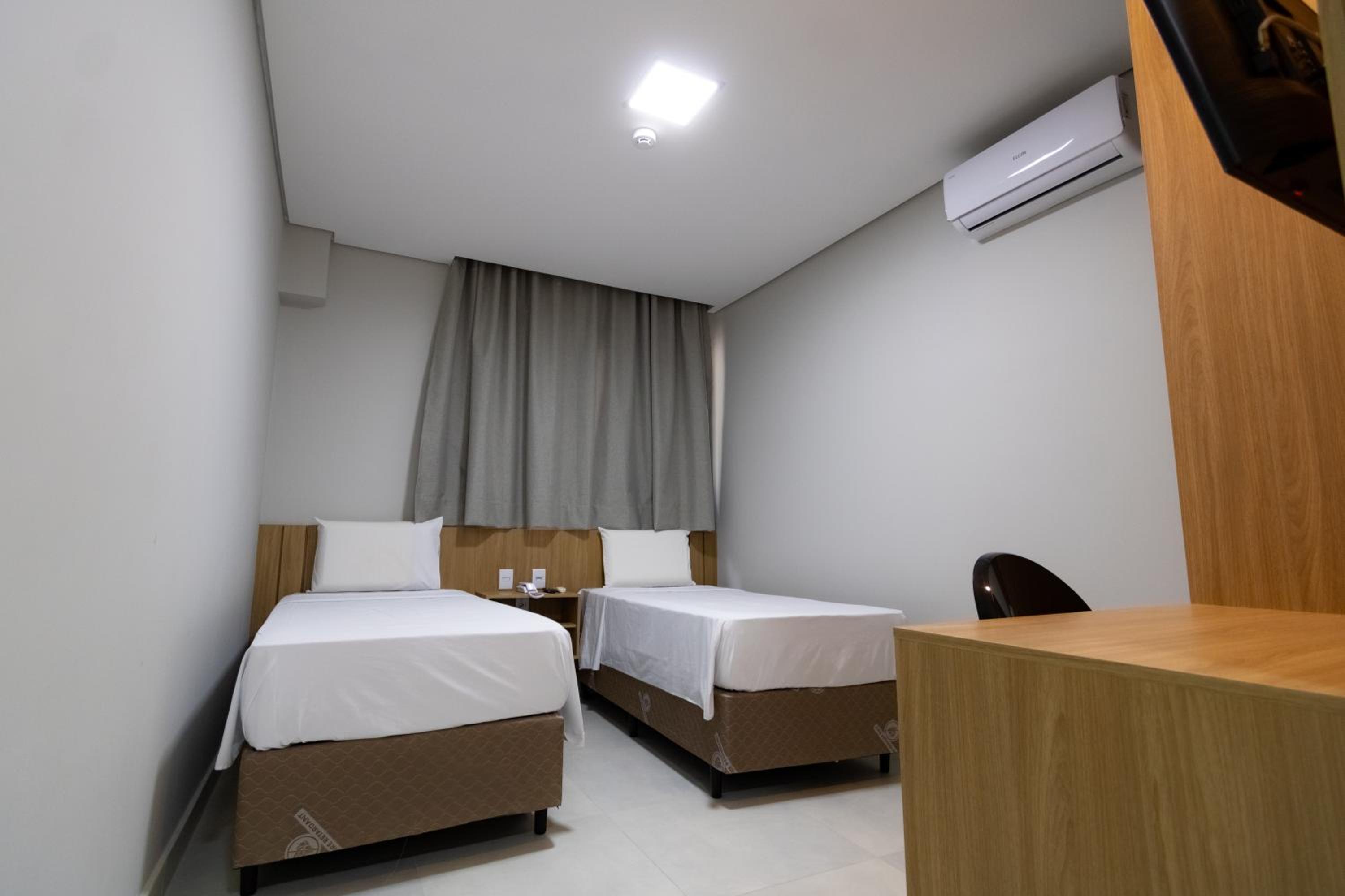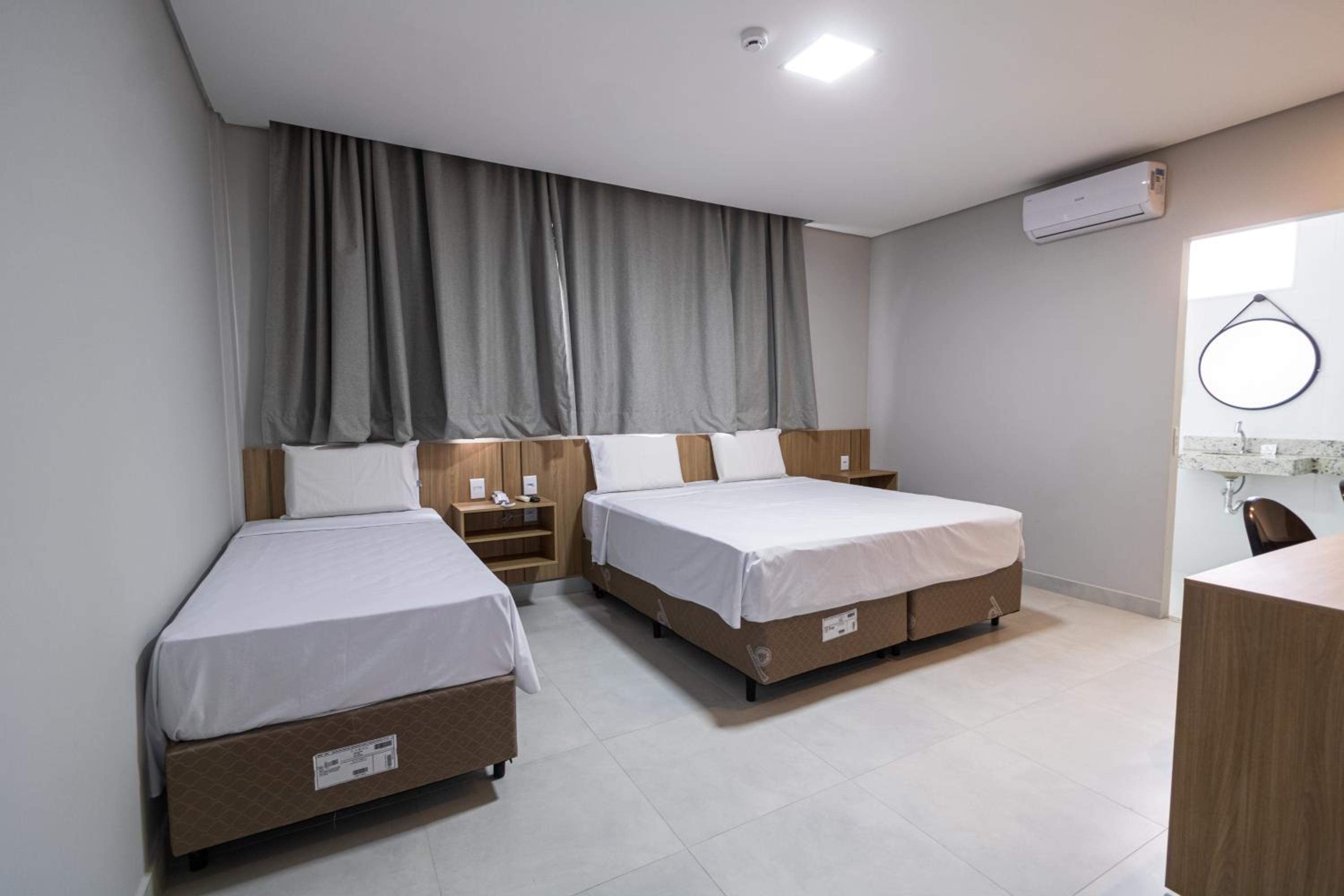 Quarto novo e limpo; ar condicionado silencioso e funcionando regularmente; cama de casal grande (camas de solteiro juntas); e banheiro espaçoso.
