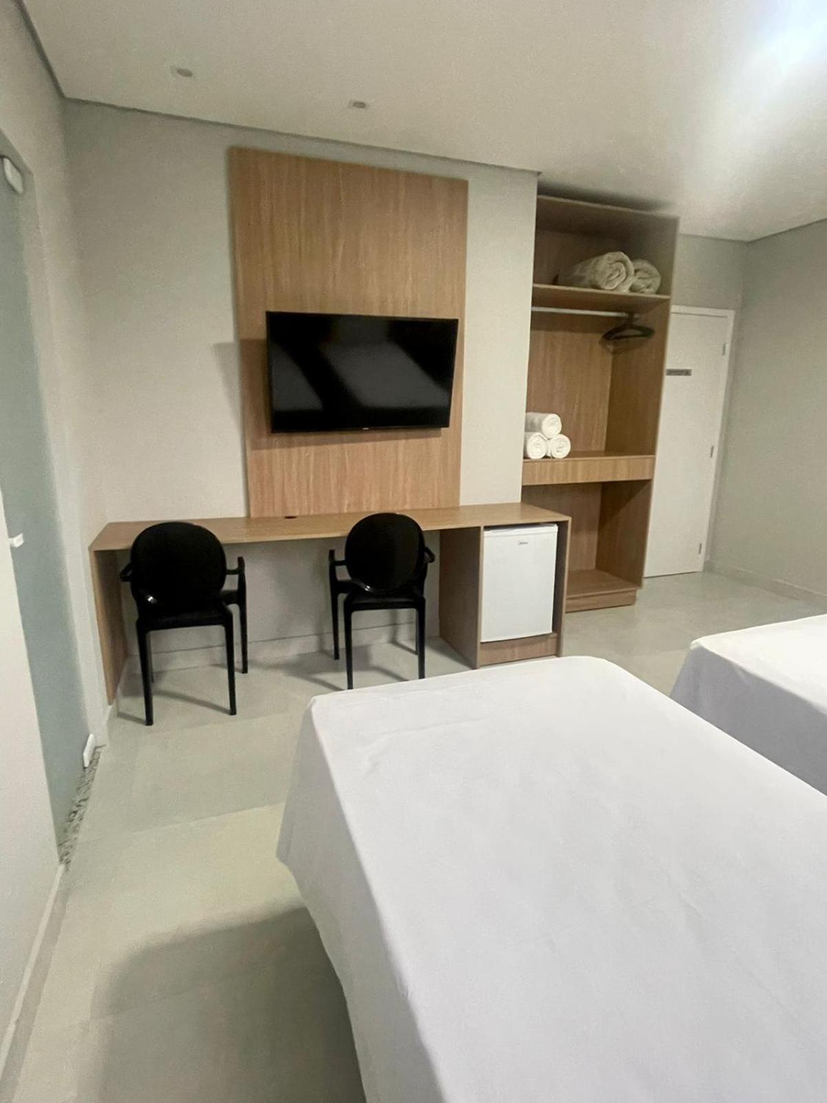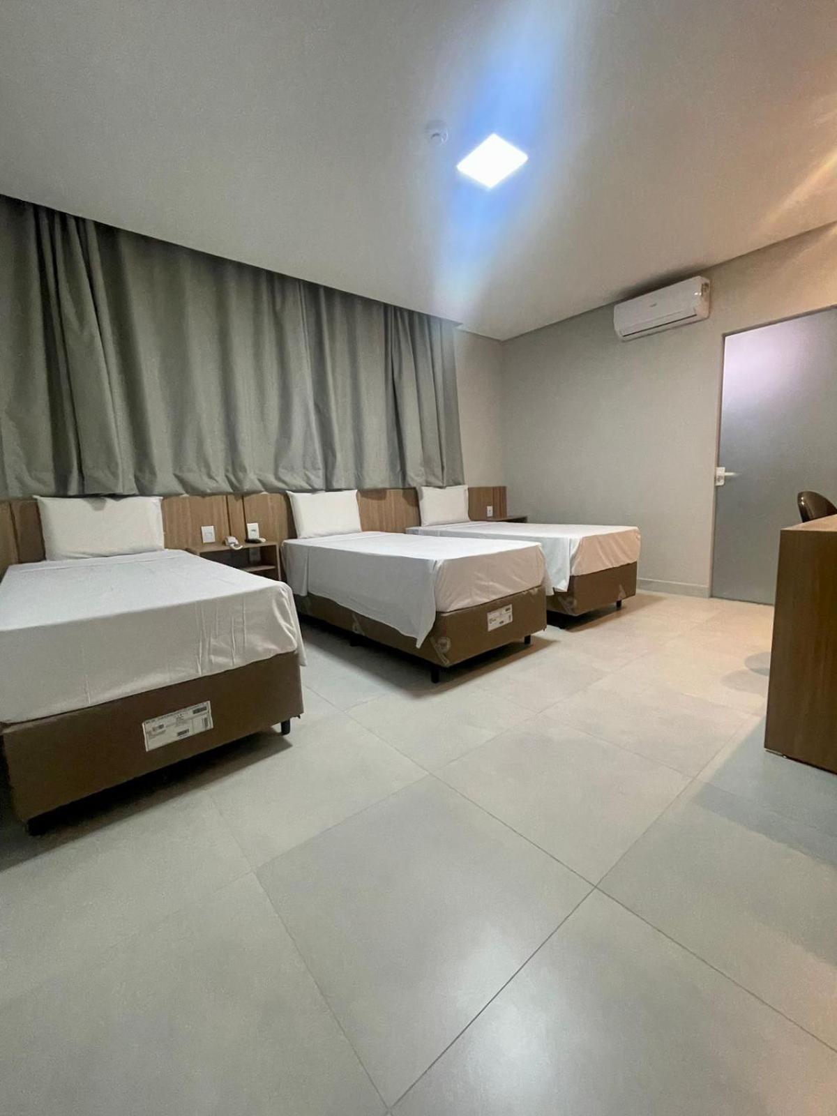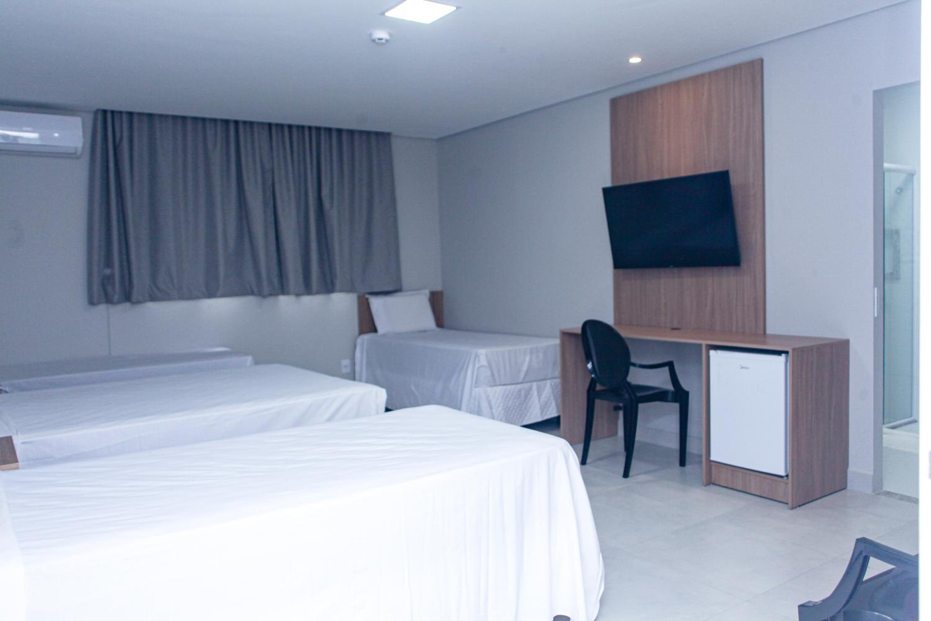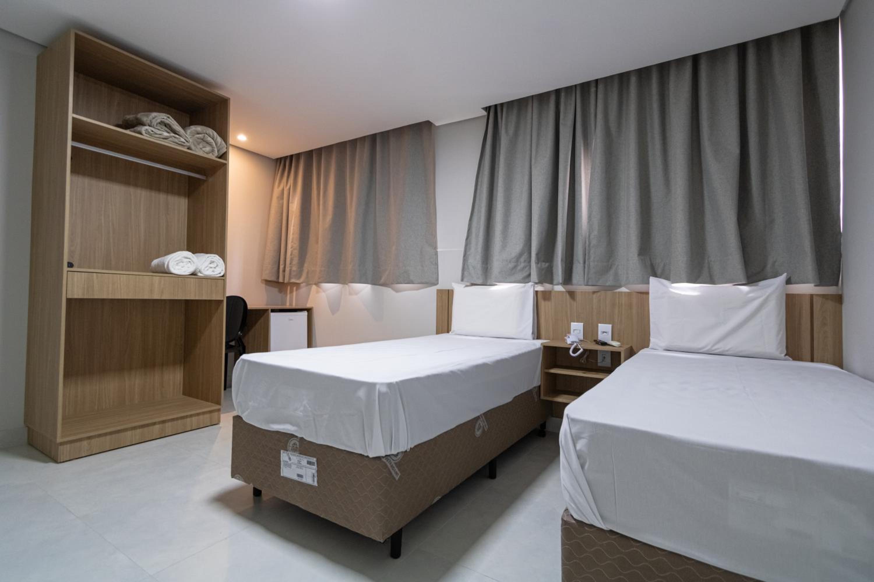 Quarto novo e limpo; ar condicionado silencioso e funcionando regularmente; cama de casal grande (camas de solteiro juntas); e banheiro espaçoso.