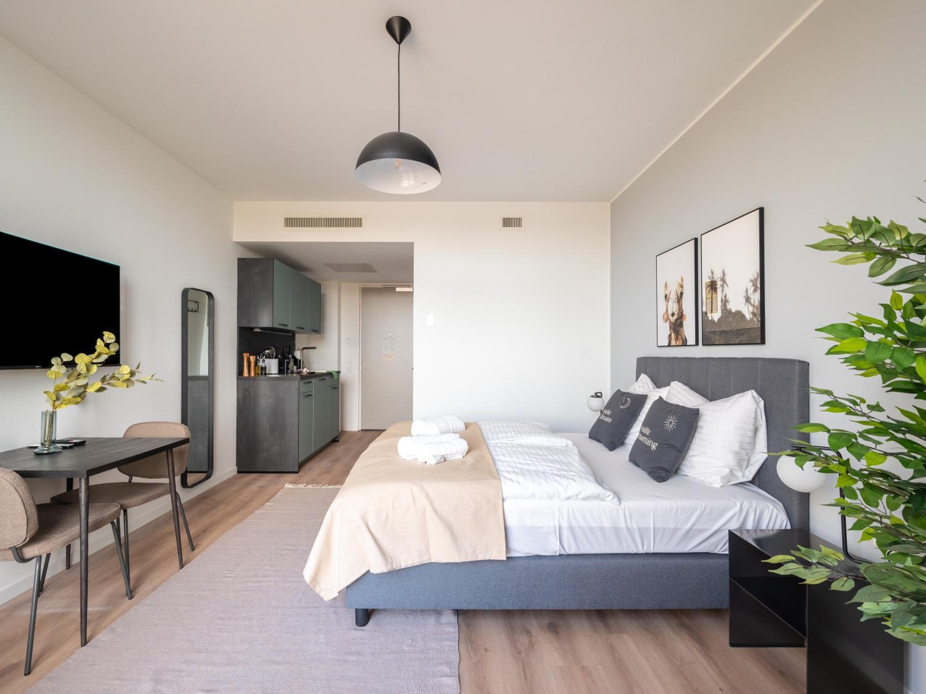 Experience comfort with a flat-screen TV, kitchenette with dishwasher, and cozy bed linen and towels provided.