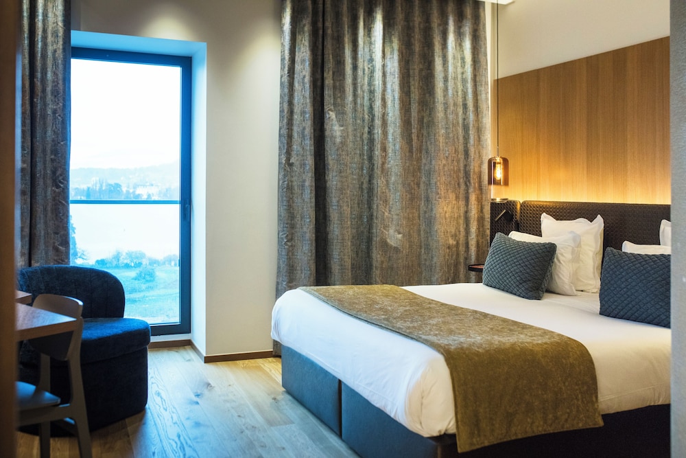 Geschmackvolles, modernes helles Zimmer mit großem Bett und großer Fensterfront (mit funktionierender Verdunklung). Auch das Badezimmer ist frisch renoviert. Das Frühstück hatte eine tolle Qualität und die Nähe zum See und zur schönen Altstadt ist wunderbar. Under kleiner Hund war willkommen, auch im Frühstücksraum. Reservierung im hauseignen Parkhaus war angenehm.