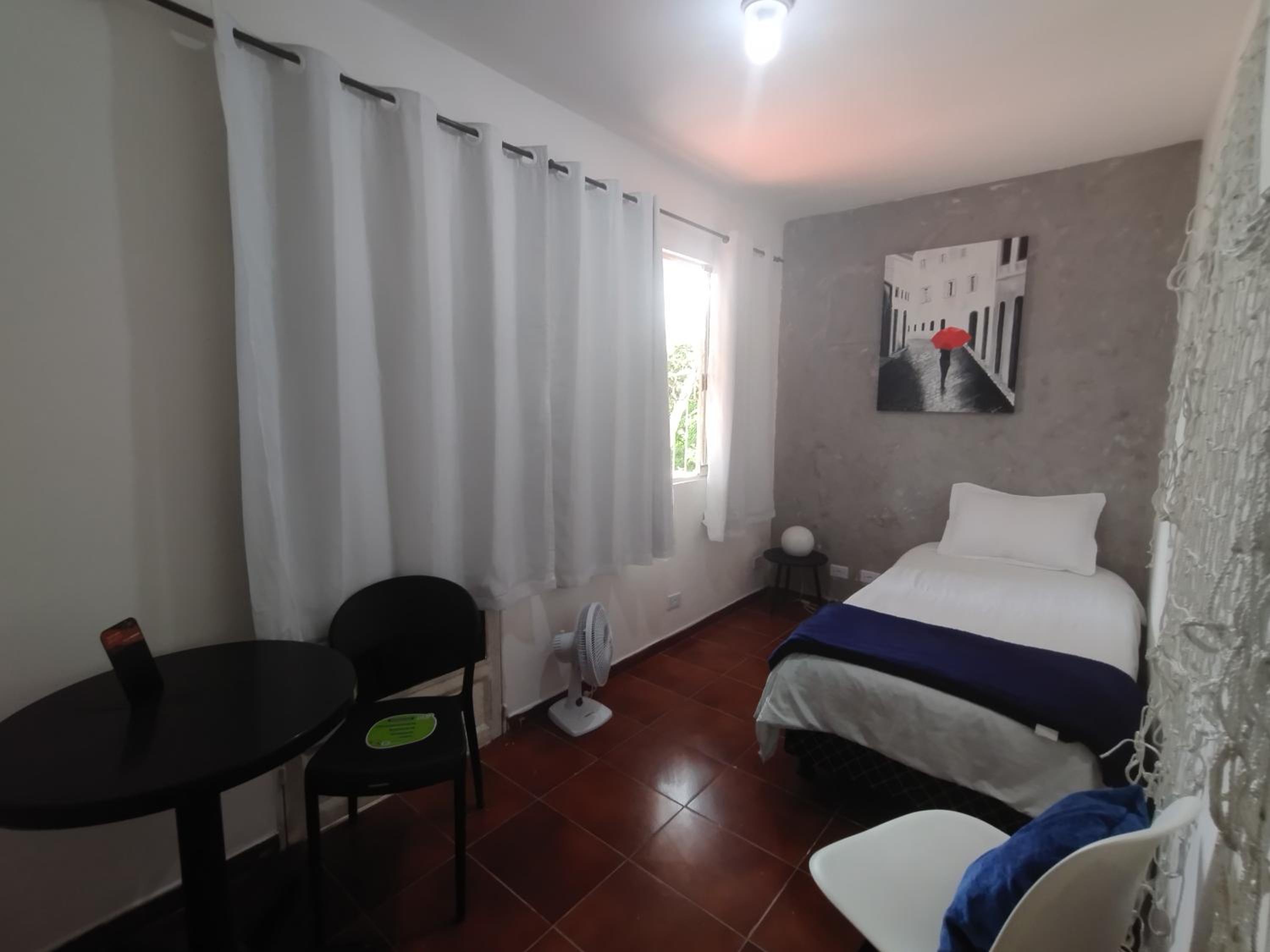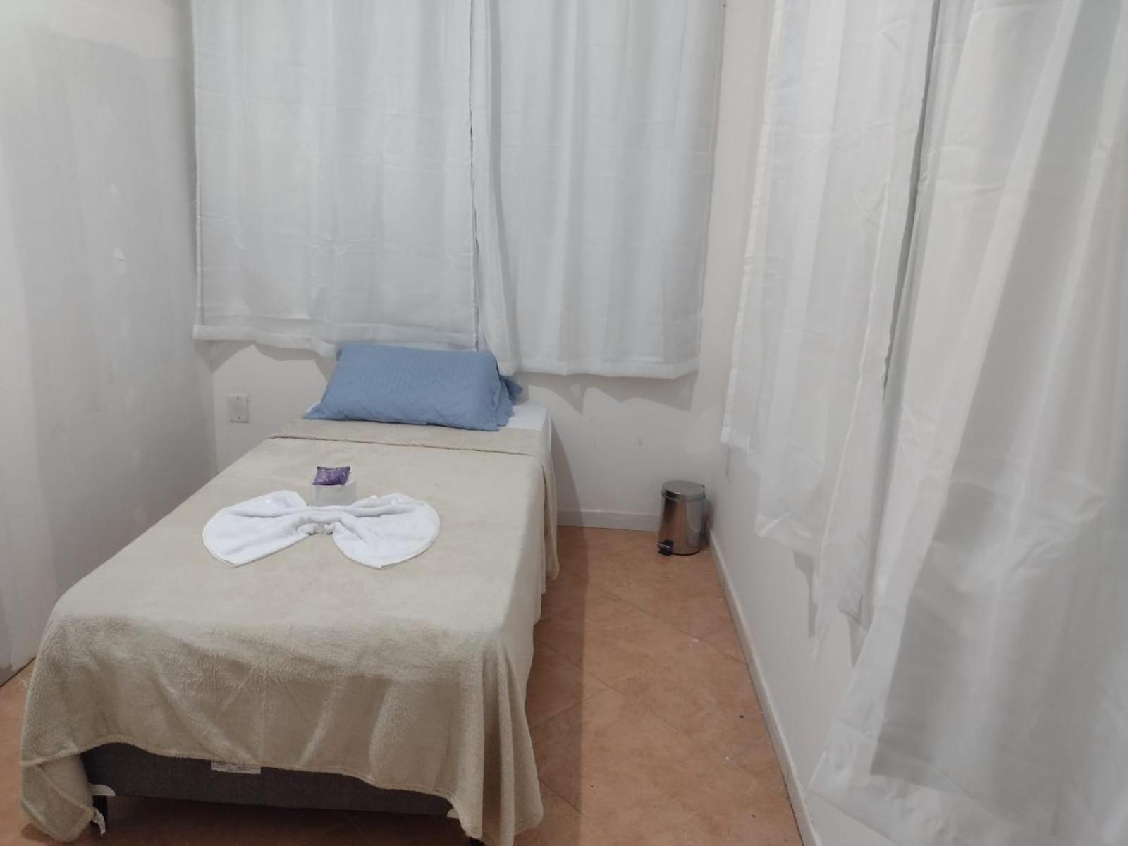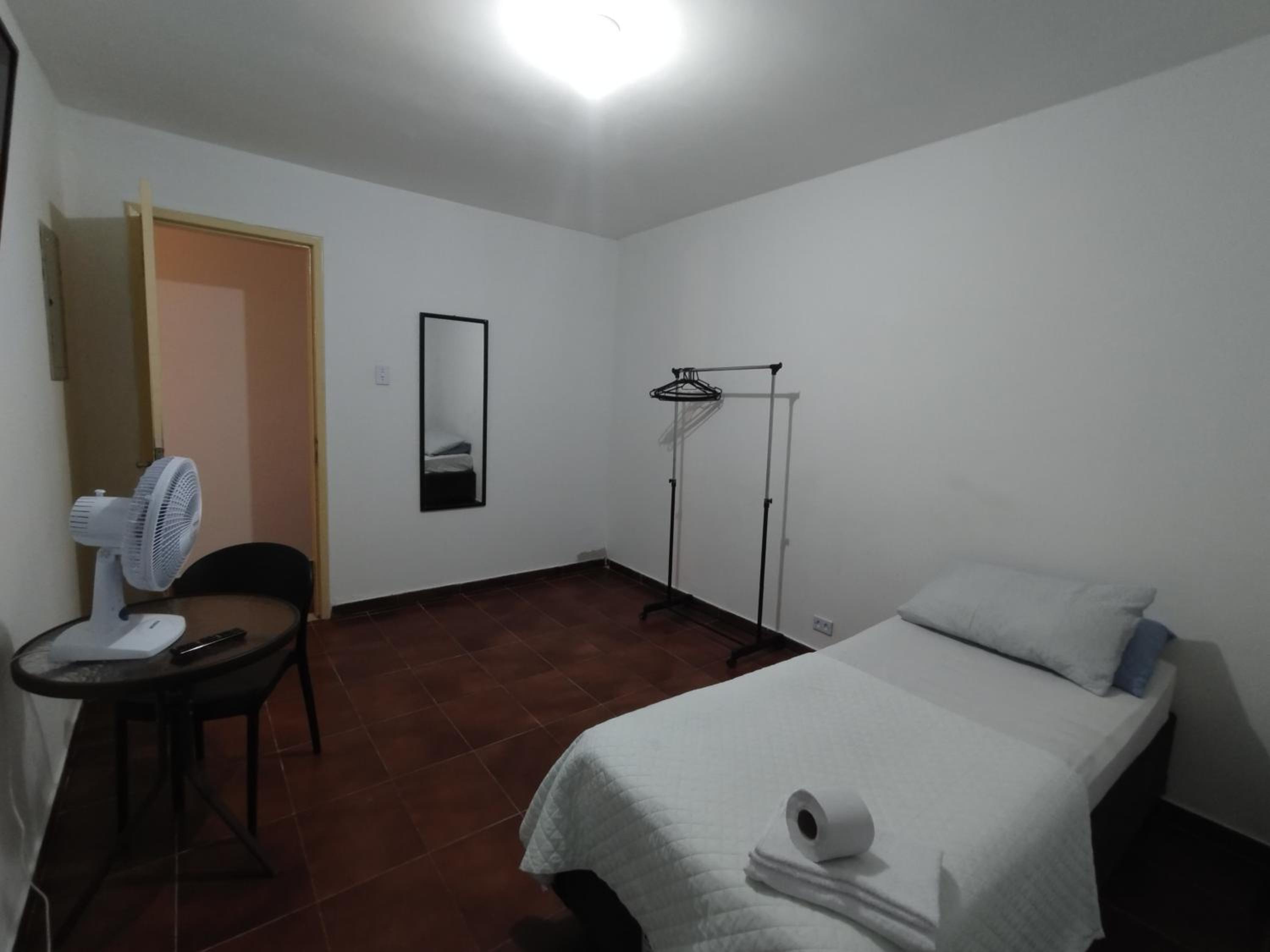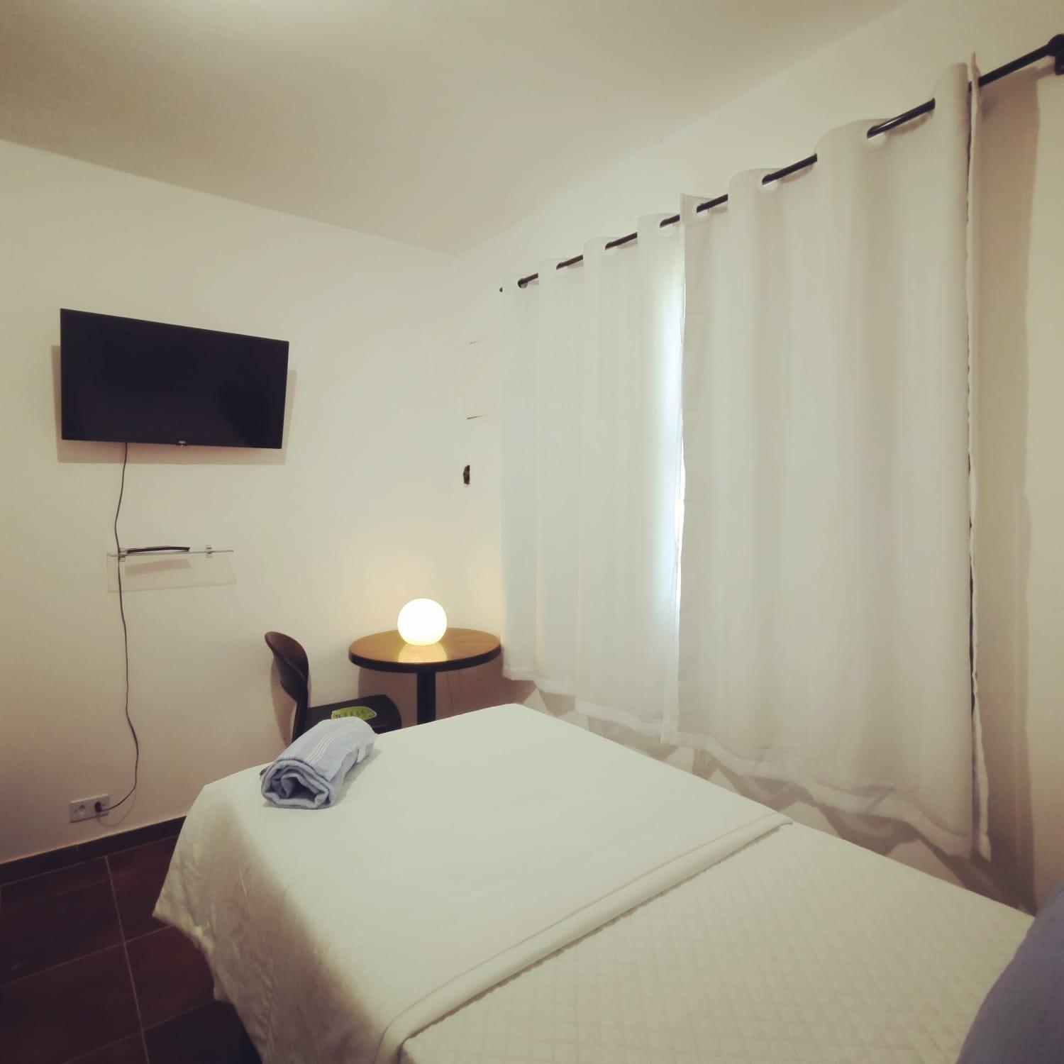 Quarto individual muito espaçoso, cama confortável, excelente custo benefício. Tem padaria e mercadinho em frente, tem mercado grande e shopping há uns 15min de caminhada.