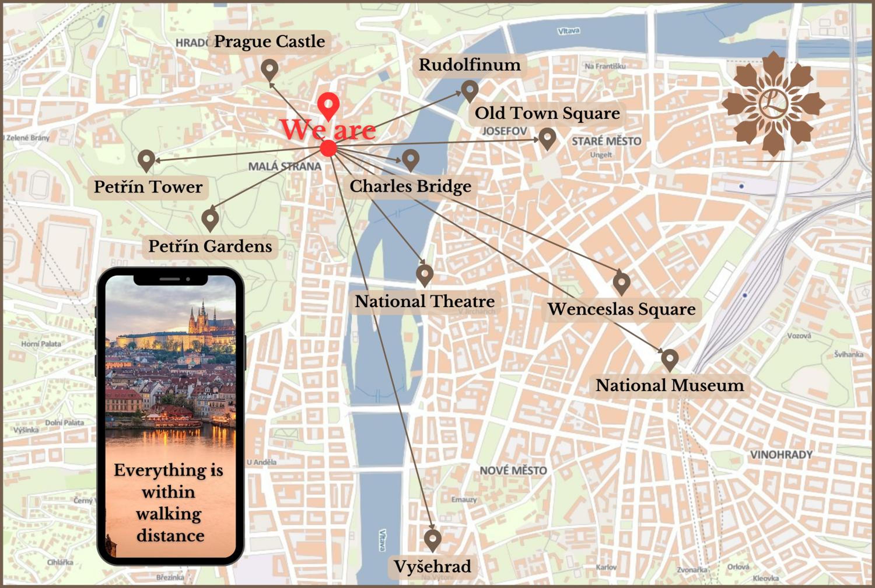 Super lokalizacja, 2 minuty na piechotę do mostu Karola. Miła obsługa. Dziękujemy panu Jakoby za pomoc z zameldowaniem 😊