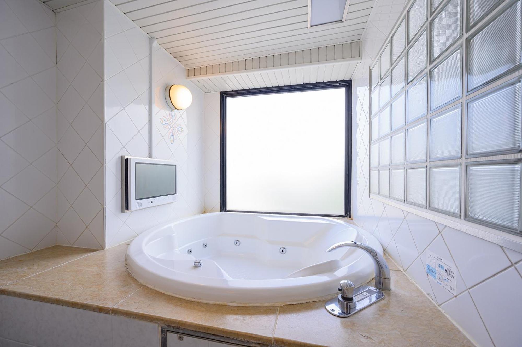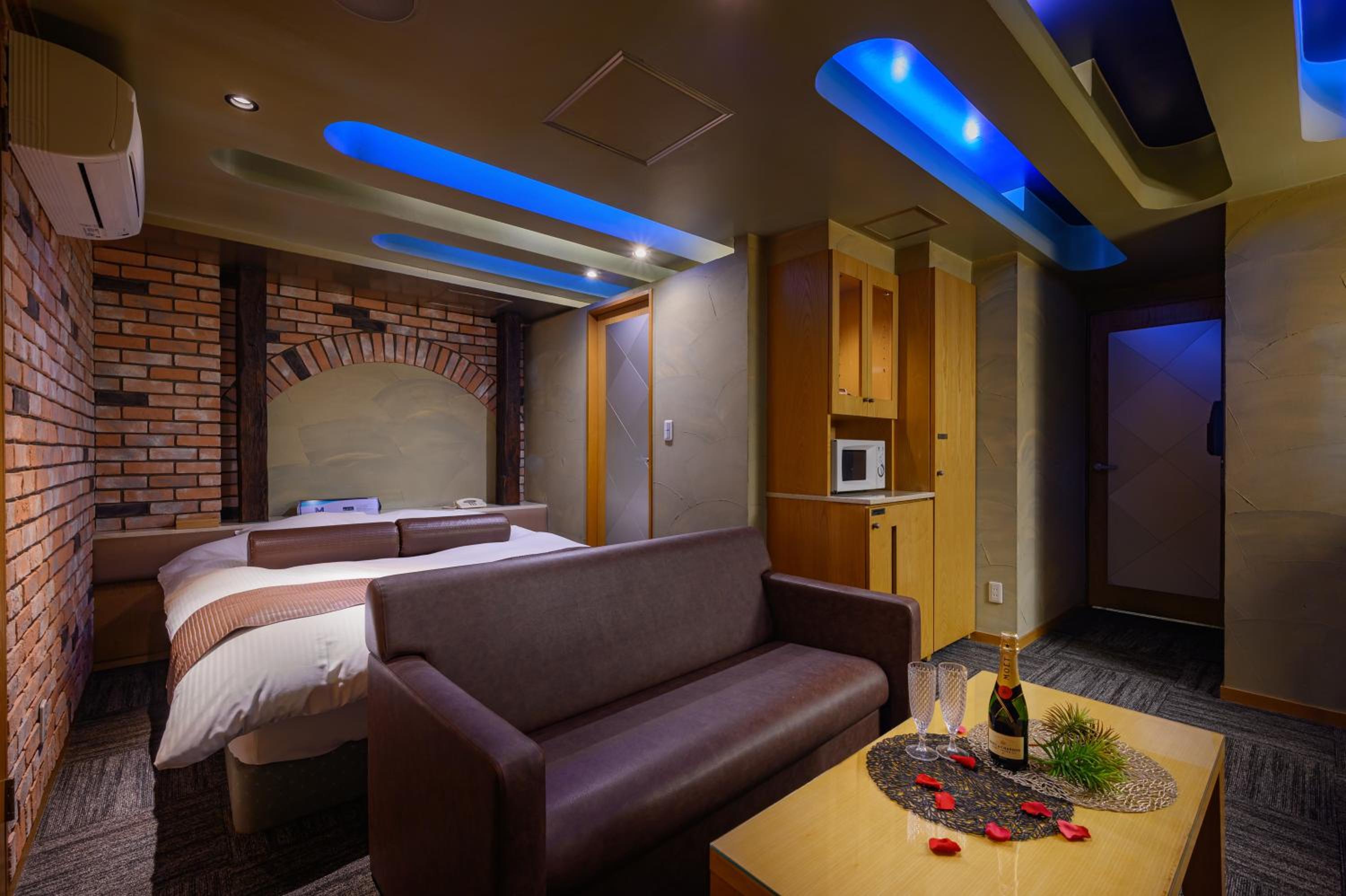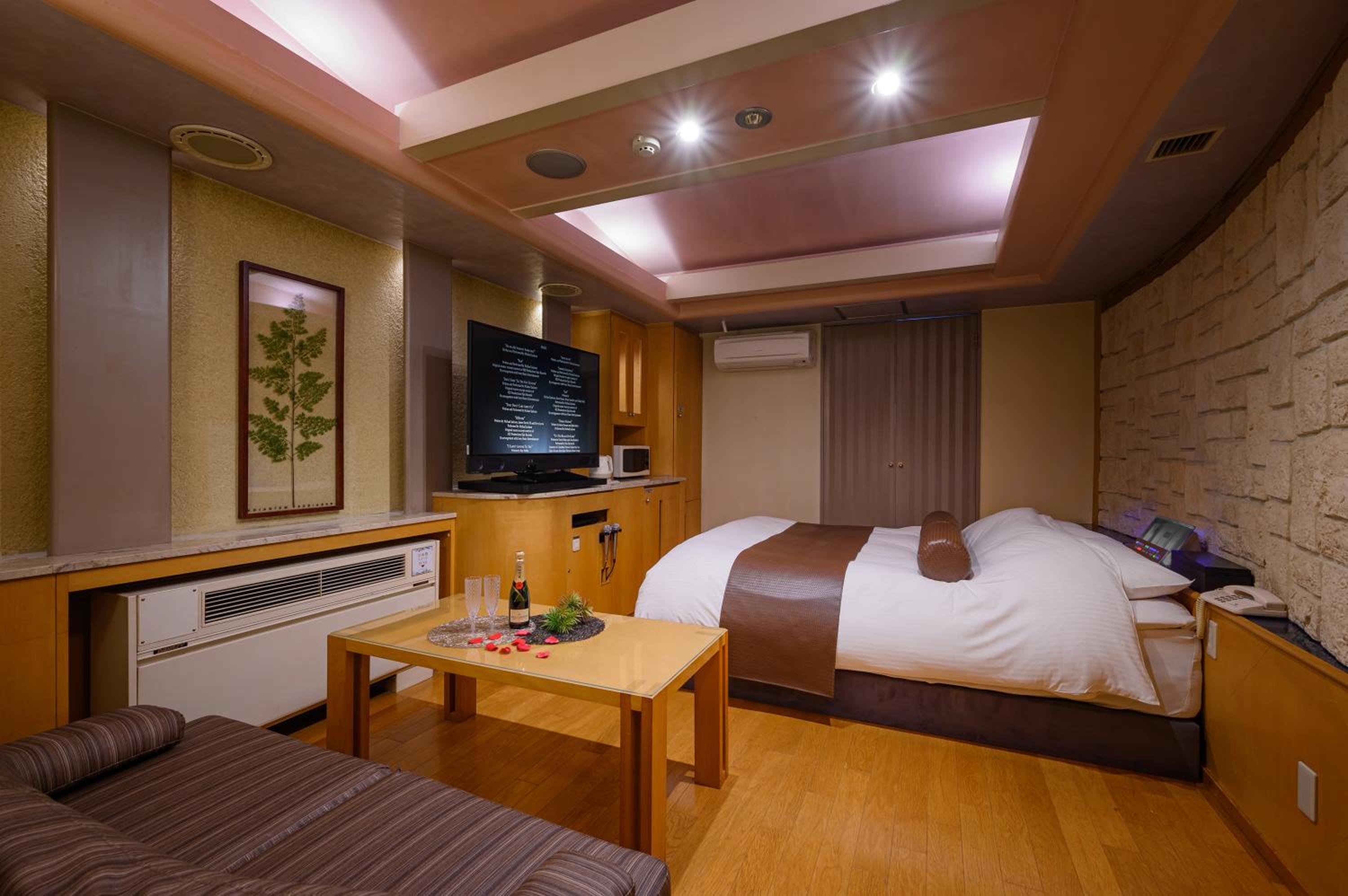 Water Hotel Mw (Love Hotel) in Saitama offers elegant units with modern amenities including air conditioning, flat-screen TV, and hot tubs in the private bathrooms.