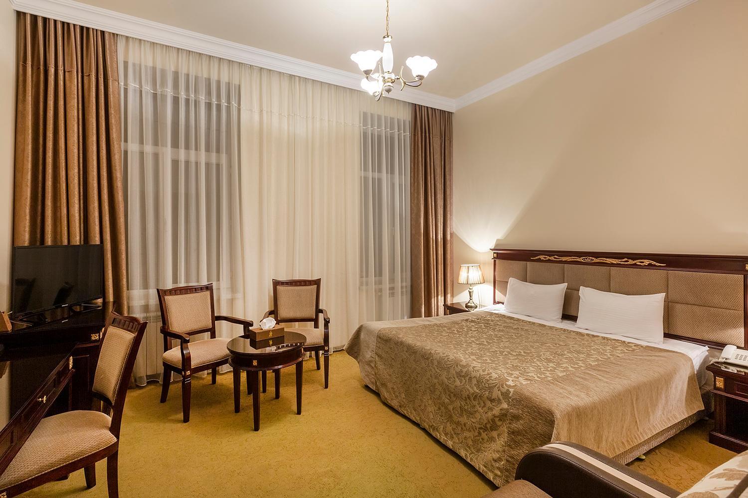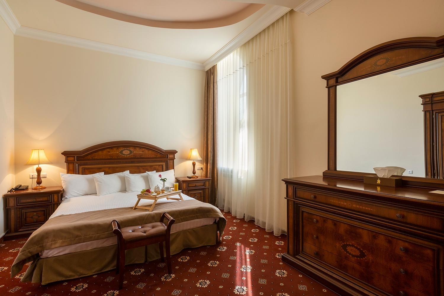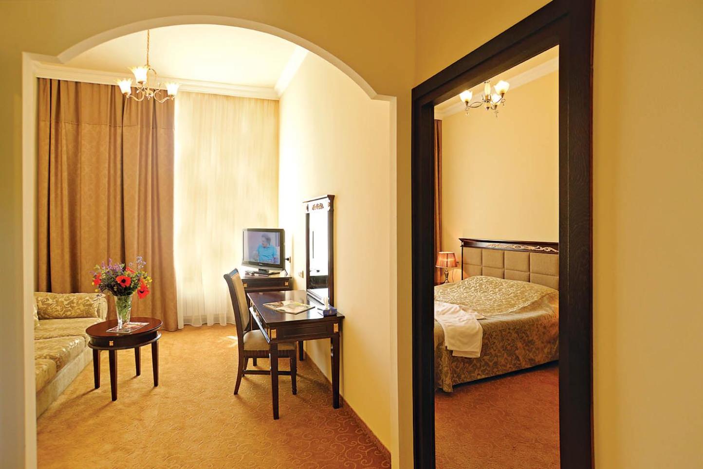 В этом санатории замечательно все! 10 из 10! Очень красивое здание с архитектурными элементами советского ампира с высокими потолками, но с современным ремонтом. Сервис соответствует заявленным 4* на все 100%. У входа вас встретит швейцар, который поможет отнести багаж в ваш номер. На стойке рецепшен очень приятные девушки, вся регистрация занимает несколько минут. Мы приехали в 14-30 и нам сначала предложили пройти в ресторан на обед, а потом завершить регистрацию. В этот же день мы успели на прием к врачу, чтобы со следующего дня с утра начать принимать все процедуры. Лечебное отделение работает каждый день, включая воскресенье. Набор процедур - стандартный для санатория. Врач прописывает процедуры исходя из вашего состояния здоровья, но назначает максимальное их количество. Большинство процедур (за исключением различных массажей) входят в стоимость проживания. Также в стоимость входит первоначальный общий анализ крови с дополнительными показателями и кардиограмма (и нет этого обязательного требования санаторной карты, как в российских санаториях!). Весь персонал исключительно вежливый и профессиональный, все хорошо знают русский язык. Отдельная большая благодарность медсестре кабинета минеральных ванн Меладе за супер профессионализм и супер отзывчивость! Сотрудники санатория постараются выполнить все ваши пожелания, при бронировании стандартного номера я указала пожелание о наличии балкона и нам дали номер с большим красивым балконом, хотя здесь очень мало стандартных номеров с балконами. Каждый день в санатории можно встретить менеджера, которая не просто поприветствует вас, а обязательно остановиться спросить, все ли устраивает, комфортная ли температура в номере, удобна ли кровать и проч., есть ли какие то у вас просьбы и пожелания. Мы были в начале октября, в это время здесь в дневное время тепло, а ночи уже холодные, поэтому в санатории на ночь включали отопление, при чем температуру отопления регулировали в зависимости от температуры воздуха на улице.